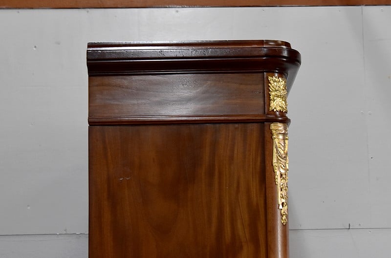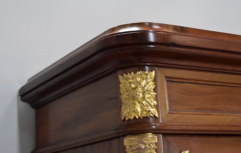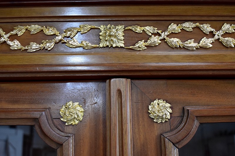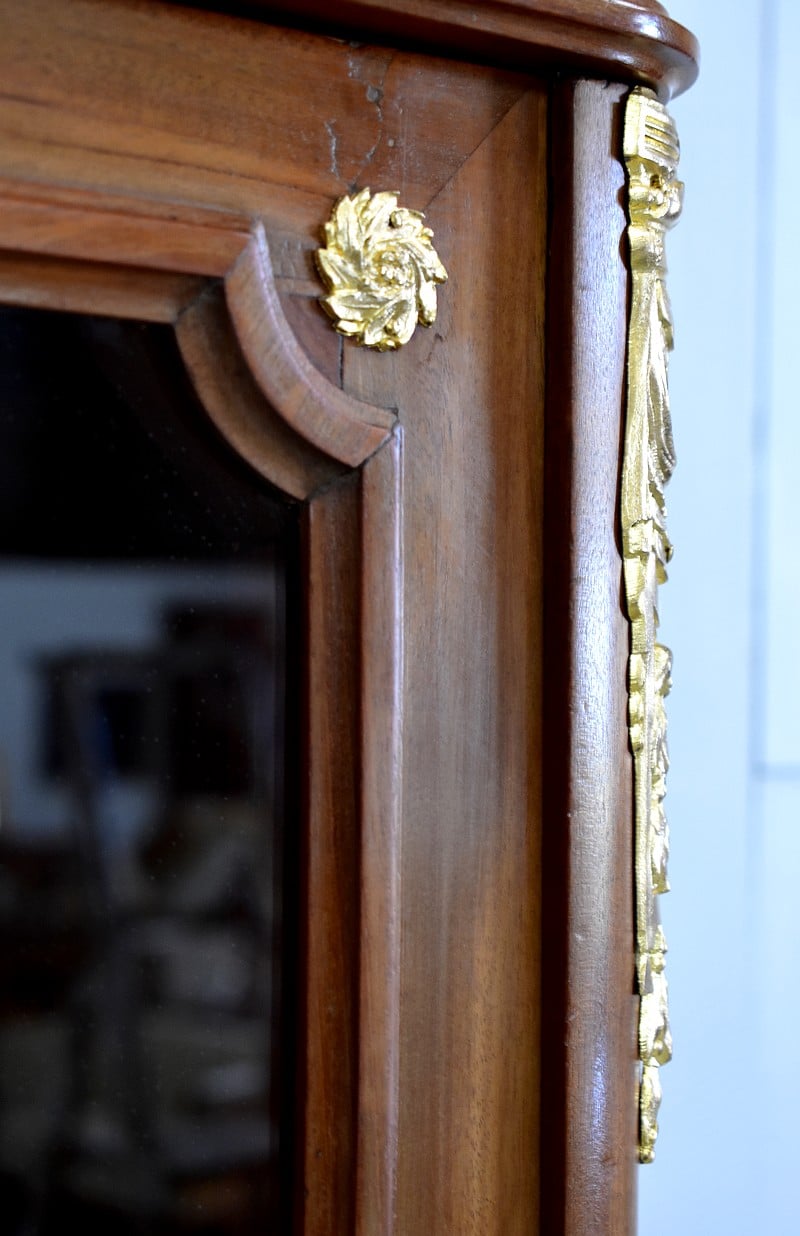Sa corniche est ornée de moulures et les montants arrondis sont décorés de bronzes.