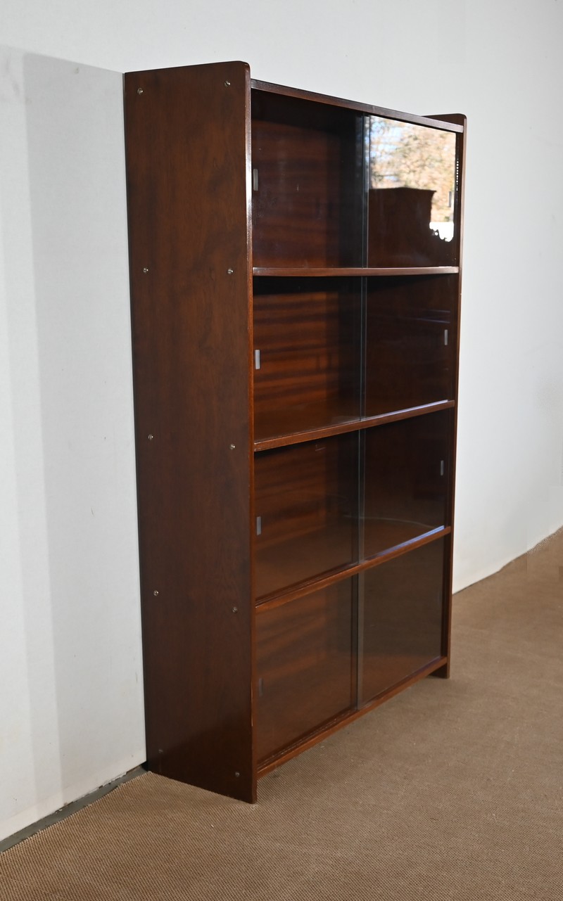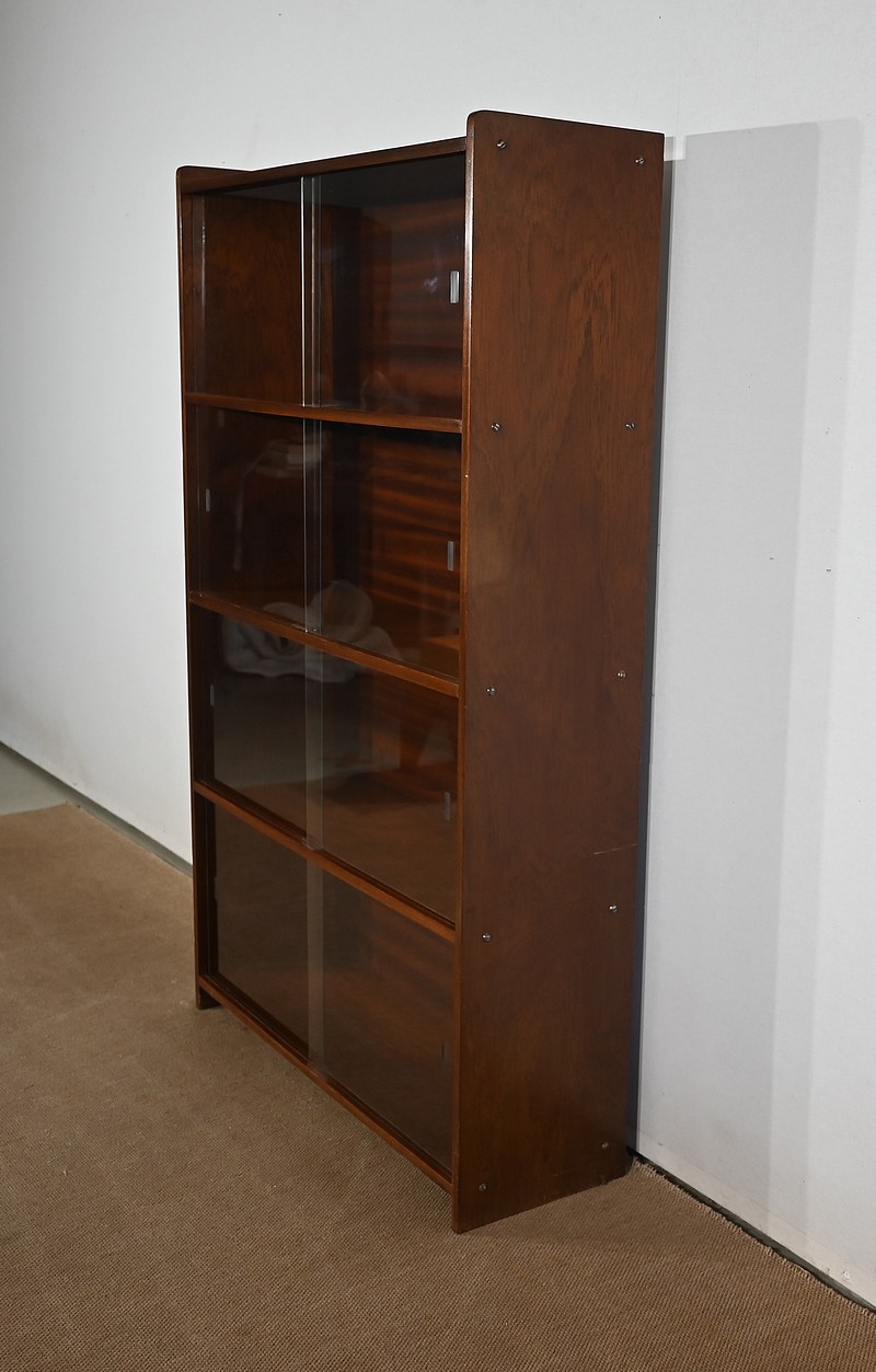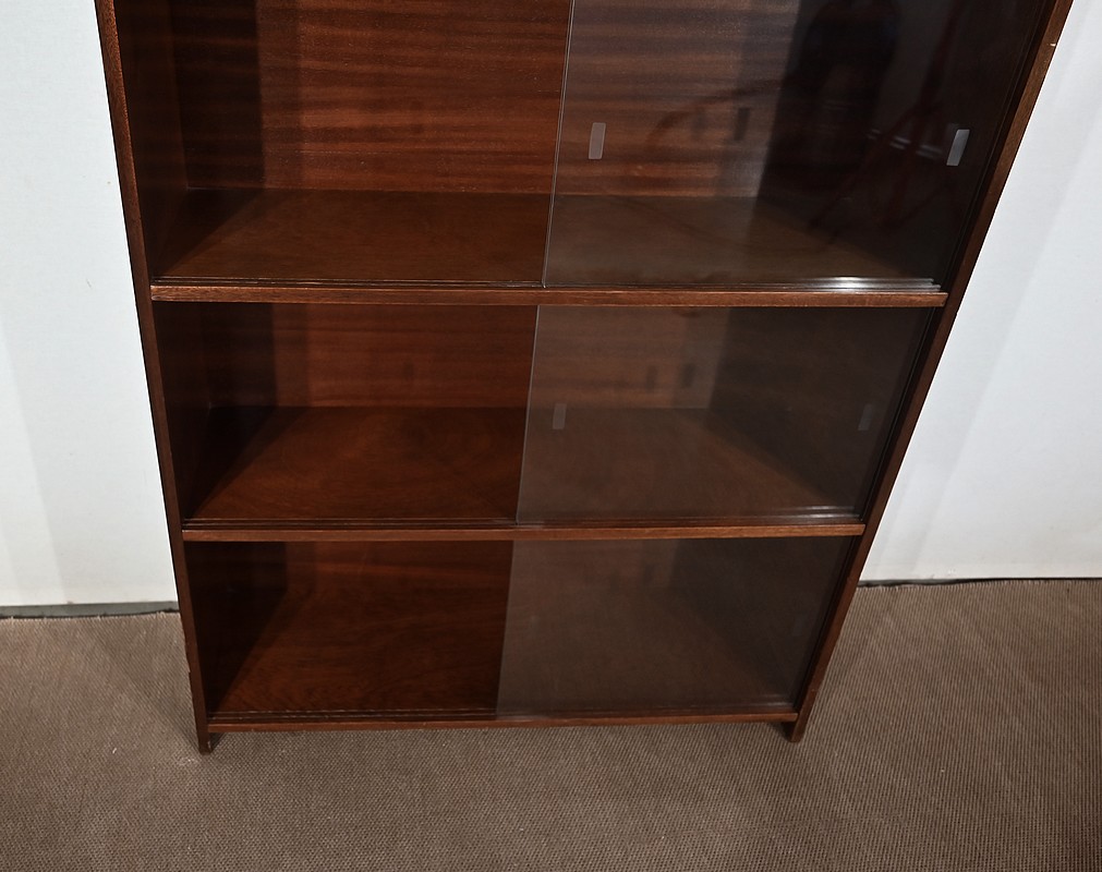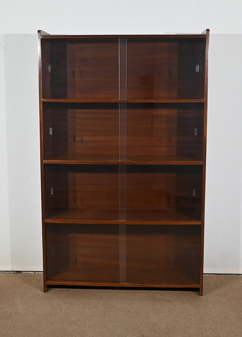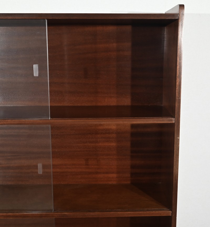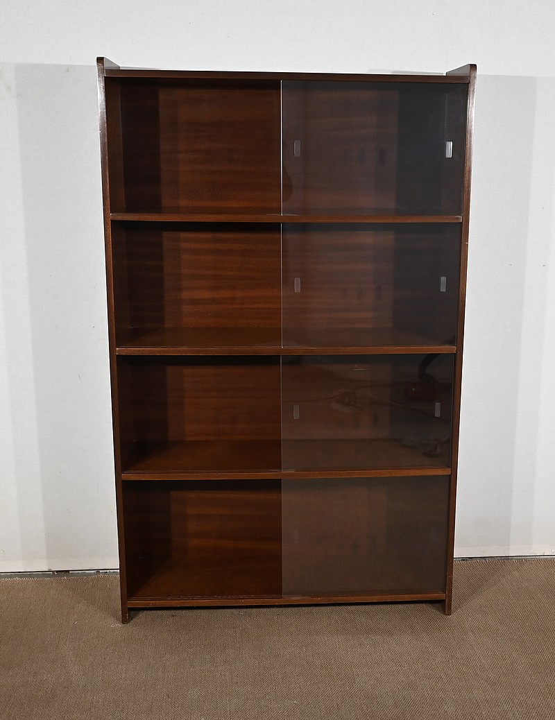 Crée par le designer Français Didier Rozaffy, cette bibliothèque vitrée, en placage d’acajou, comporte quatre étagères. Ce meuble vintage possède une ligne sobre et des espaces de rangement conséquents. Les vitres coulissantes, toutes présentes, comportent chacune une encoche gravée.