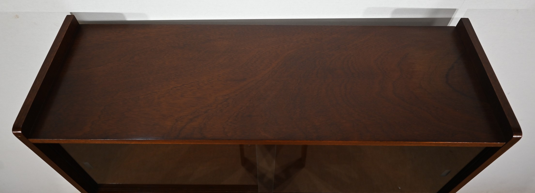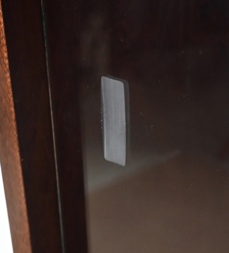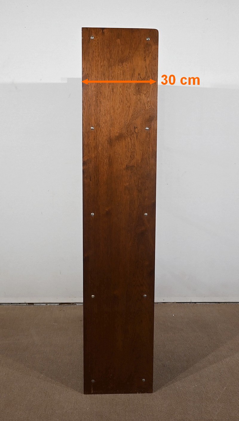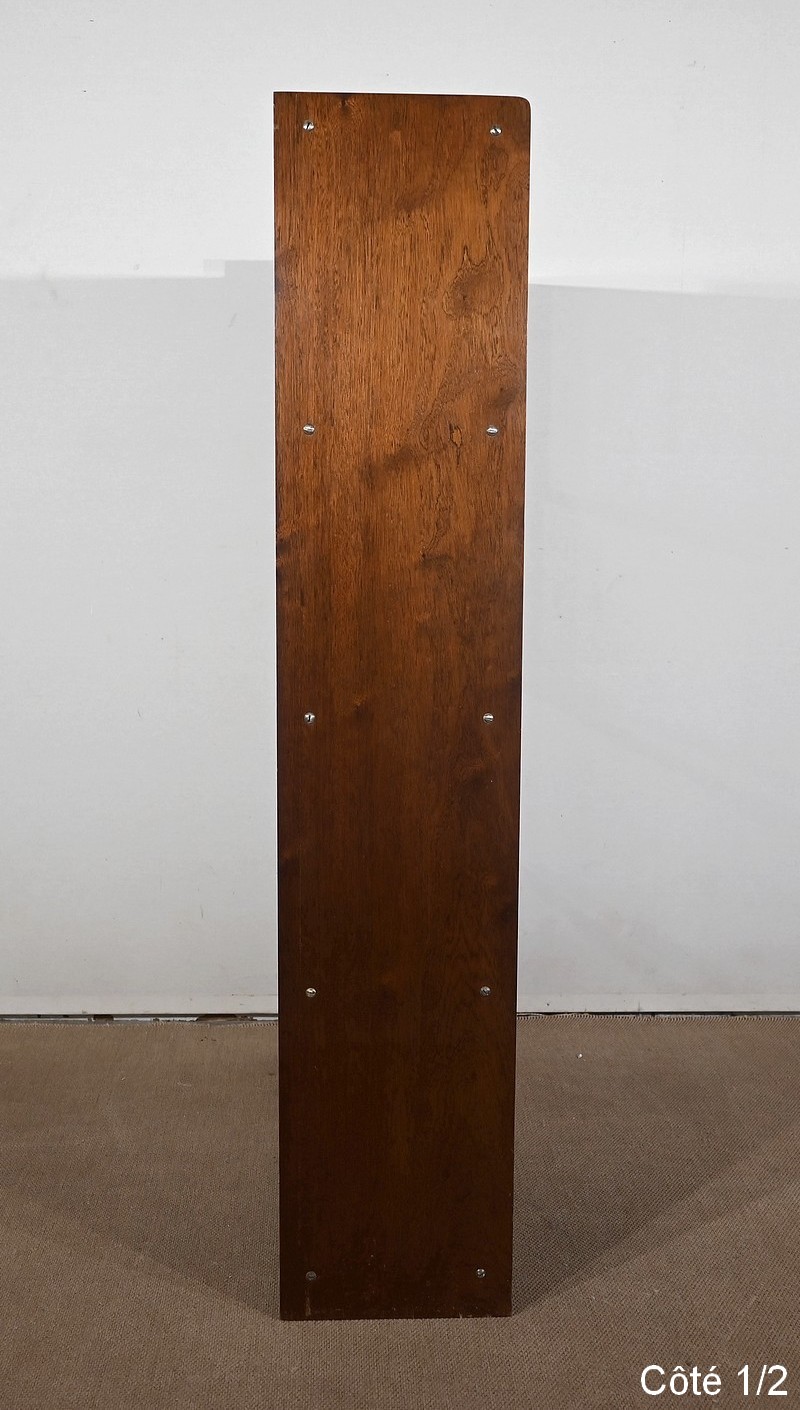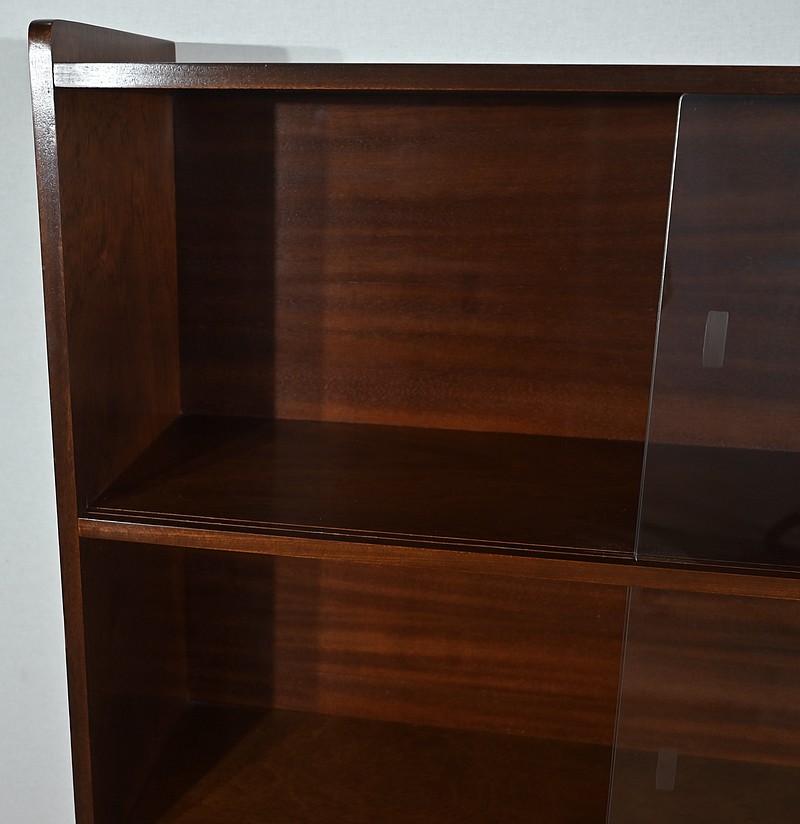 Crée par le designer Français Didier Rozaffy, cette bibliothèque vitrée, en placage d’acajou, comporte quatre étagères. Ce meuble vintage possède une ligne sobre et des espaces de rangement conséquents. Les vitres coulissantes, toutes présentes, comportent chacune une encoche gravée.