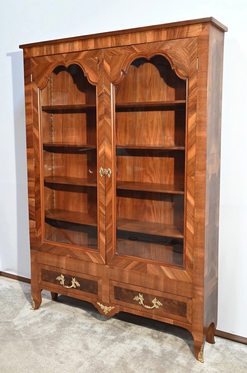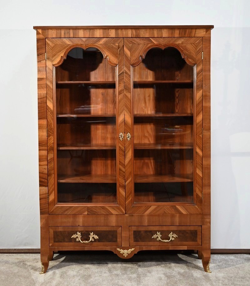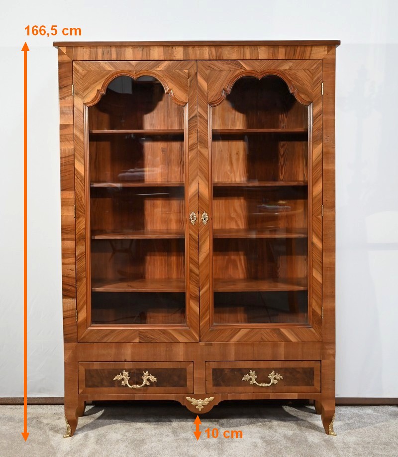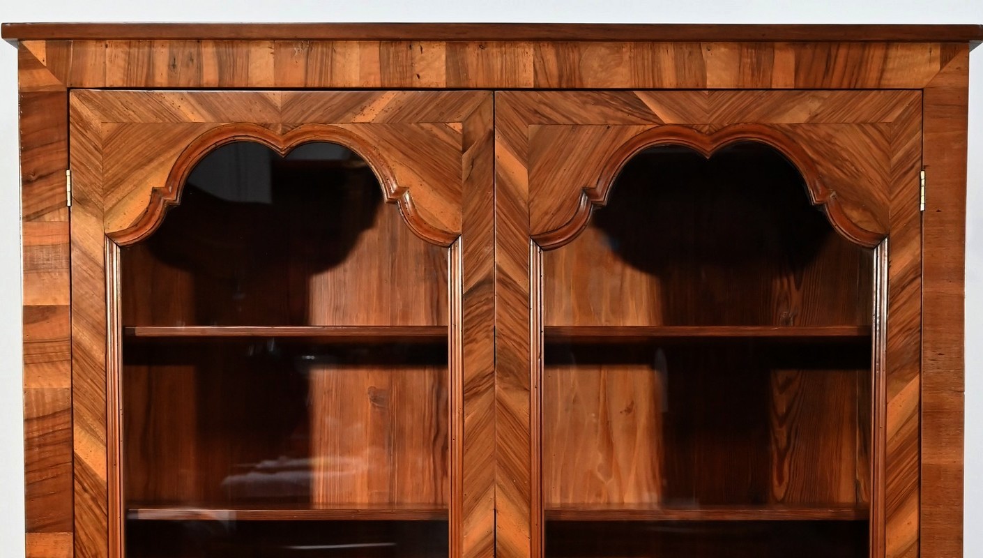 Le haut de ces portes, à découpe asymétrique, est mouluré à doucine en intérieur. L’entourage, en placage de noyer disposé en travers, est à raccord donnant une légère fantaisie au meuble.