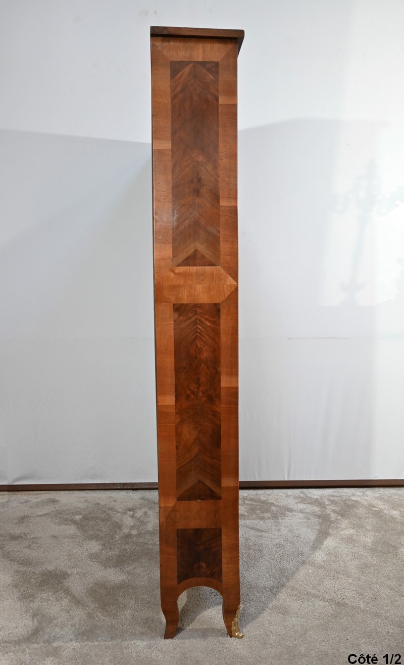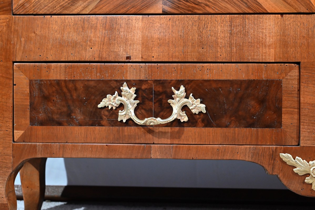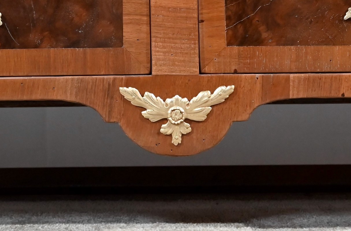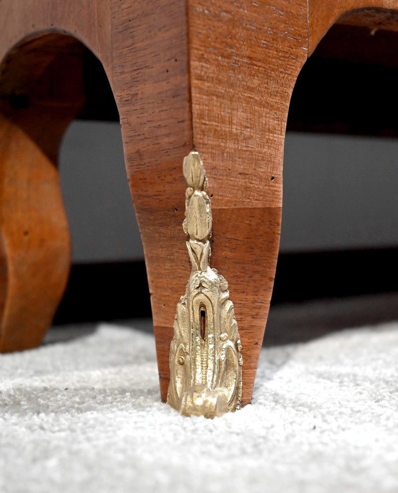 Les montants sont plaqués en noyer clair, ils se terminent par de petits pieds-de-biche avec sabots bronze à l’avant.