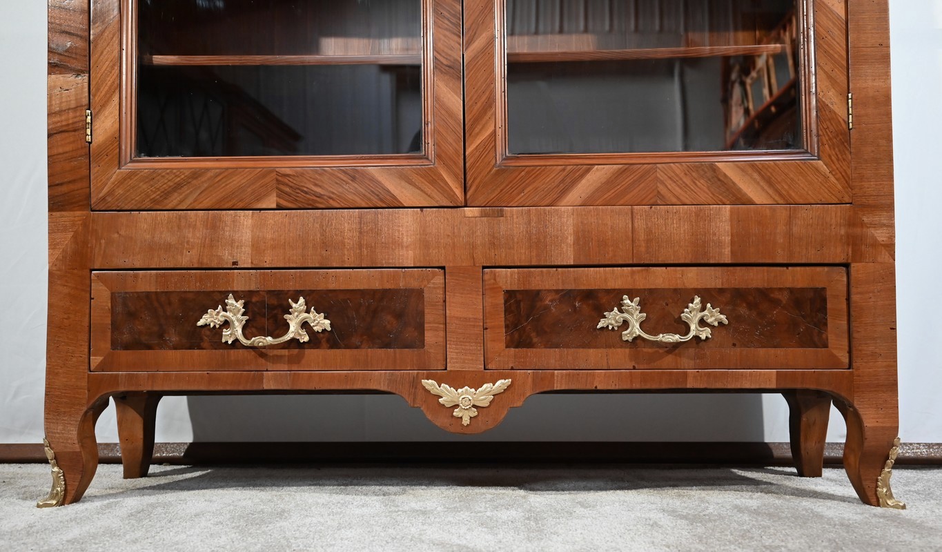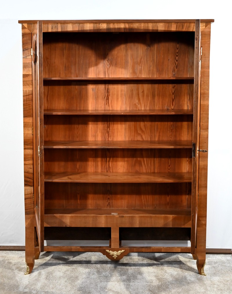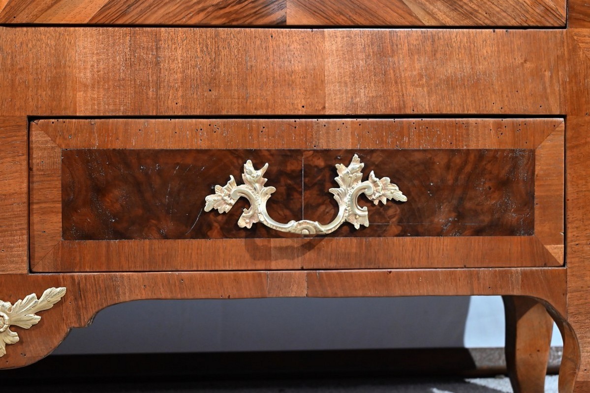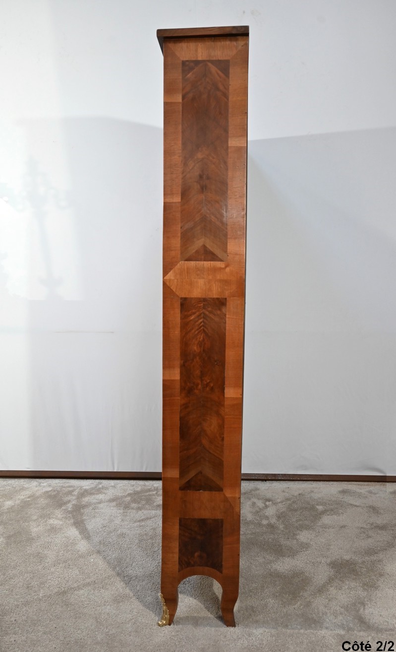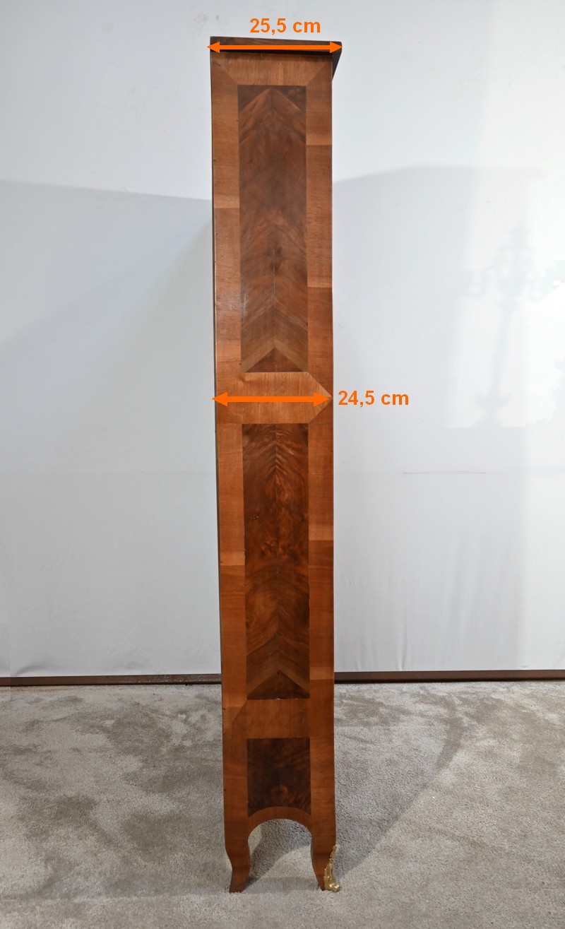 Les montants sont plaqués en noyer clair, ils se terminent par de petits pieds-de-biche avec sabots bronze à l’avant.