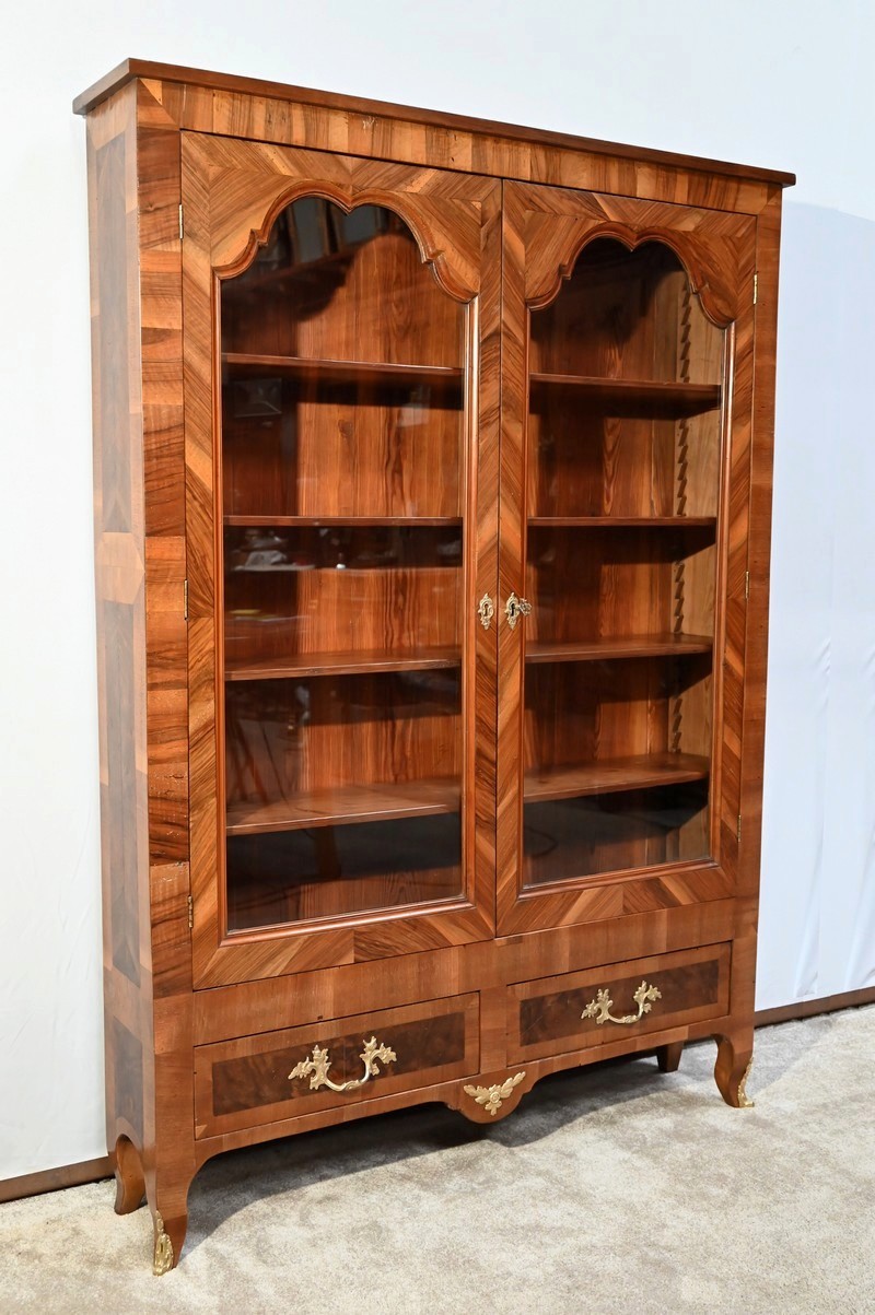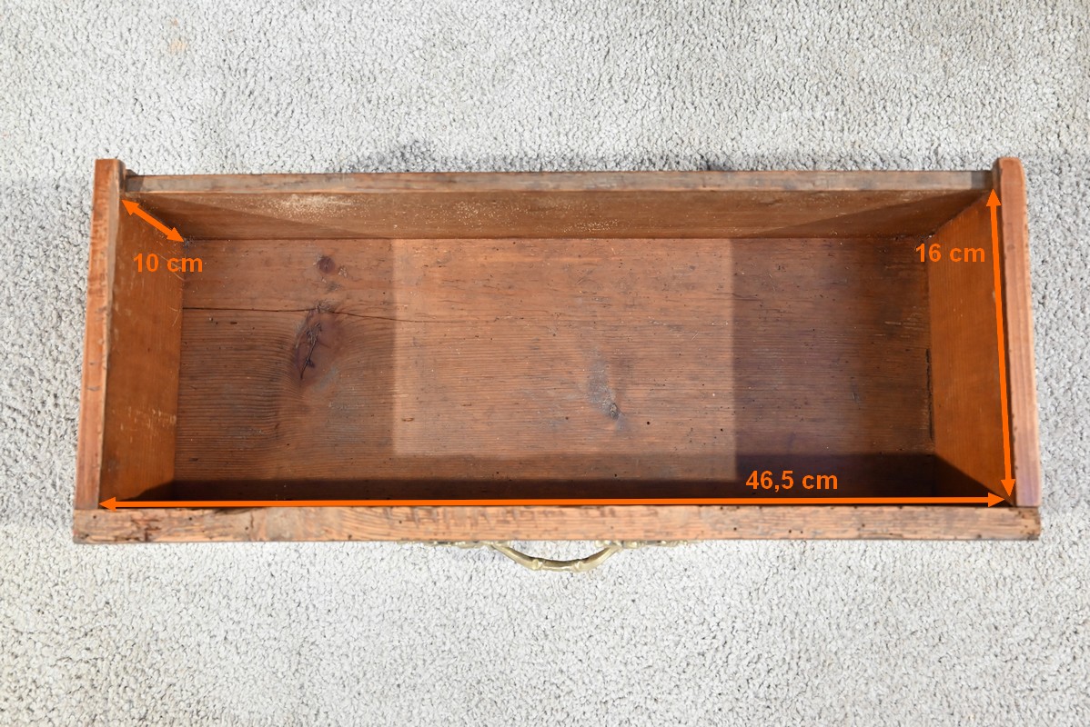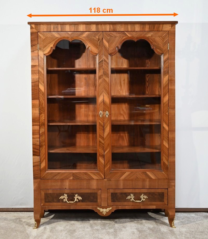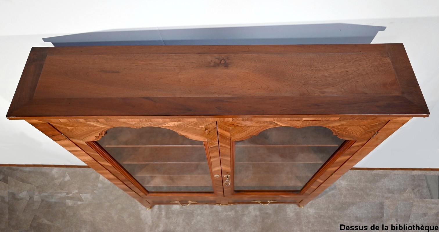 Les montants sont plaqués en noyer clair, ils se terminent par de petits pieds-de-biche avec sabots bronze à l’avant.
