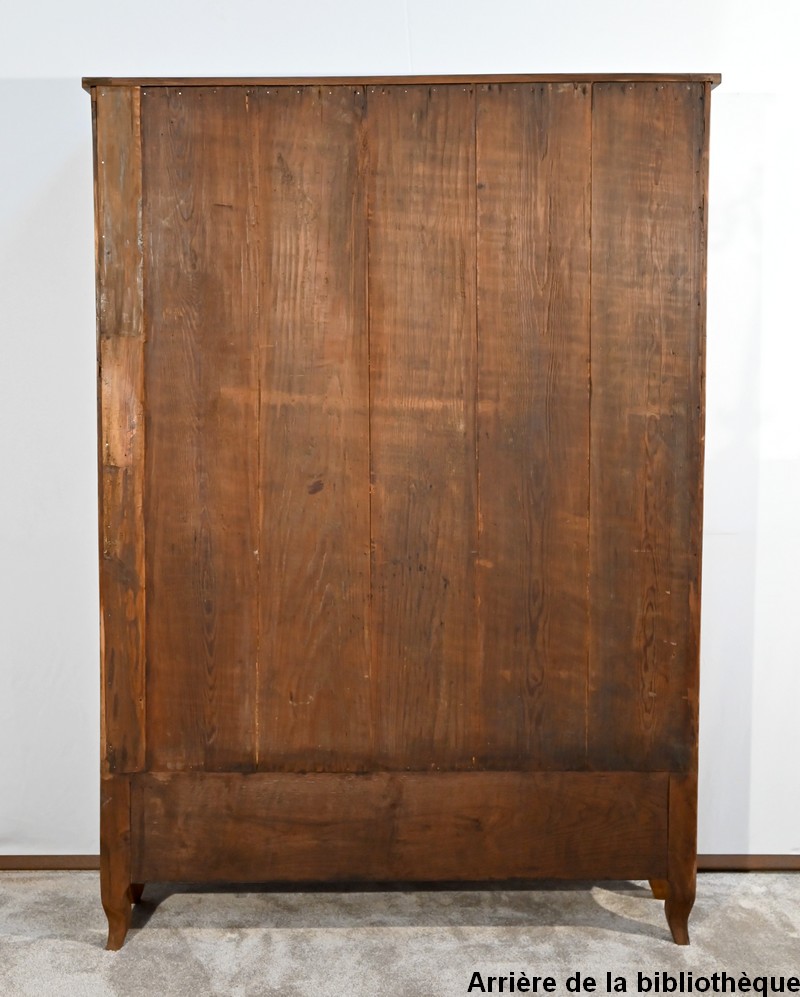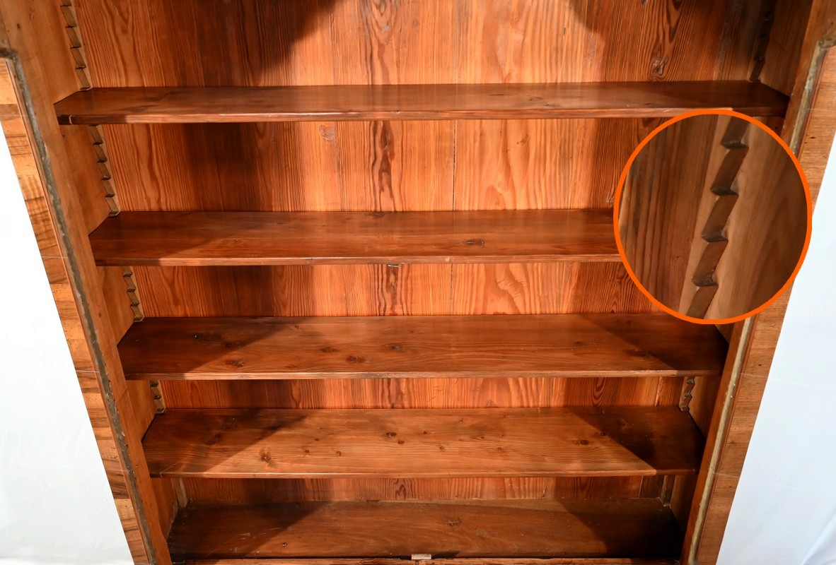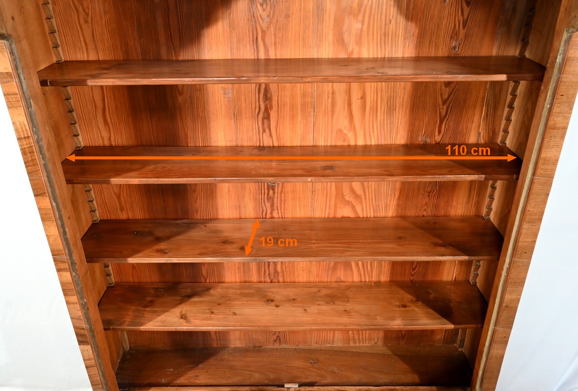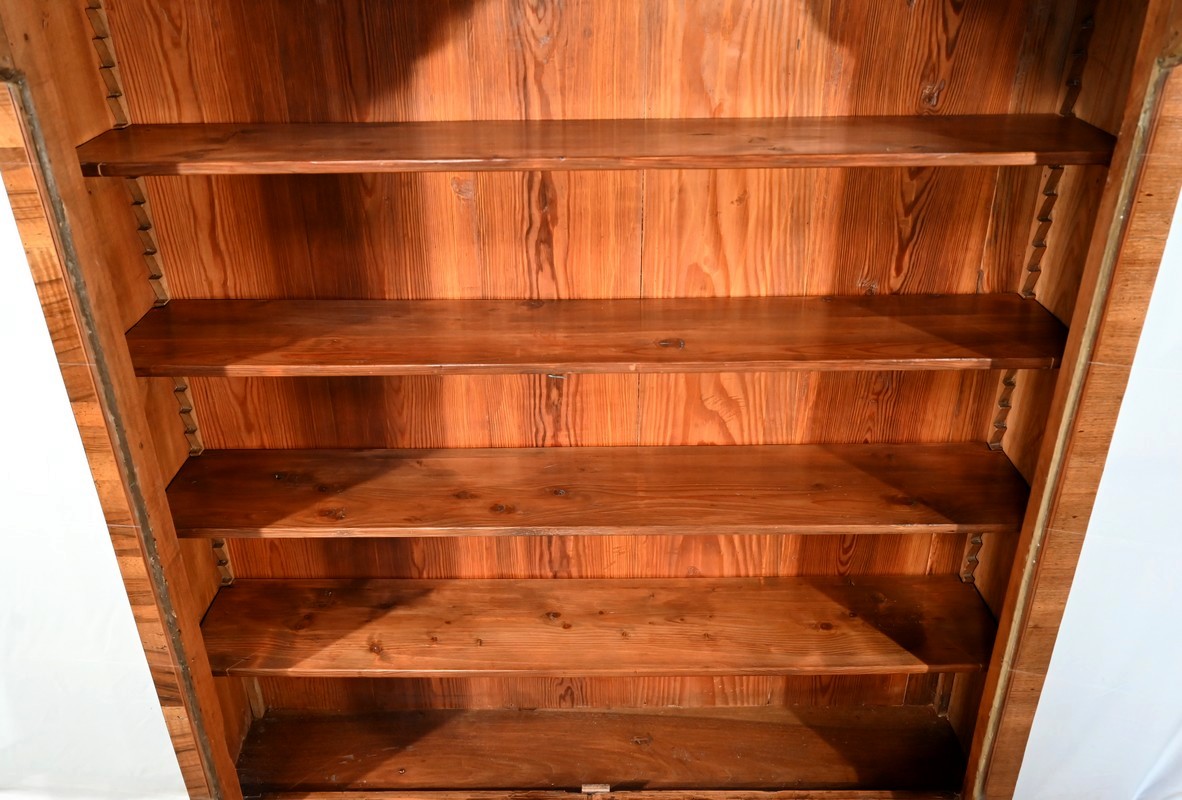 Cette étroite et sobre bibliothèque séduira par sa faible profondeur et sa personnalité due à la disposition de ses placages.