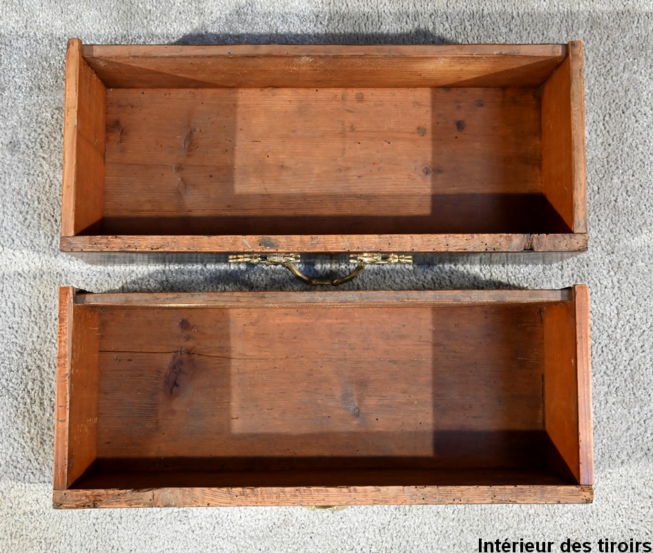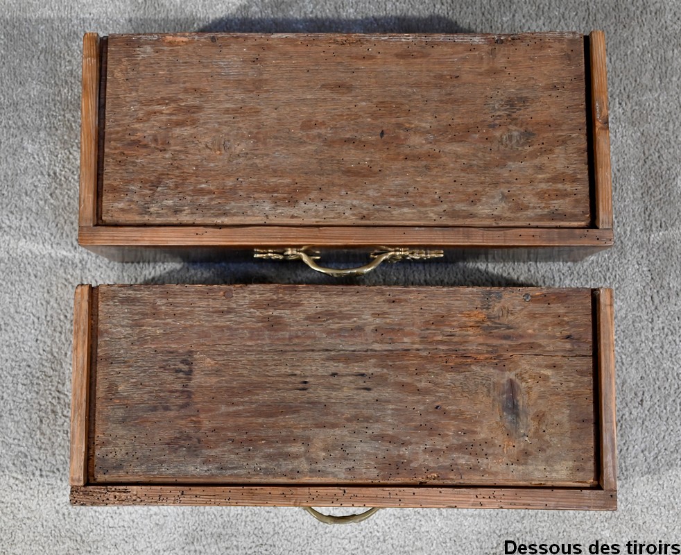 La partie basse comporte deux tiroirs, à poignées bronze, dont la façade est plaquée en thuya avec entourage en noyer.