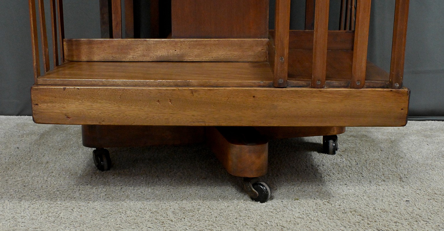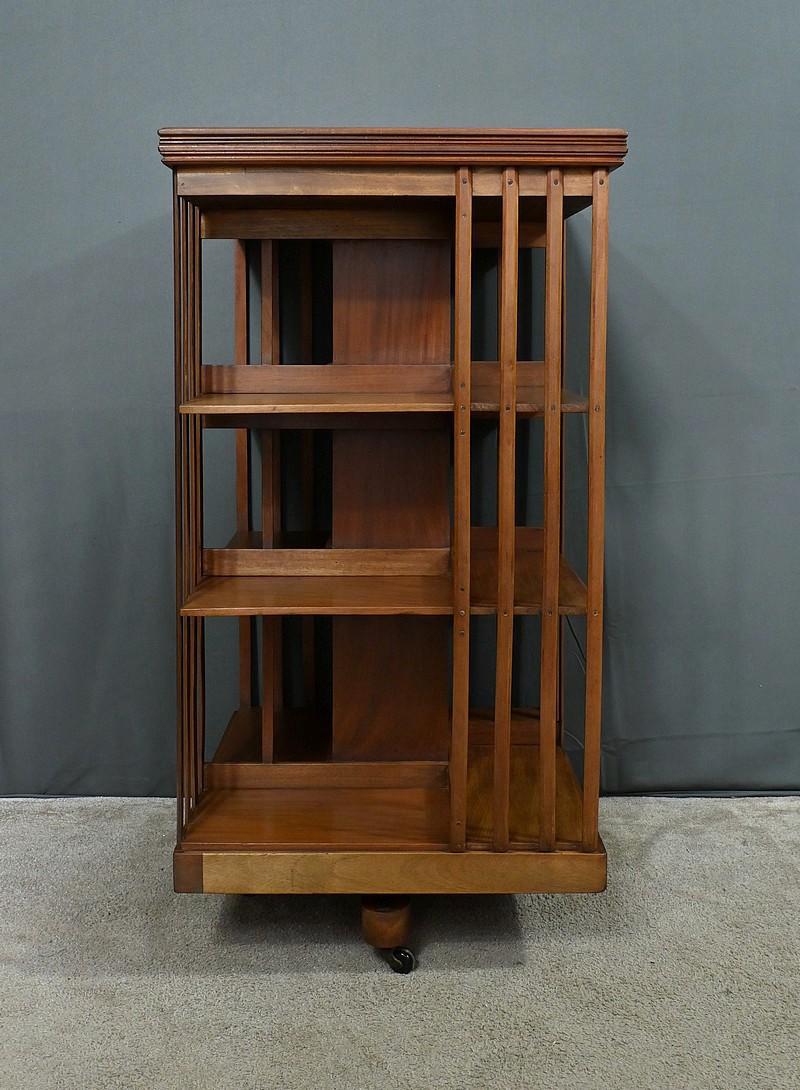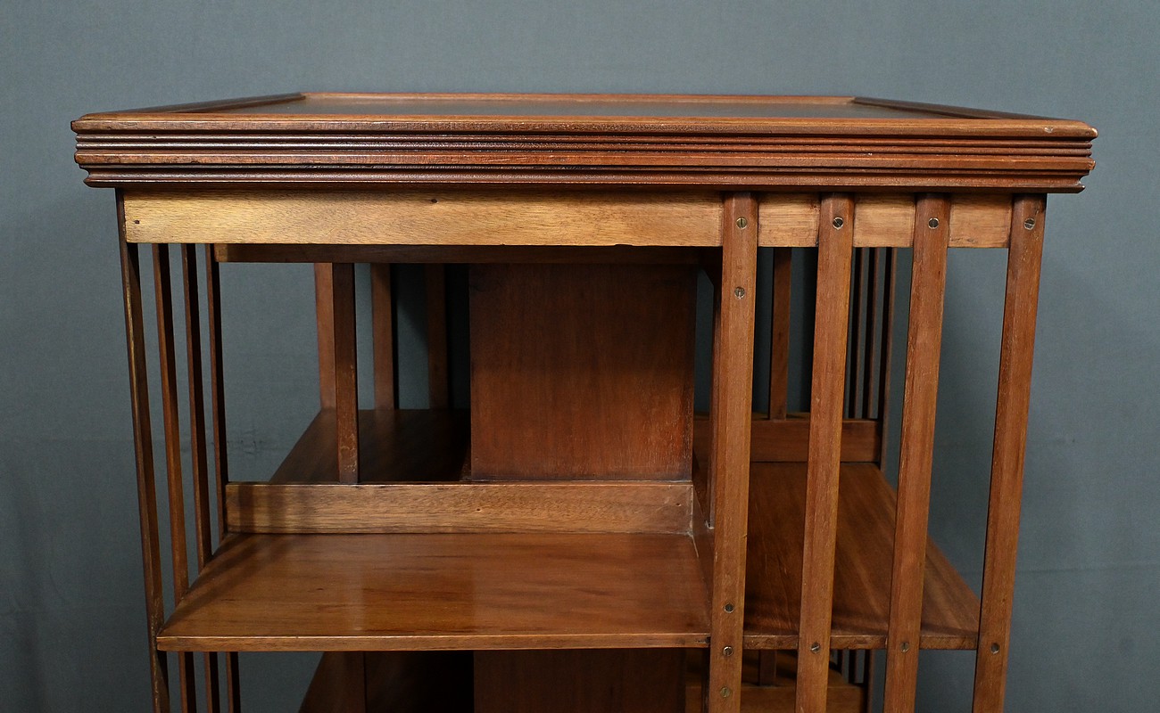 Grande bibliothèque pivotante en acajou, incarnant le charme et la sophistication du mobilier classique britannique. Avec son design ajouré et ses trois niveaux de rangement, elle permet d’organiser vos ouvrages tout en conservant une esthétique raffinée. Son piétement à roulettes assure une mobilité aisée, offrant une flexibilité idéale pour ajuster son emplacement selon vos besoins. Cette bibliothèque est bien plus qu’un simple meuble : c’est un véritable élément décoratif et fonctionnel, parfait pour enrichir un bureau, une salle de lecture ou un salon avec une touche d’élégance et d’authenticité.