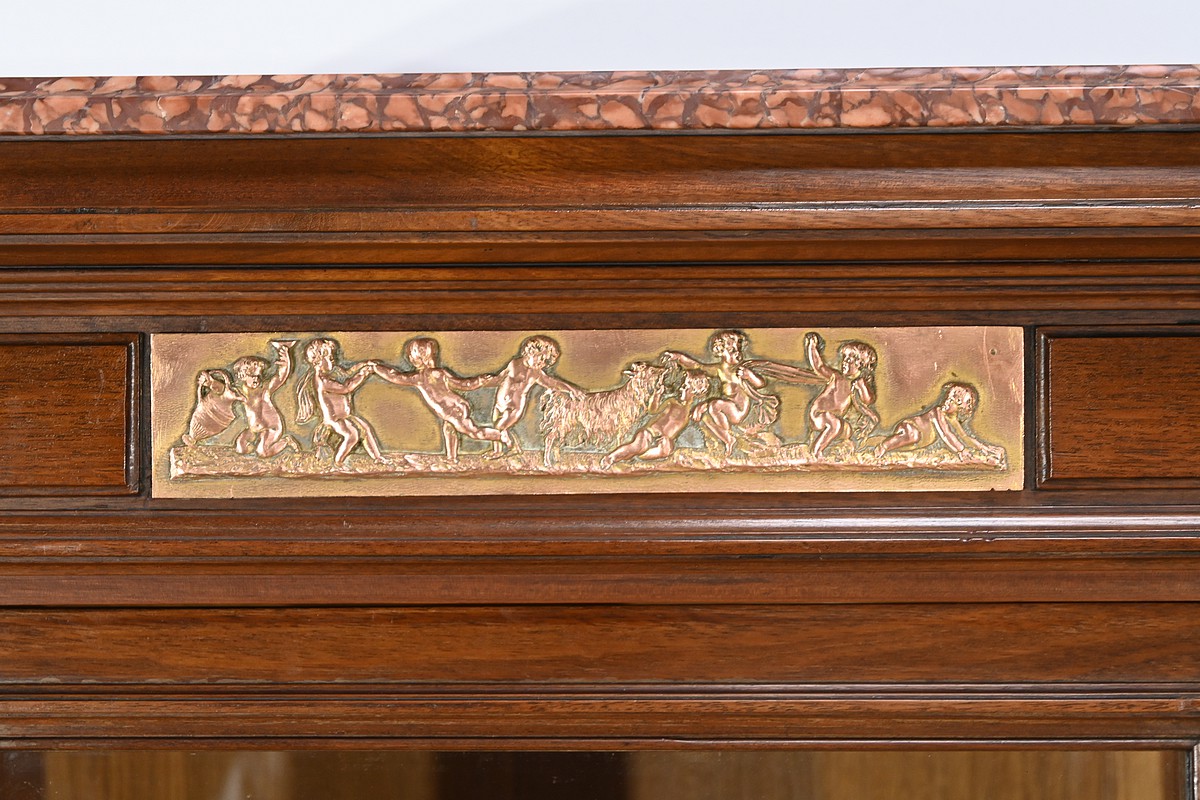 Le fronton est orné d’une scène de putti, apportant une note artistique et délicate à l’ensemble.