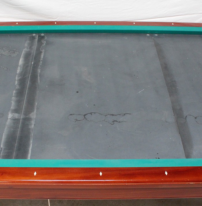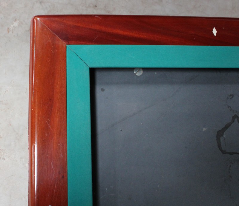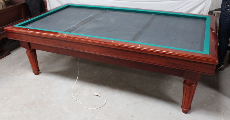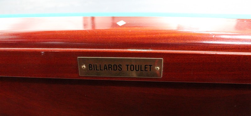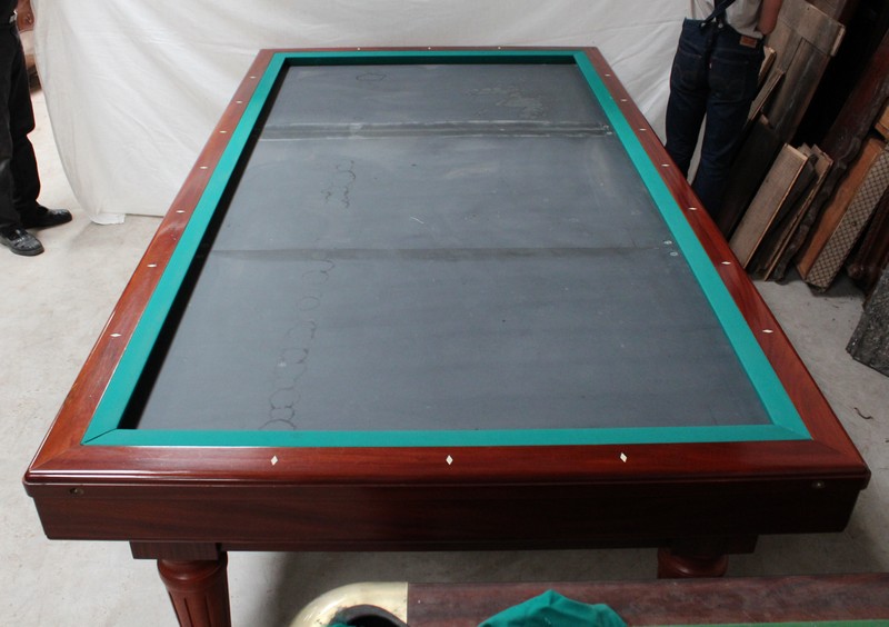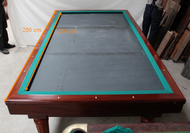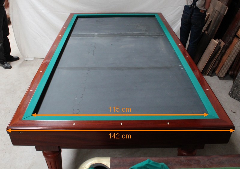 Ce Billard en Acajou Massif se compose d’un grand Plateau couvert d’une Plaque d’Ardoise en Trois Parties. Son encadrement en Acajou est un gage de Qualité dans les billards Français, ce dernier est par ailleurs agrémenté d’Incrustations de Nacre.