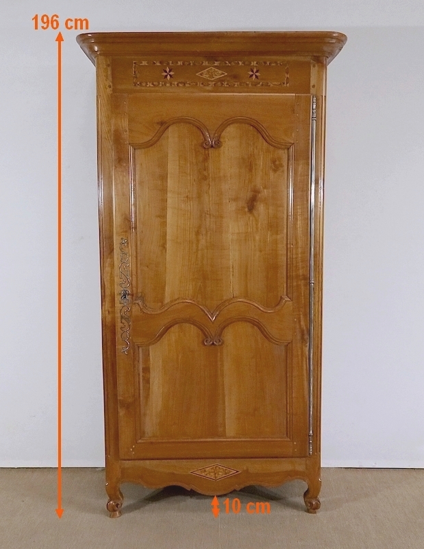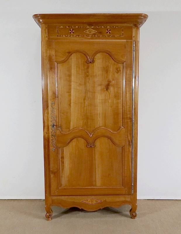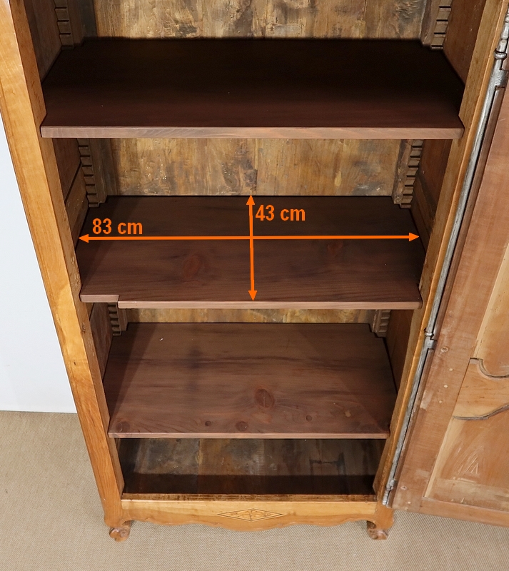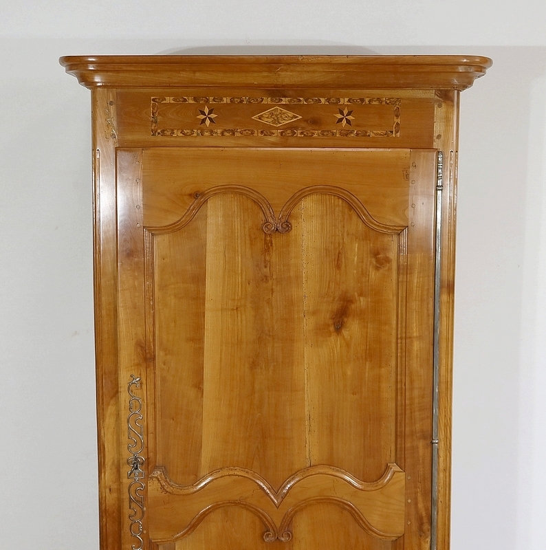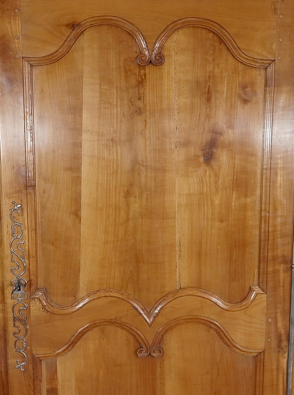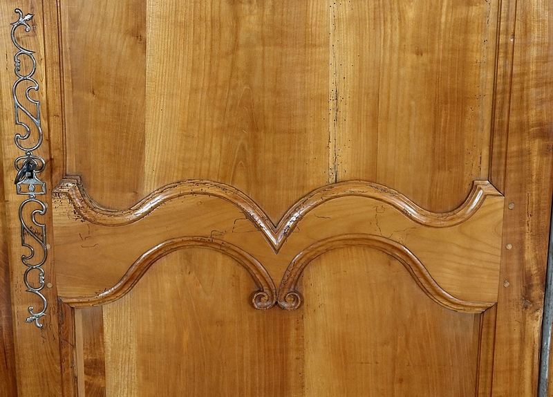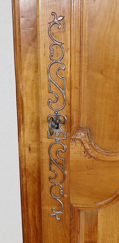 Bonnetière bicentenaire de la vallée de la Loire en Merisier blond, ouvrant par une porte sculptée découpée et moulurée d’un charmant motif asymétrique se terminant par des volutes. Aux deux tiers de la porte nous retrouvons une traverse dans le même esprit que la moulure en partie haute. Une belle entrée d’origine en fer découpé accompagne une serrure et une clé d’origine également en parfait état de fonctionnement. A droite, les gonds en fer d’origine possèdent 3 attaches.