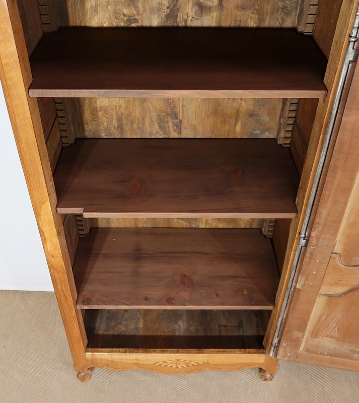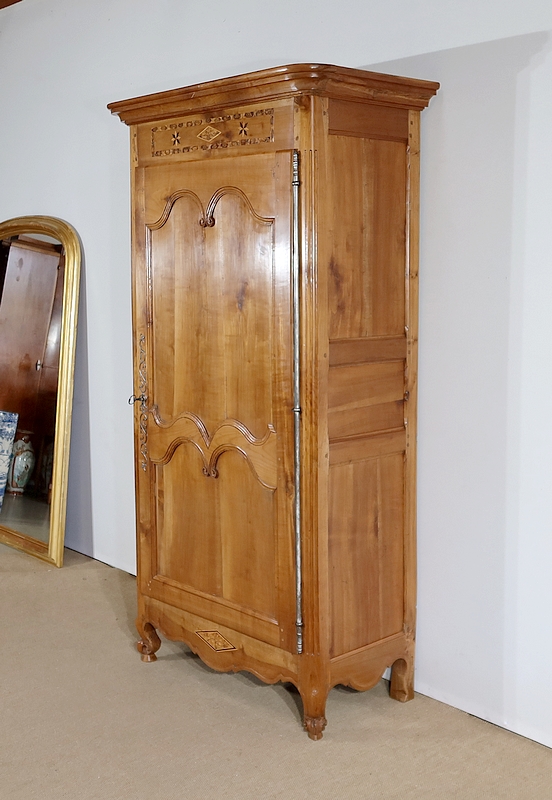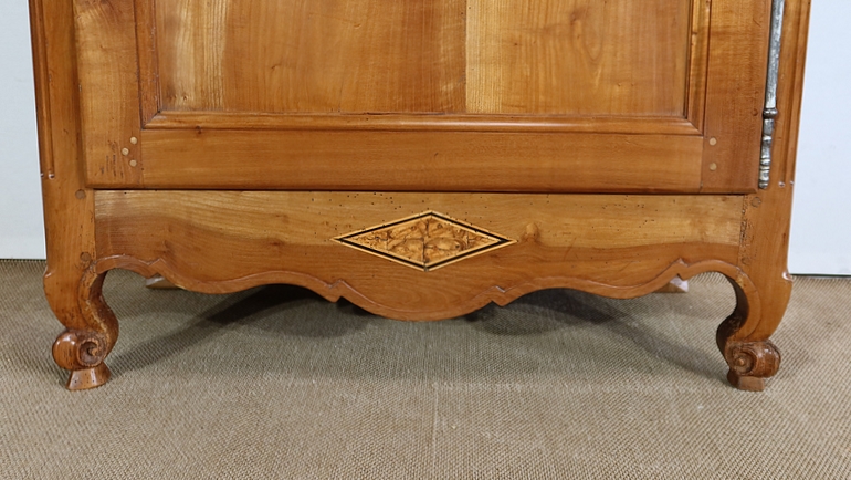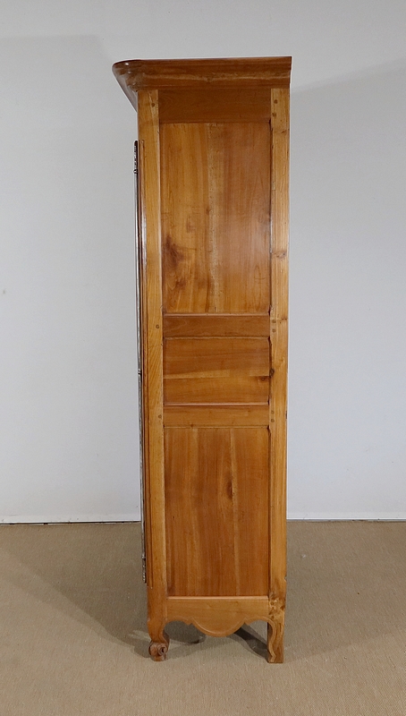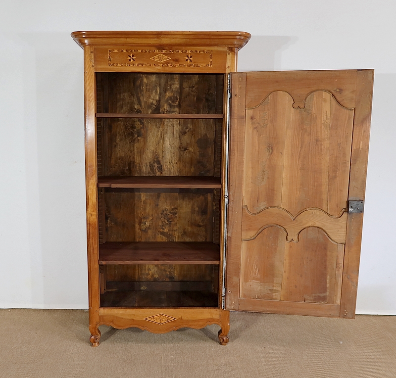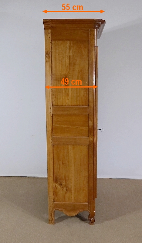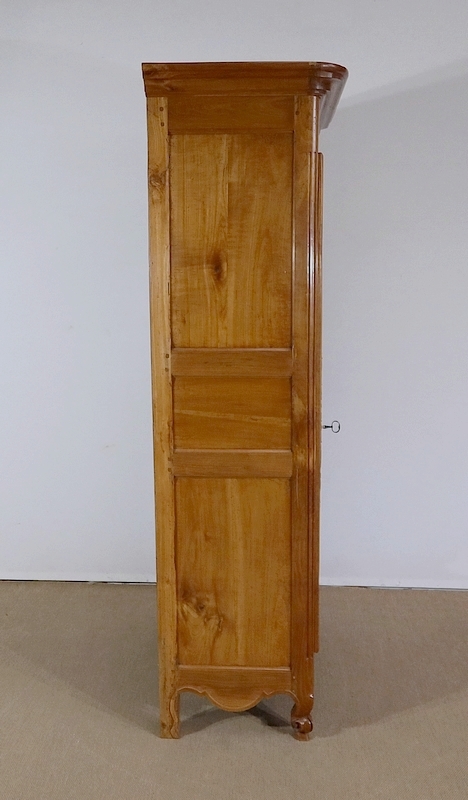 Bonnetière bicentenaire de la vallée de la Loire en Merisier blond, ouvrant par une porte sculptée découpée et moulurée d’un charmant motif asymétrique se terminant par des volutes. Aux deux tiers de la porte nous retrouvons une traverse dans le même esprit que la moulure en partie haute. Une belle entrée d’origine en fer découpé accompagne une serrure et une clé d’origine également en parfait état de fonctionnement. A droite, les gonds en fer d’origine possèdent 3 attaches.