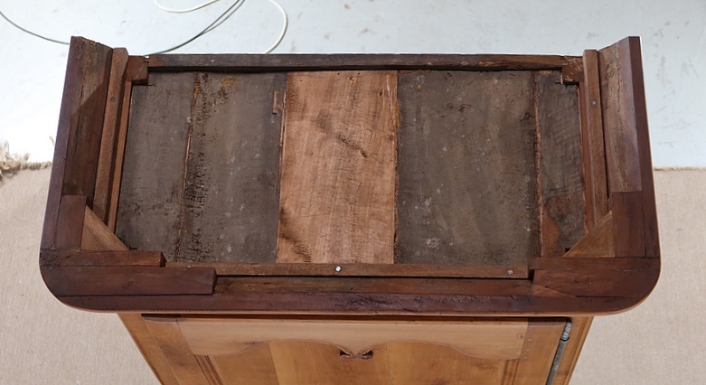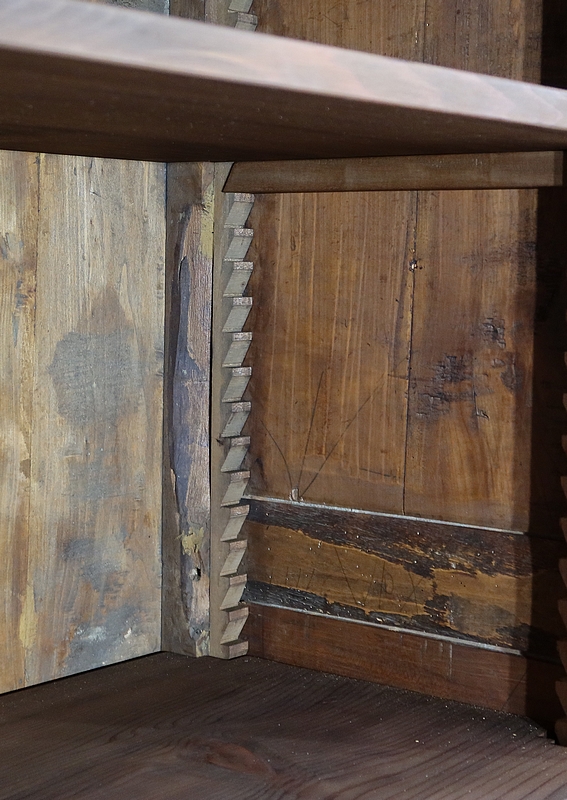 L‘intérieur de cette charmante bonnetière est composé de 4 étagères refaites en bois massif sur tasseaux et grosses crémaillères.