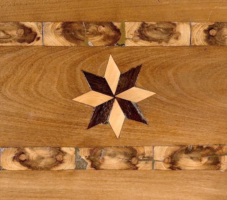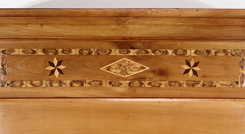 Cette bonnetière se fera remarquée par ses traverses marquetées. La traverse haute est décorée d’un rectangle composé d’éléments de cœur de Buis. Au centre, un losange mélangeant bois clair et bois foncé est entouré d’étoiles des vents. La traverse basse quant à elle reprend la même composition.