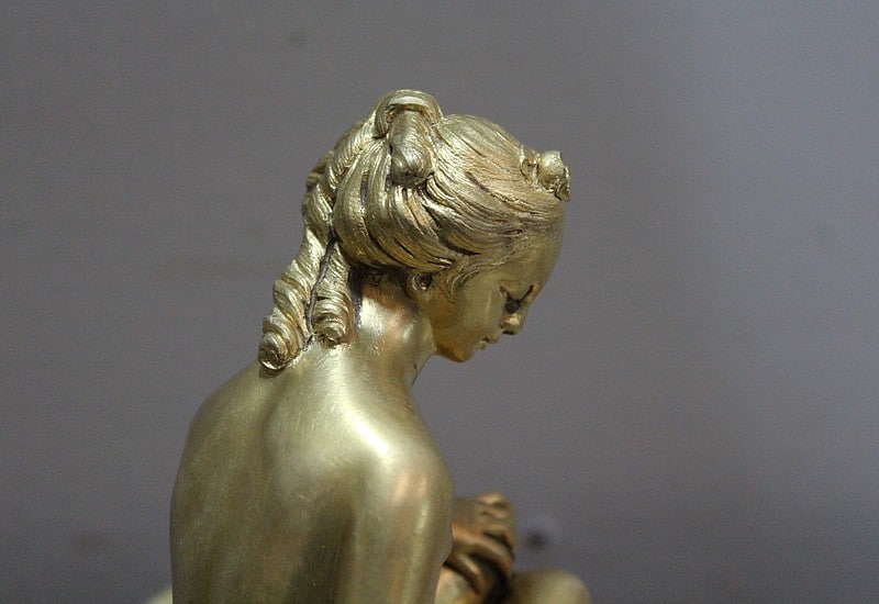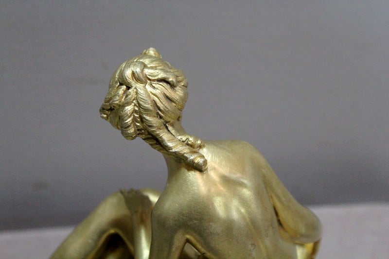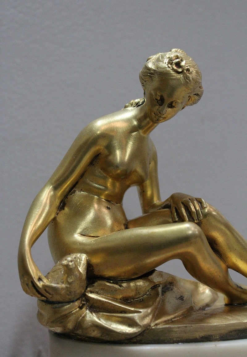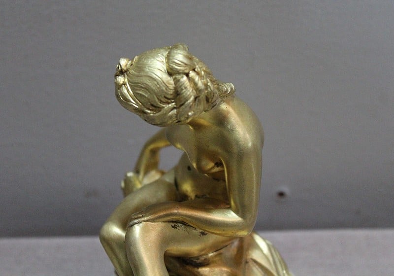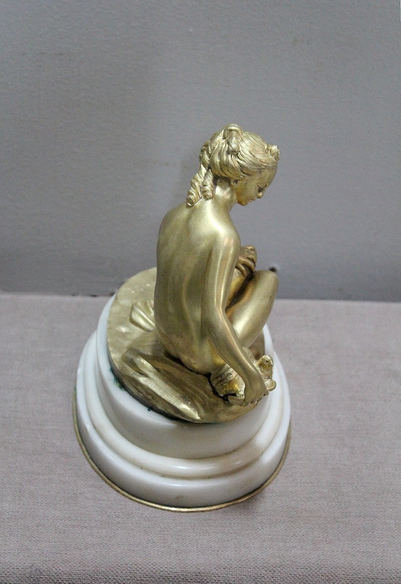 Sujet en bronze doré et patiné d’après Étienne Maurice Falconnet, représentant une baigneuse assise sur un linge et tenant près d’elle une colombe.