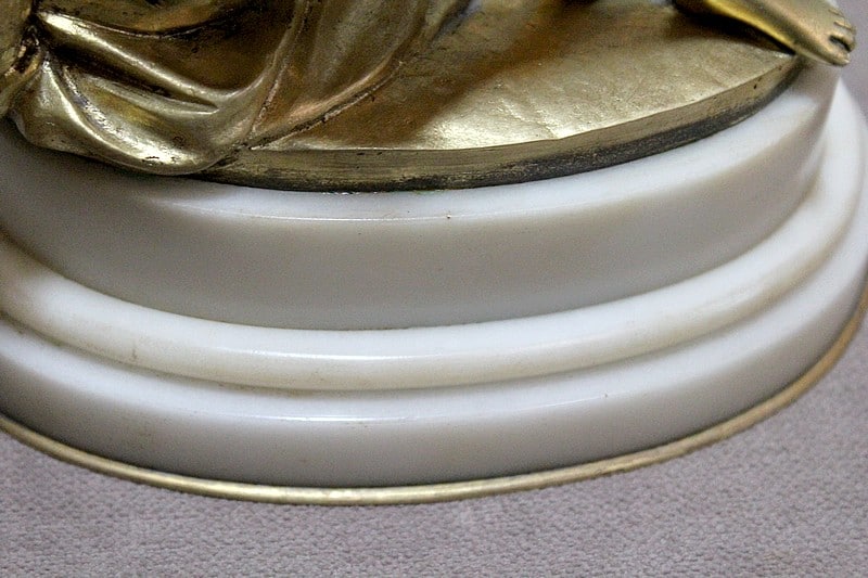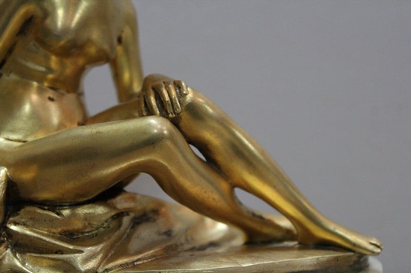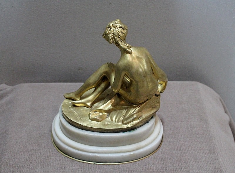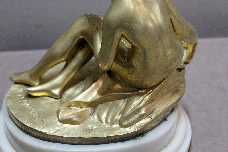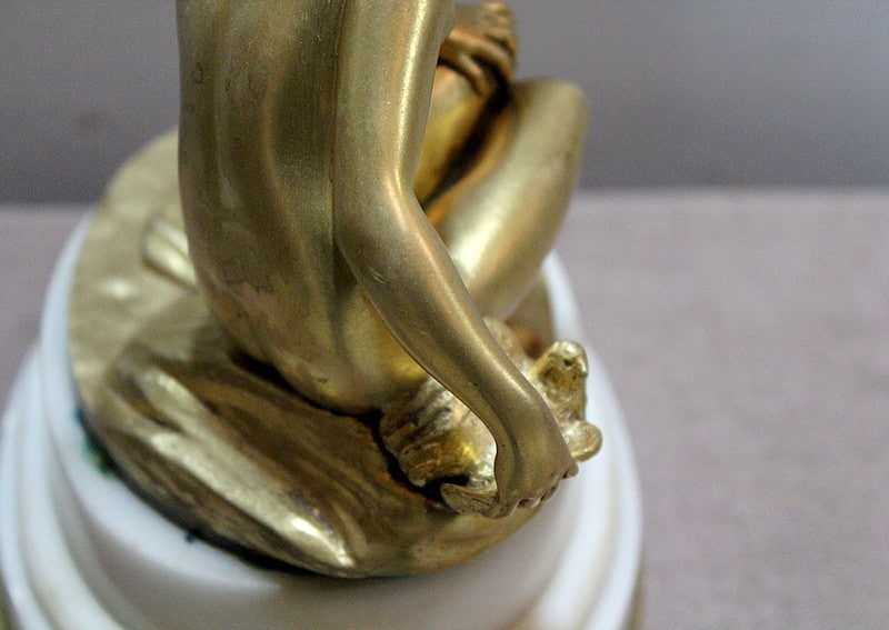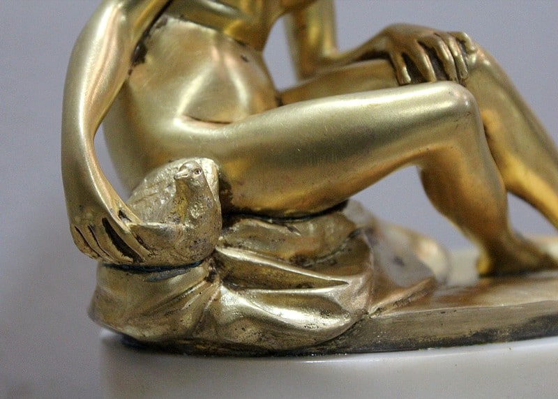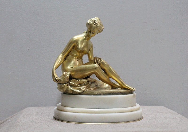 Sujet en bronze doré et patiné d’après Étienne Maurice Falconnet, représentant une baigneuse assise sur un linge et tenant près d’elle une colombe.