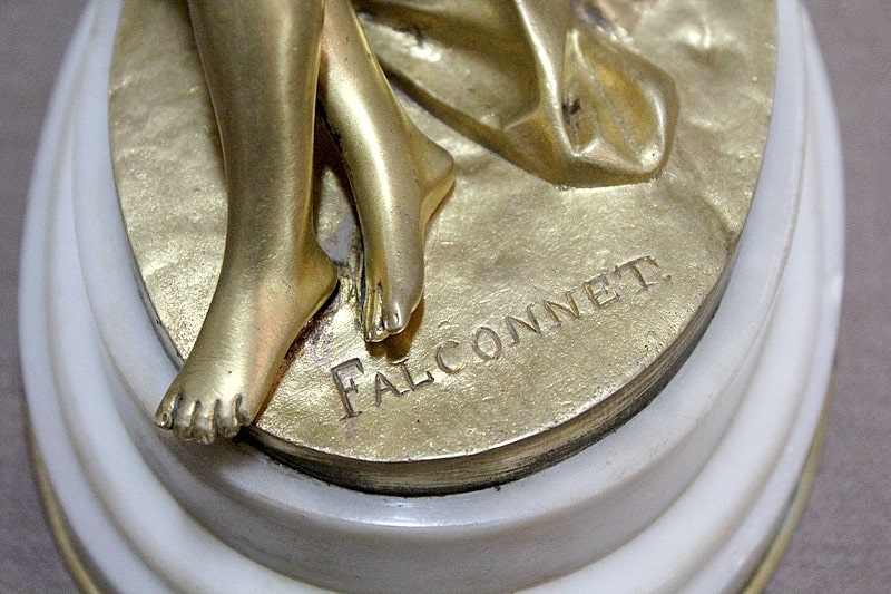 Elle est signée Falconnet et repose sur un socle ovale en marbre blanc de Carrare mouluré.