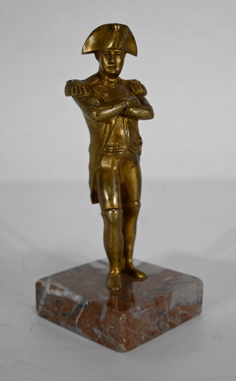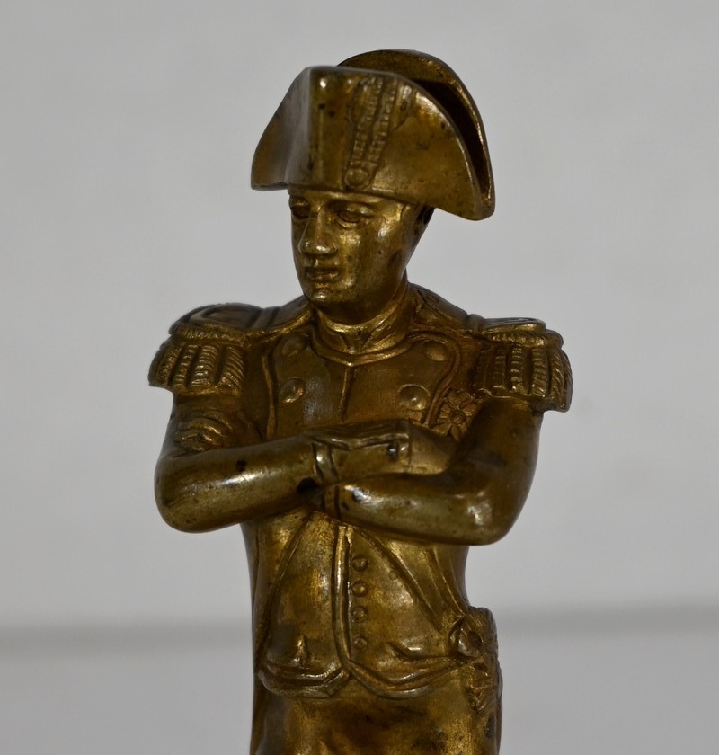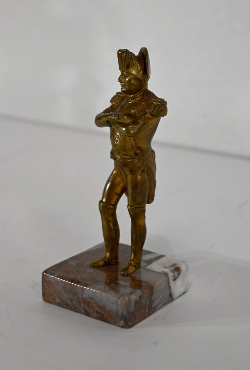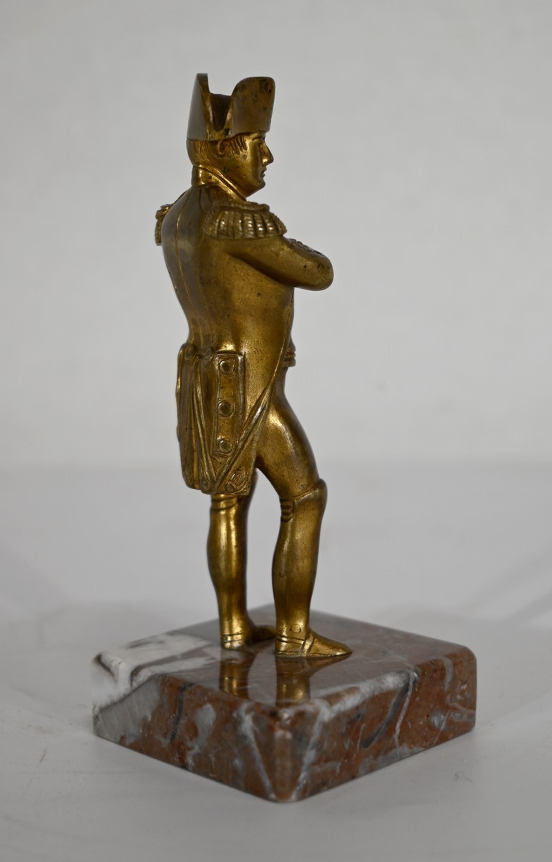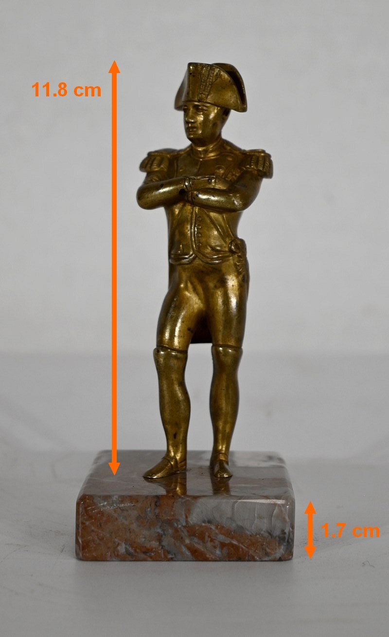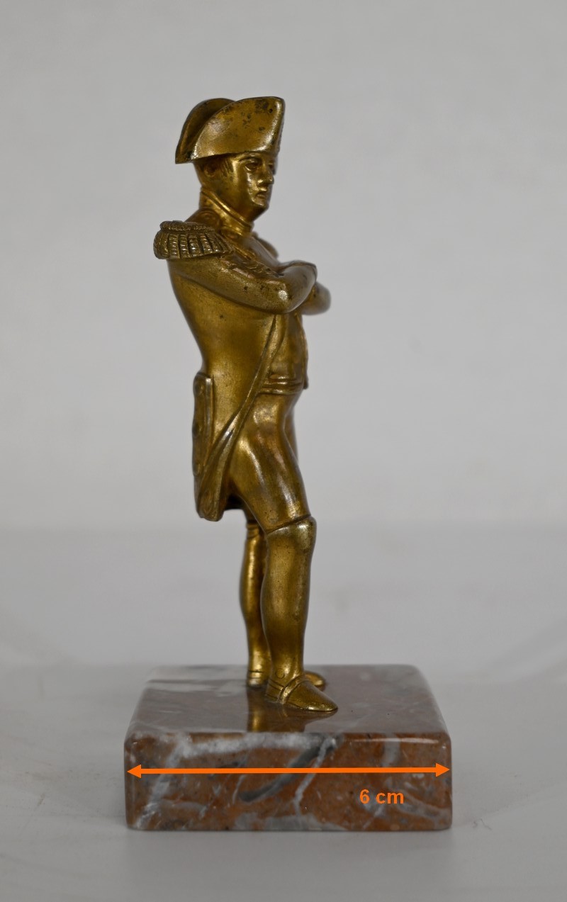 Sujet en Bronze à patine dorée représentant Napoléon Bonaparte. L’empereur est représenté debout, la jambe droite légèrement fléchie, les bras croisés. Il porte l’uniforme des officiers de la garde impériale, avec de hautes bottes et une veste à galons, et est coiffé de son fameux bicorne. L’ensemble repose sur une base carrée en marbre bicolore rose et gris.