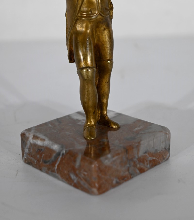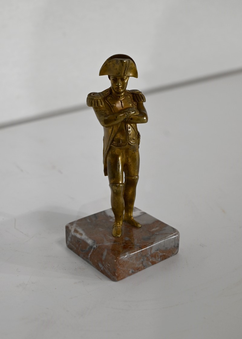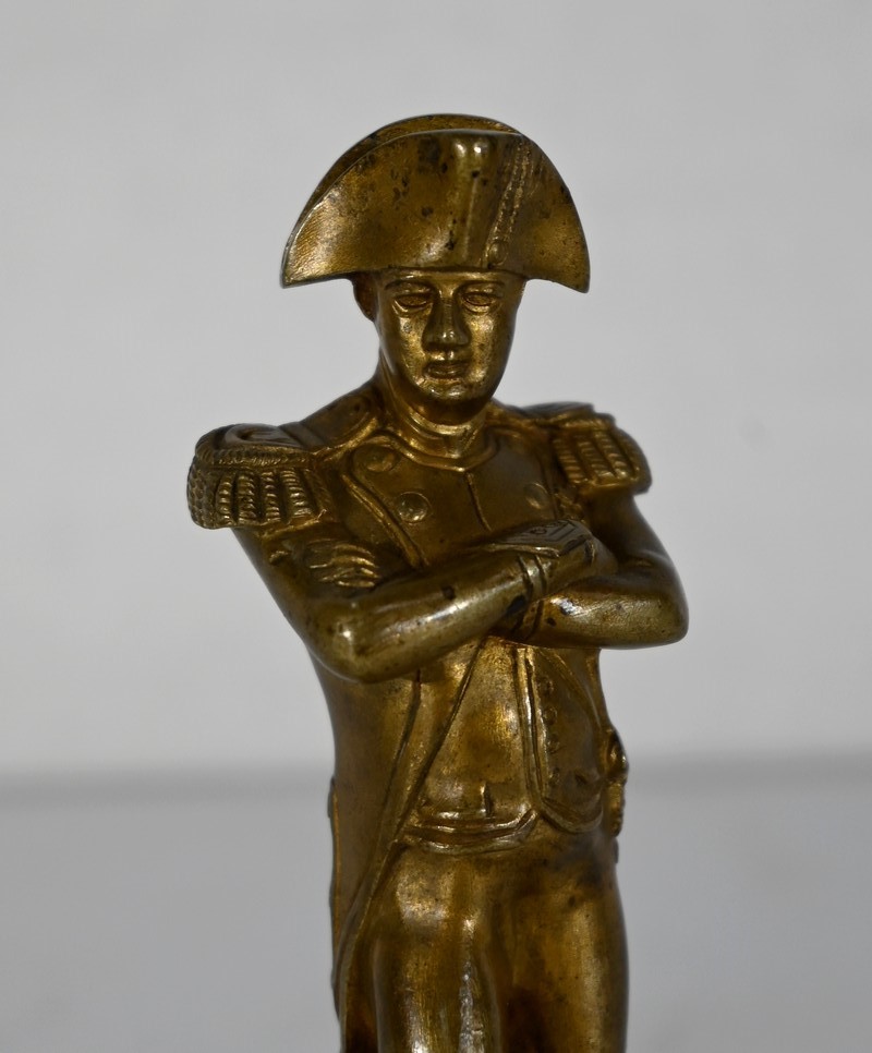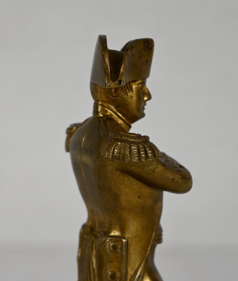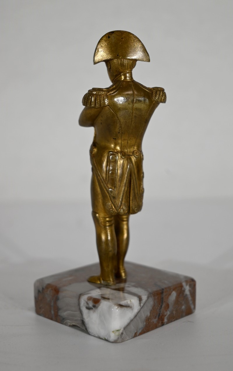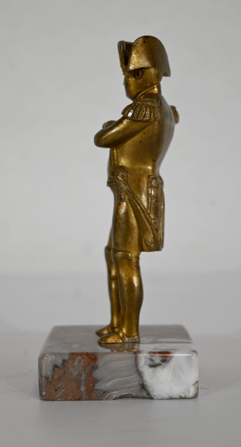 Sujet en Bronze à patine dorée représentant Napoléon Bonaparte. L’empereur est représenté debout, la jambe droite légèrement fléchie, les bras croisés. Il porte l’uniforme des officiers de la garde impériale, avec de hautes bottes et une veste à galons, et est coiffé de son fameux bicorne. L’ensemble repose sur une base carrée en marbre bicolore rose et gris.