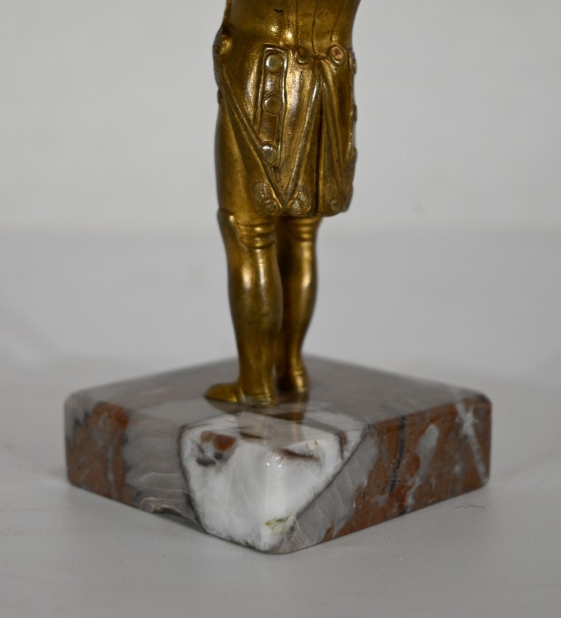 Ce bronze, au petit dimensionnel mais aux détails précis, décorera subtilement un bureau, en pouvant également servir de presse-papiers, à l’occasion.