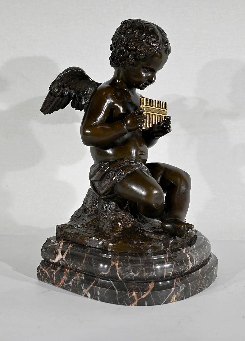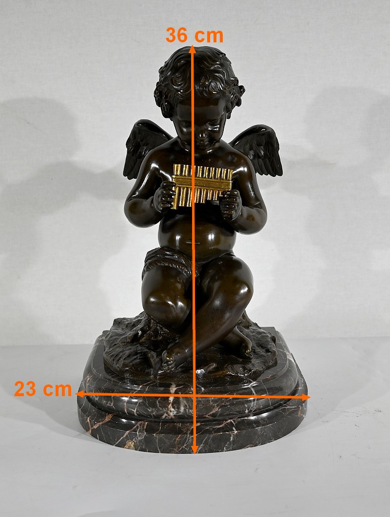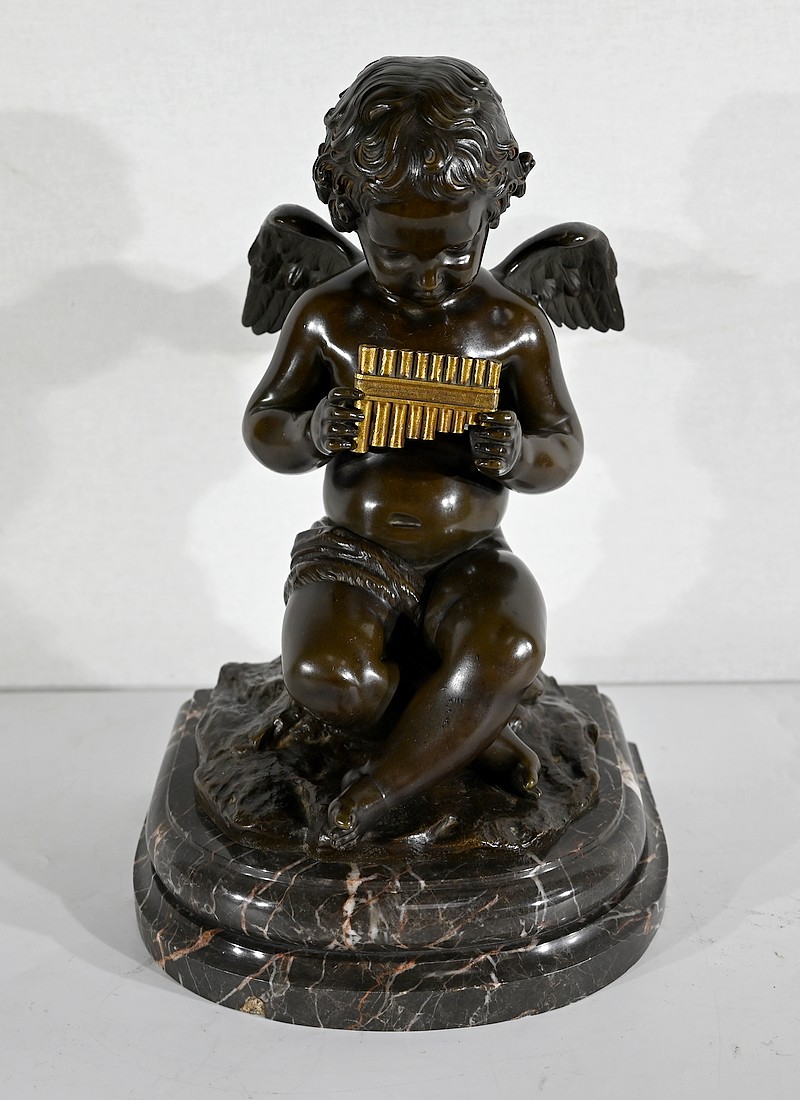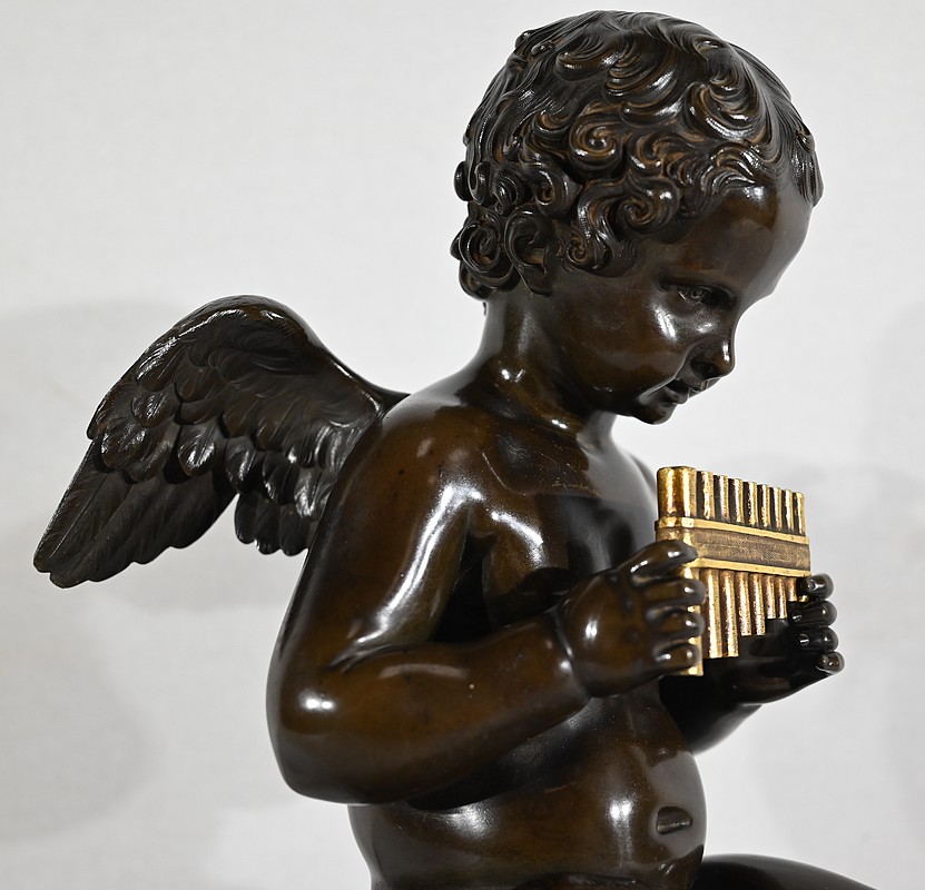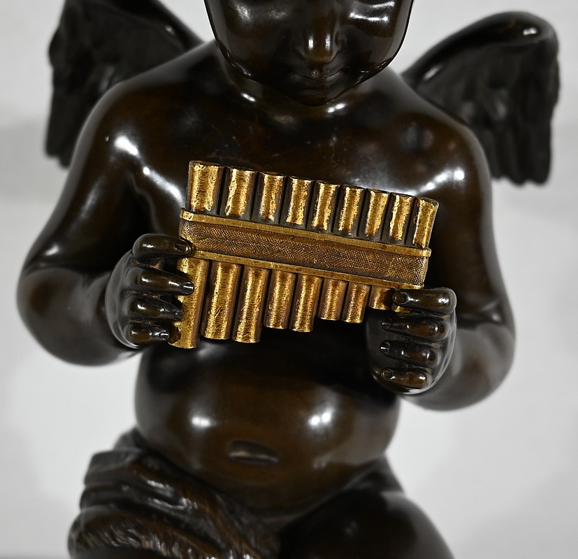 Charmant bronze à patine noire et mordorée, dans le goût XVIIIe, figurant un ange tenant une flûte de pan dorée entre ses mains.