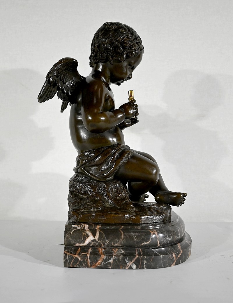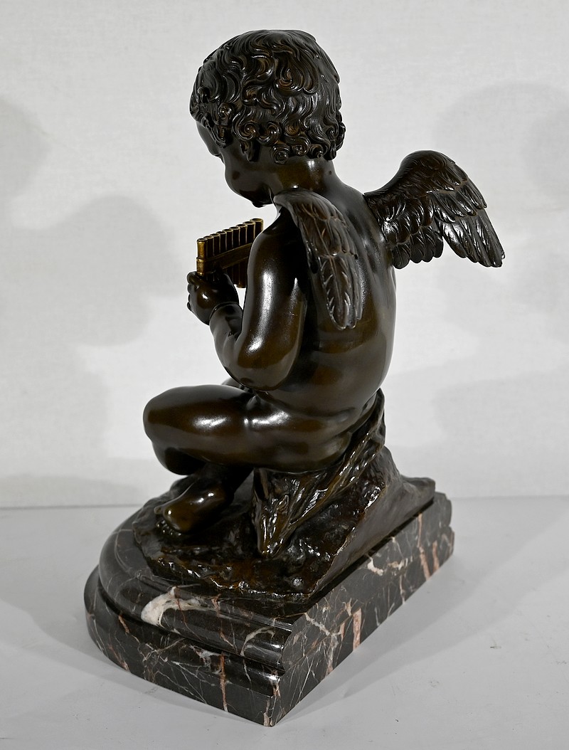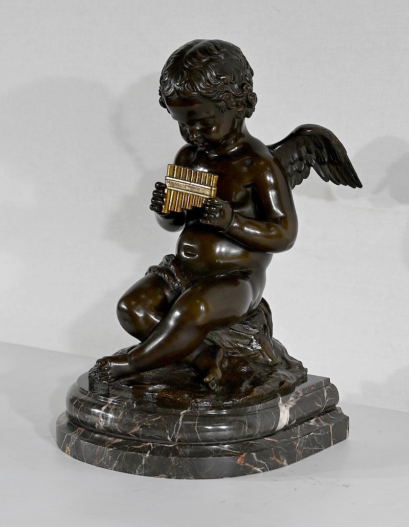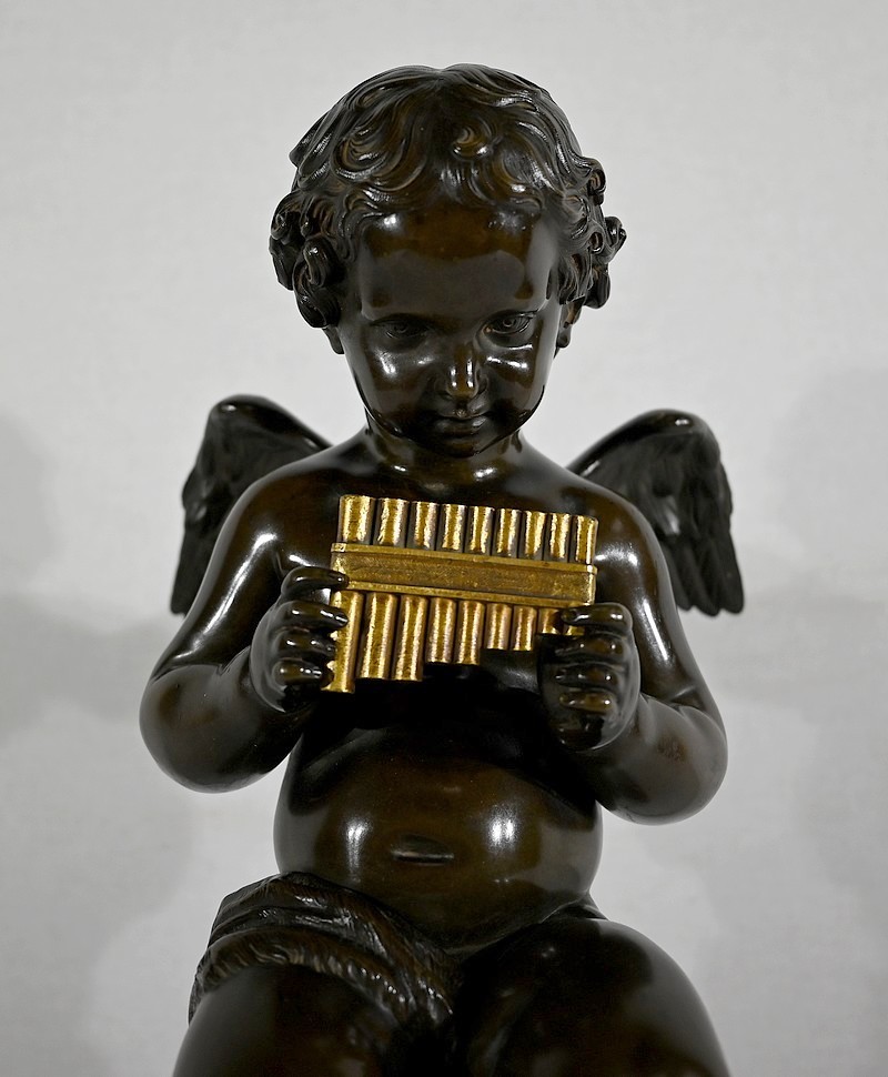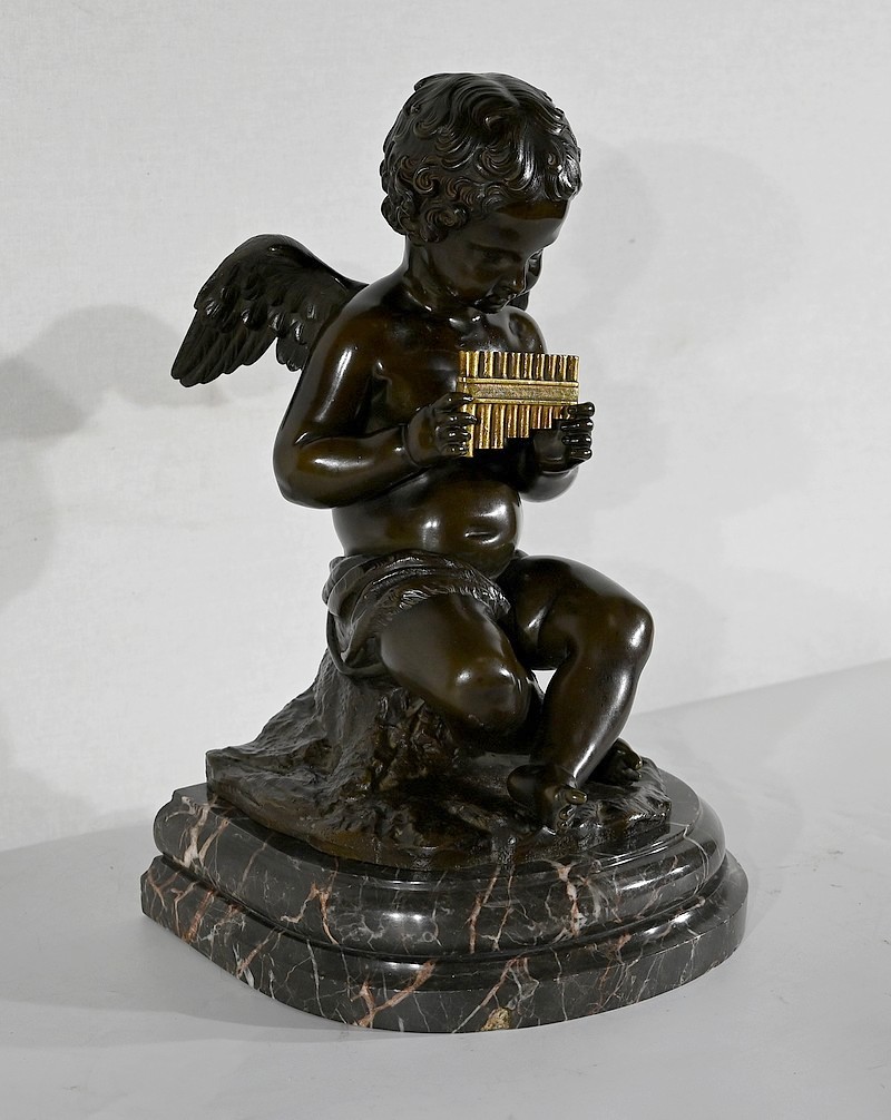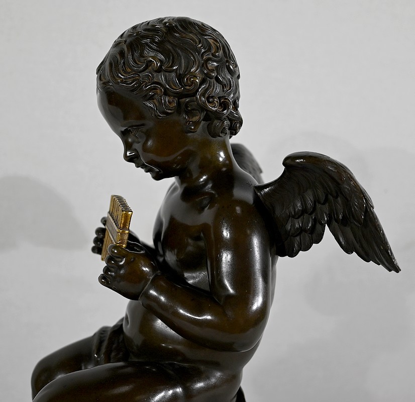 Charmant bronze à patine noire et mordorée, dans le goût XVIIIe, figurant un ange tenant une flûte de pan dorée entre ses mains.