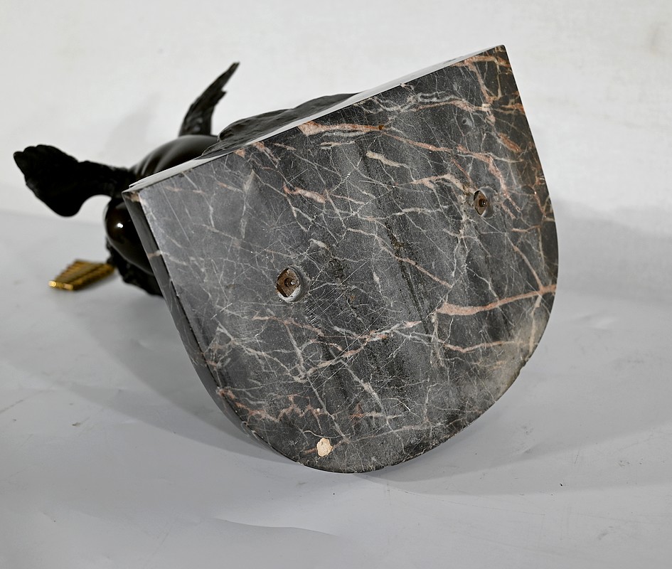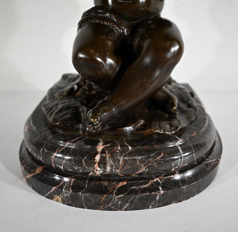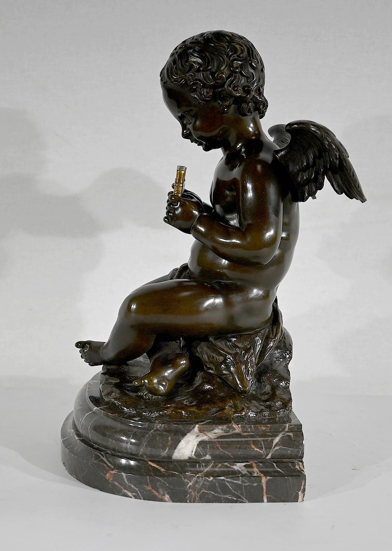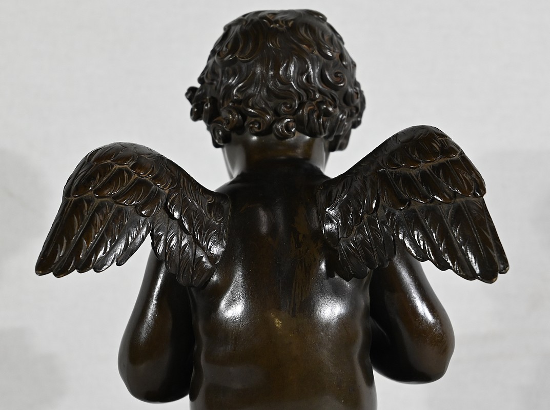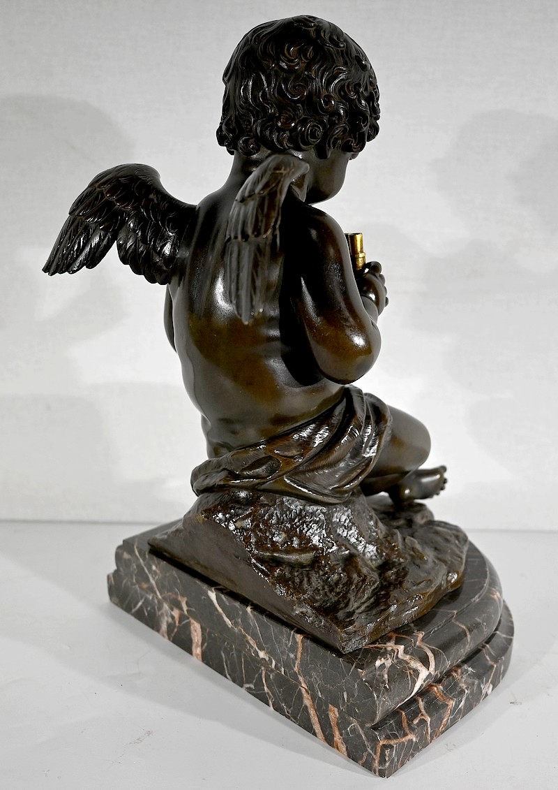 Charmant bronze à patine noire et mordorée, dans le goût XVIIIe, figurant un ange tenant une flûte de pan dorée entre ses mains.