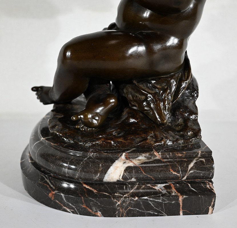 Assis sur un rocher surmonté d’une fourrure de renard, le chérubin croise ses jambes potelées. La tête penchée, l’enfant semble concentré. Lèvres entrouvertes, il reprend son souffle. Son visage harmonieux et joufflu est entouré de petites bouclettes délicates.