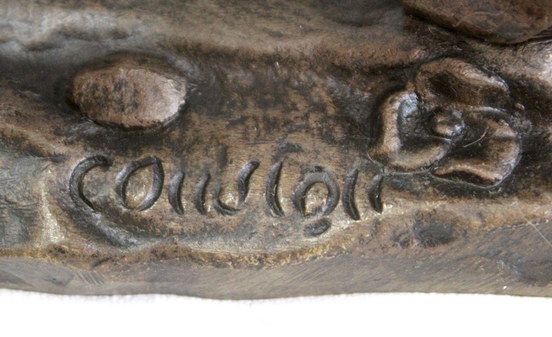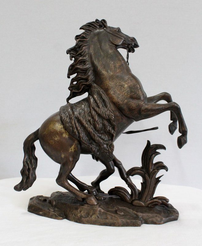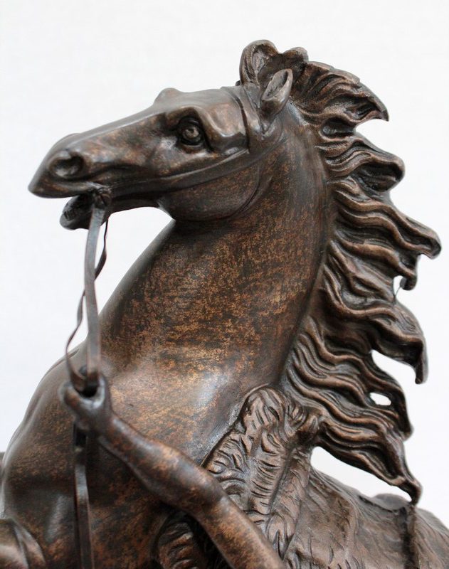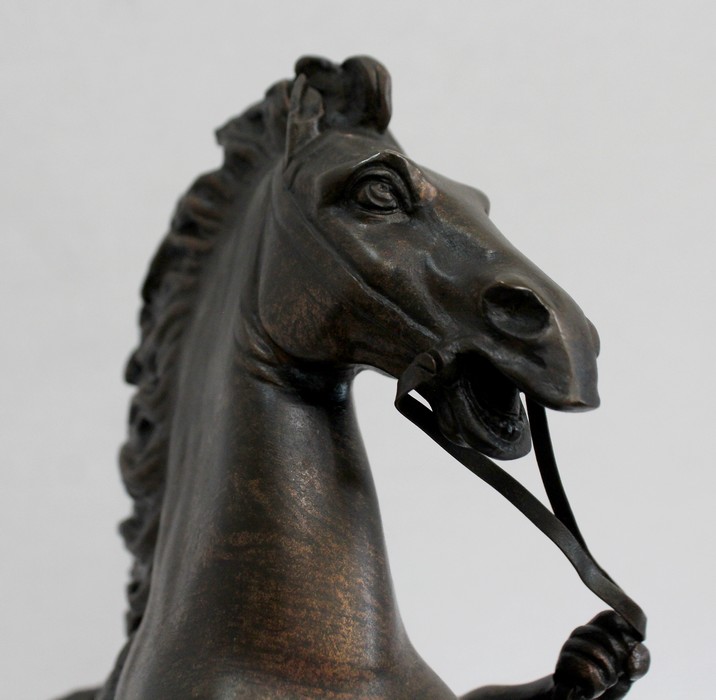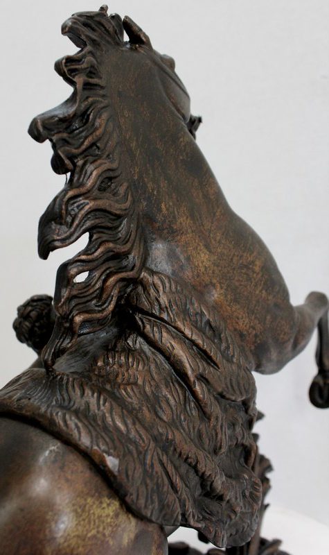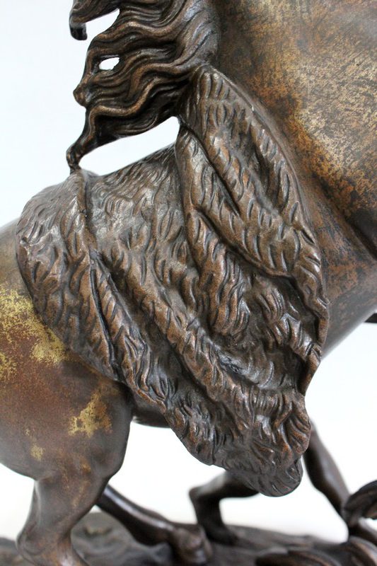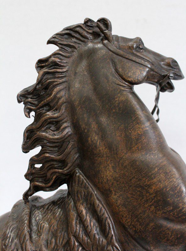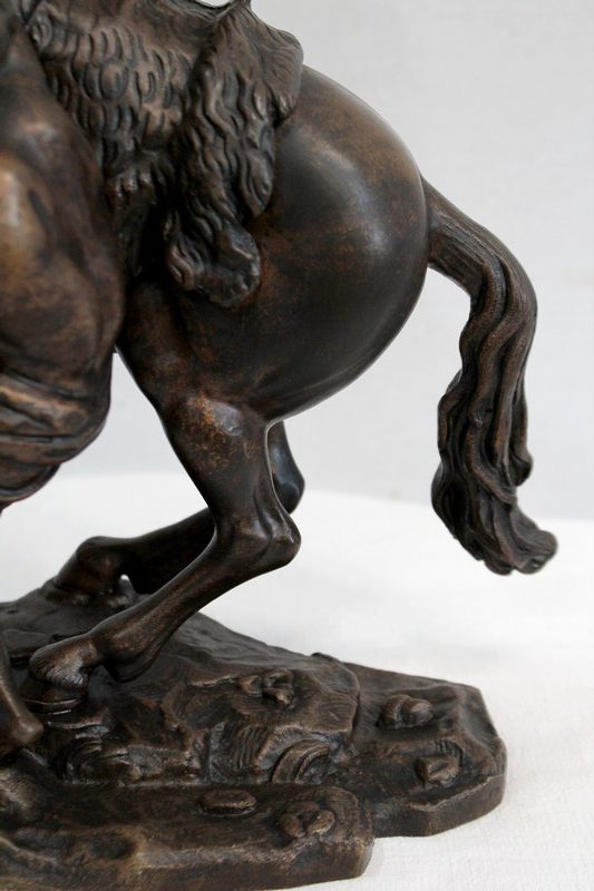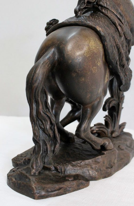 Bronze à patine brune aux discrets reflets dorés signé « Coustou » sur la terrasse, prenant pour thème un des destriers de Marly.