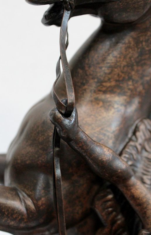 L’artiste a su transcrire avec précision l’état de nervosité de l’animal, et la force sauvage de sa posture. On notera la finesse des détails physionomiques de l’équidé et de l’homme ici sculptés : la crinière au vent, les muscles bandés, le combat qu’ils semblent mener tous deux.