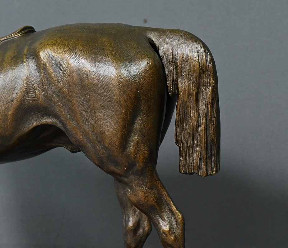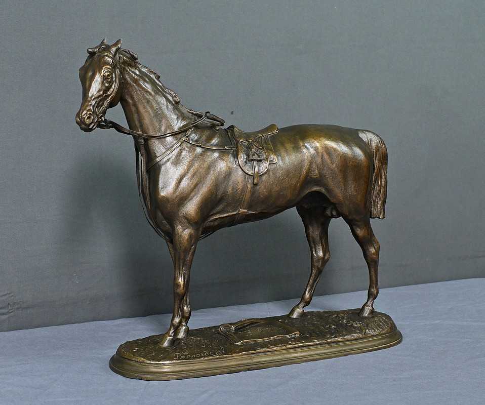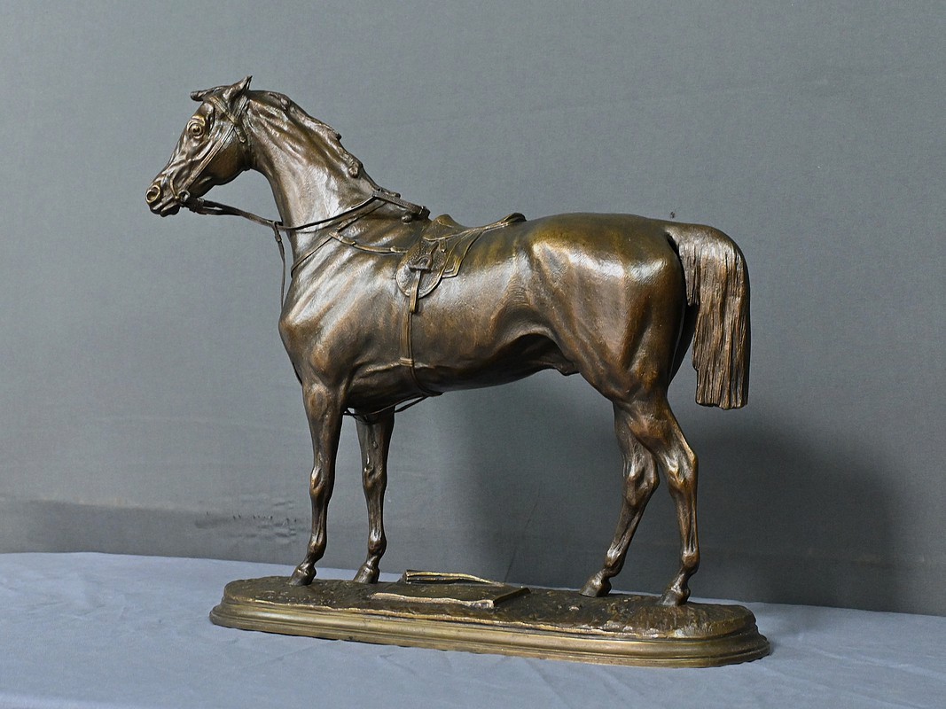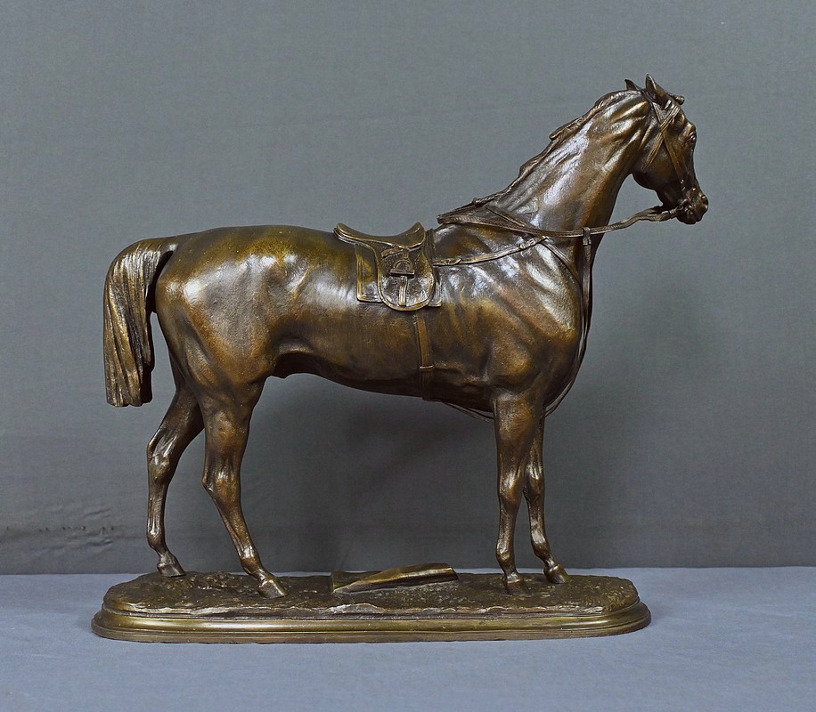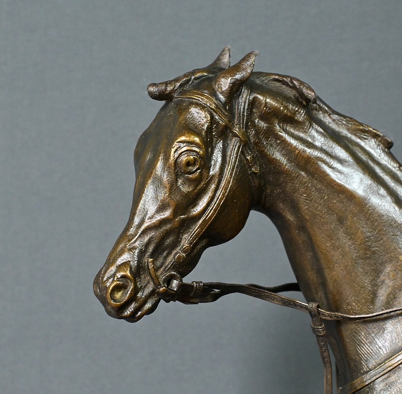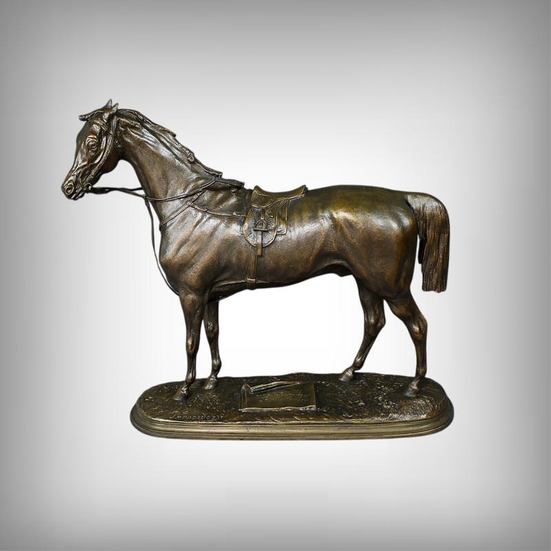 Réalisé par Pierre Lenordez, ce cheval en bronze patiné nommé Saucebox est une sculpture élégante qui met en valeur la puissance et la finesse de l’animal. La posture du cheval semble dynamique, capturant un instant de mouvement ou de tension naturelle. Les détails du modelage révèlent un travail minutieux : les muscles sont finement sculptés, le pelage présente un léger relief, et la crinière semble avoir été façonnée pour donner une impression de fluidité. L’expression du cheval est réaliste, avec des yeux soigneusement travaillés et des naseaux légèrement dilatés, ajoutant une touche de vie à la sculpture. Les pattes sont solidement ancrées sur la terrasse, renforçant l’impression de stabilité et de force. Ce type de représentation est typique des sculpteurs animaliers du XIXe siècle, dont Pierre Lenordez était une figure majeure.