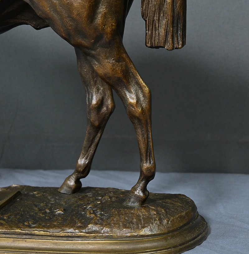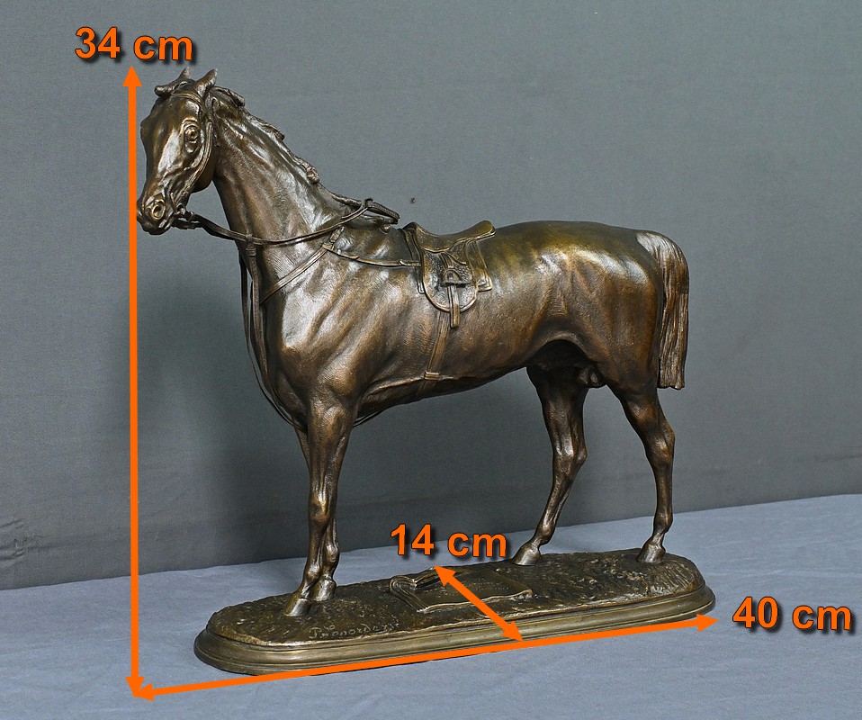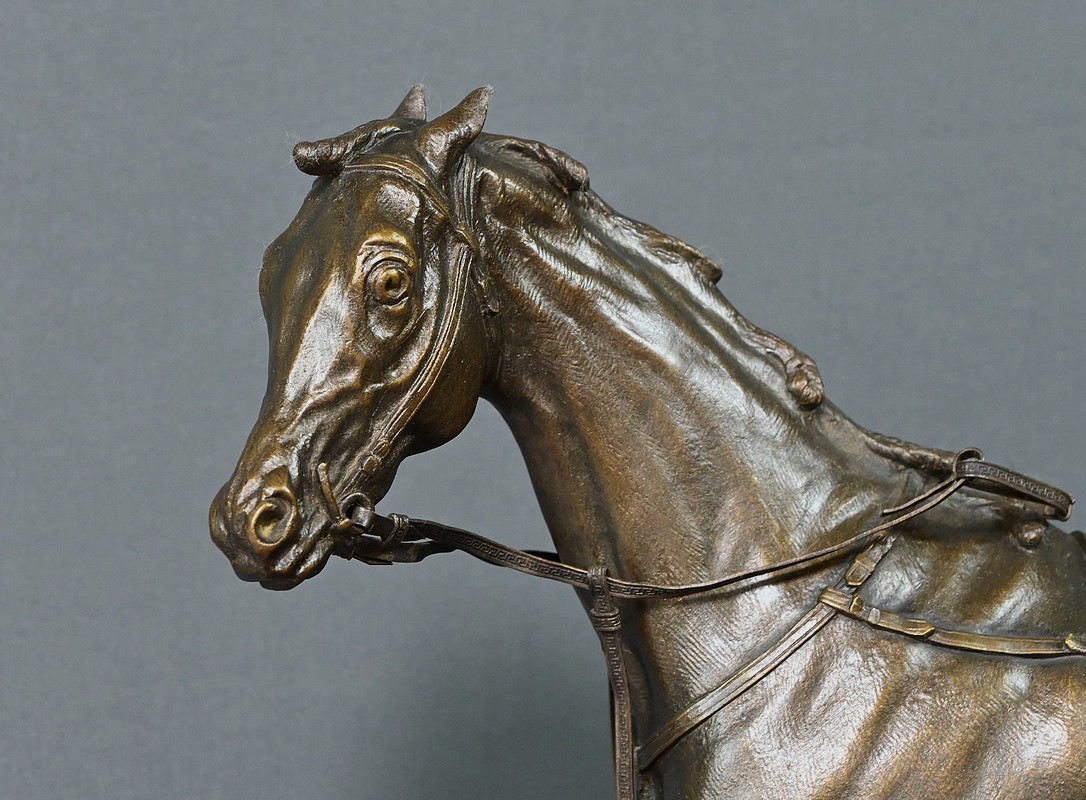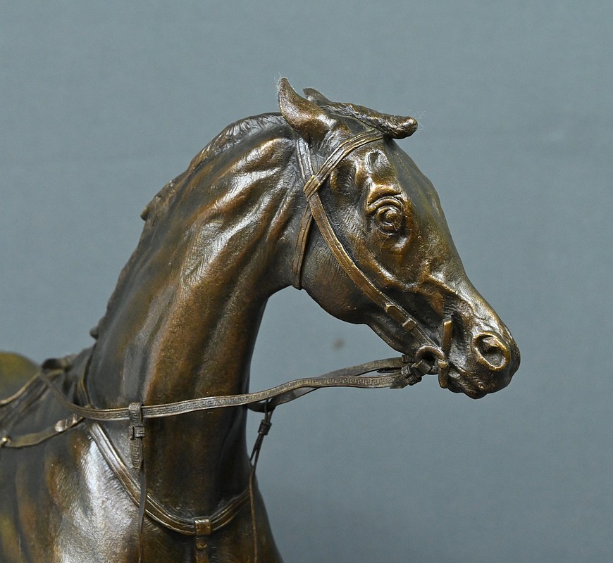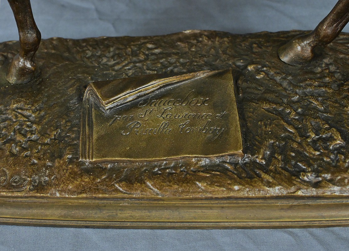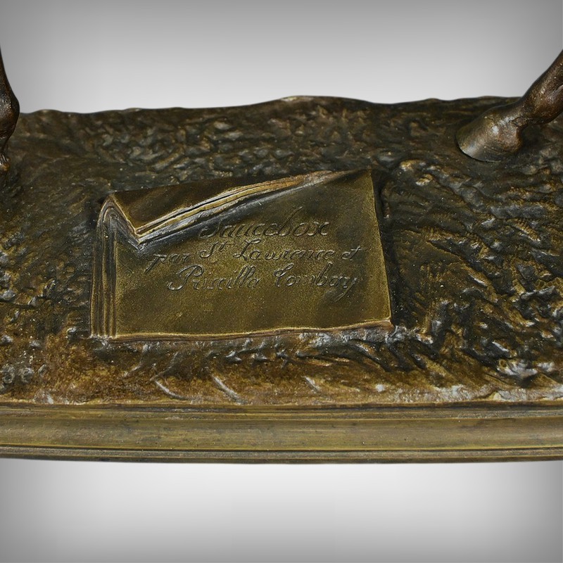 Réalisé par Pierre Lenordez, ce cheval en bronze patiné nommé Saucebox est une sculpture élégante qui met en valeur la puissance et la finesse de l’animal. La posture du cheval semble dynamique, capturant un instant de mouvement ou de tension naturelle. Les détails du modelage révèlent un travail minutieux : les muscles sont finement sculptés, le pelage présente un léger relief, et la crinière semble avoir été façonnée pour donner une impression de fluidité. L’expression du cheval est réaliste, avec des yeux soigneusement travaillés et des naseaux légèrement dilatés, ajoutant une touche de vie à la sculpture. Les pattes sont solidement ancrées sur la terrasse, renforçant l’impression de stabilité et de force. Ce type de représentation est typique des sculpteurs animaliers du XIXe siècle, dont Pierre Lenordez était une figure majeure.