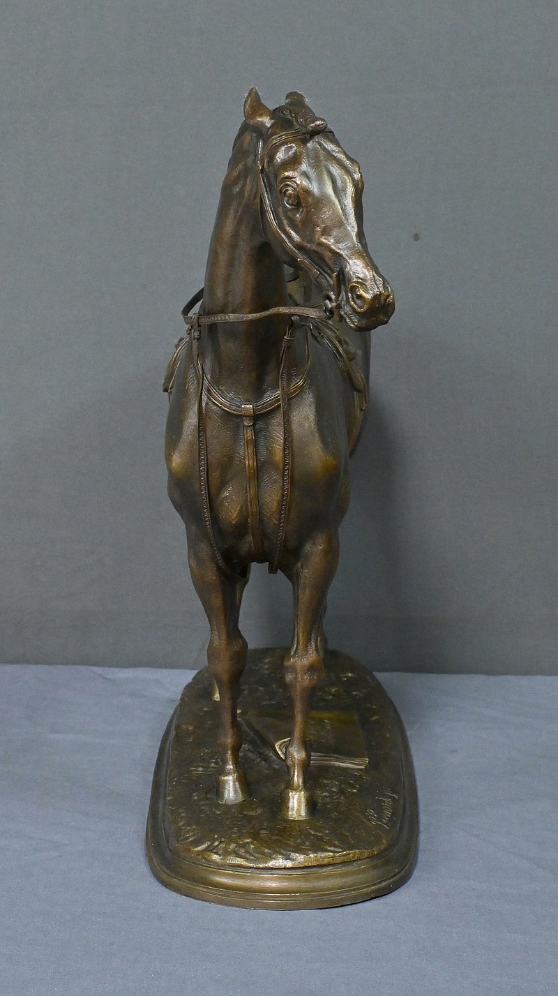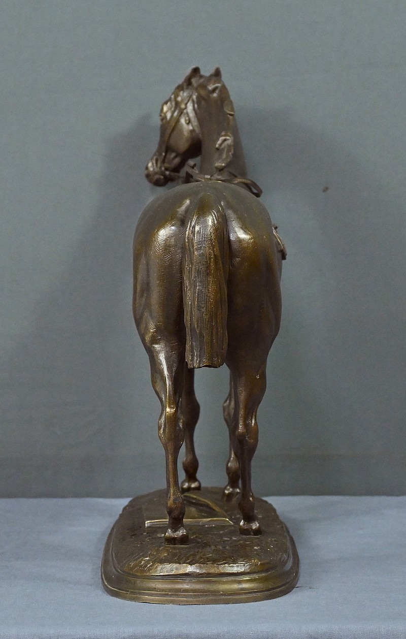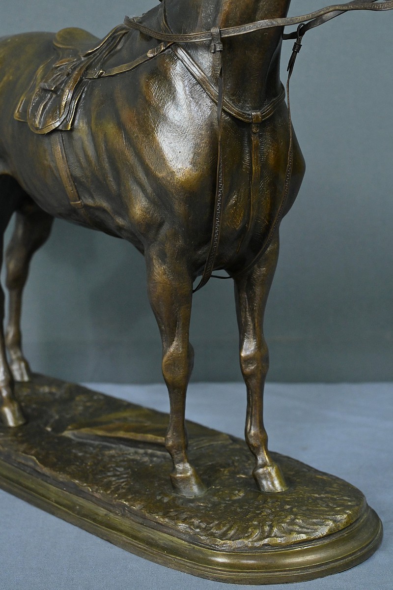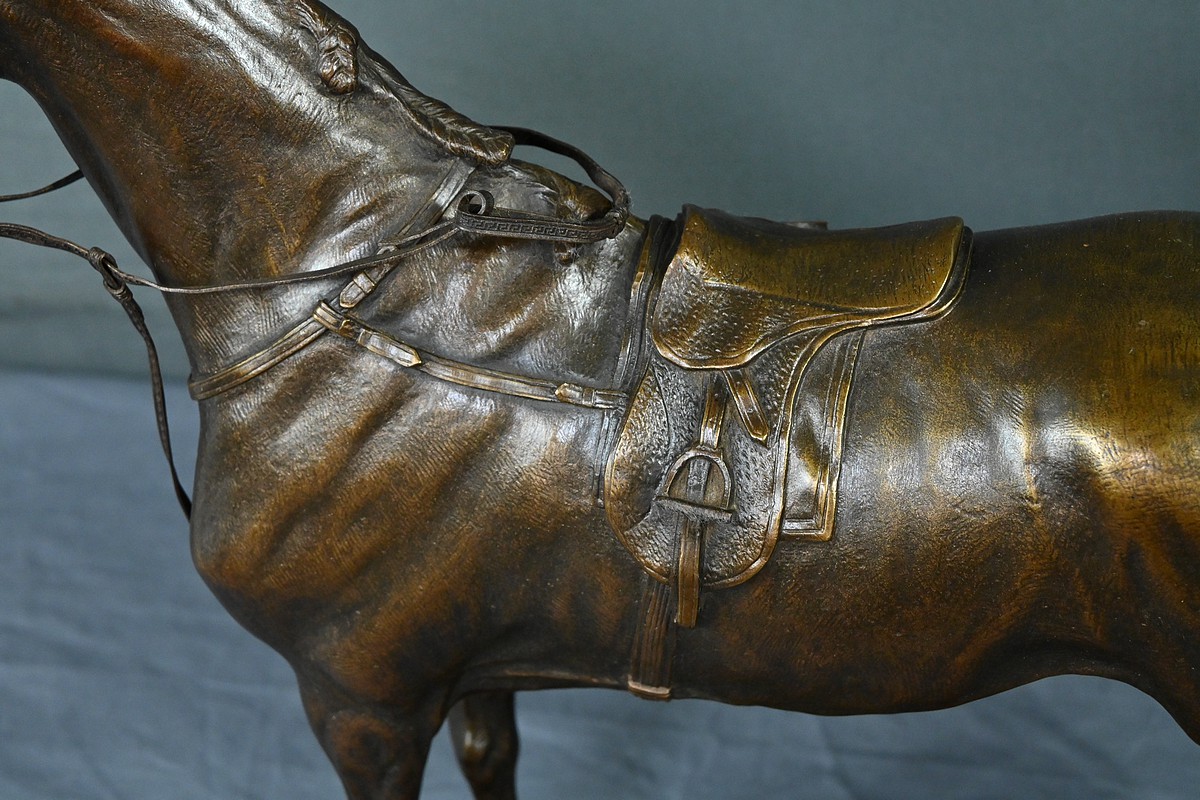 Réalisé par Pierre Lenordez, ce cheval en bronze patiné nommé Saucebox est une sculpture élégante qui met en valeur la puissance et la finesse de l’animal. La posture du cheval semble dynamique, capturant un instant de mouvement ou de tension naturelle. Les détails du modelage révèlent un travail minutieux : les muscles sont finement sculptés, le pelage présente un léger relief, et la crinière semble avoir été façonnée pour donner une impression de fluidité. L’expression du cheval est réaliste, avec des yeux soigneusement travaillés et des naseaux légèrement dilatés, ajoutant une touche de vie à la sculpture. Les pattes sont solidement ancrées sur la terrasse, renforçant l’impression de stabilité et de force. Ce type de représentation est typique des sculpteurs animaliers du XIXe siècle, dont Pierre Lenordez était une figure majeure.