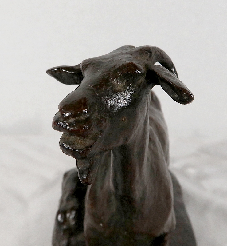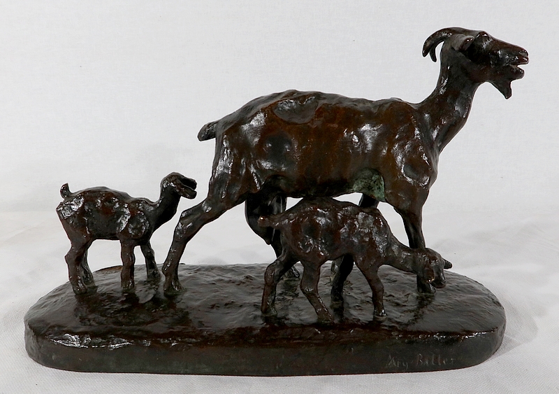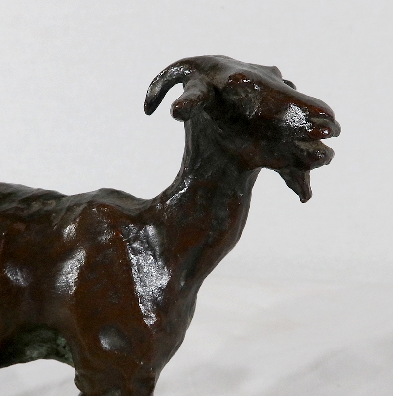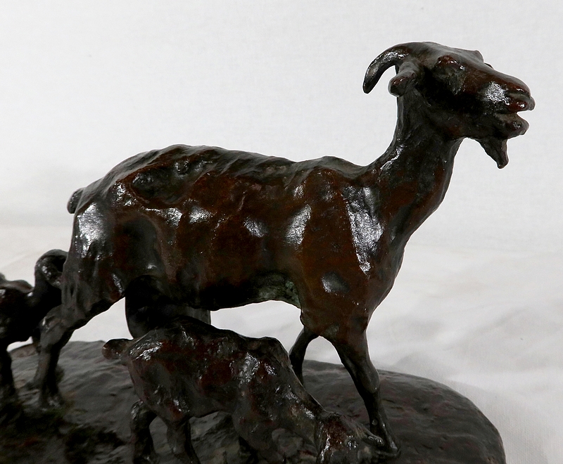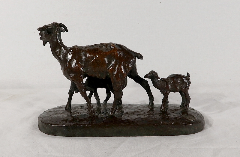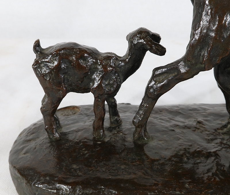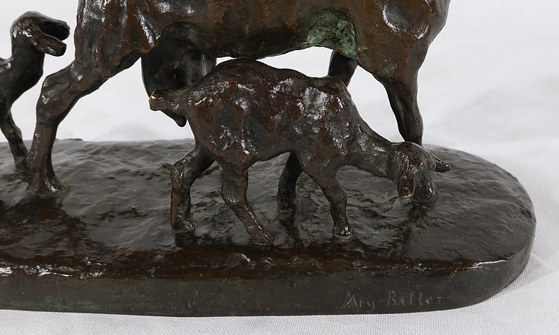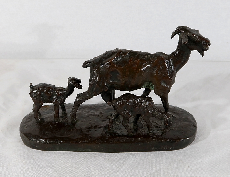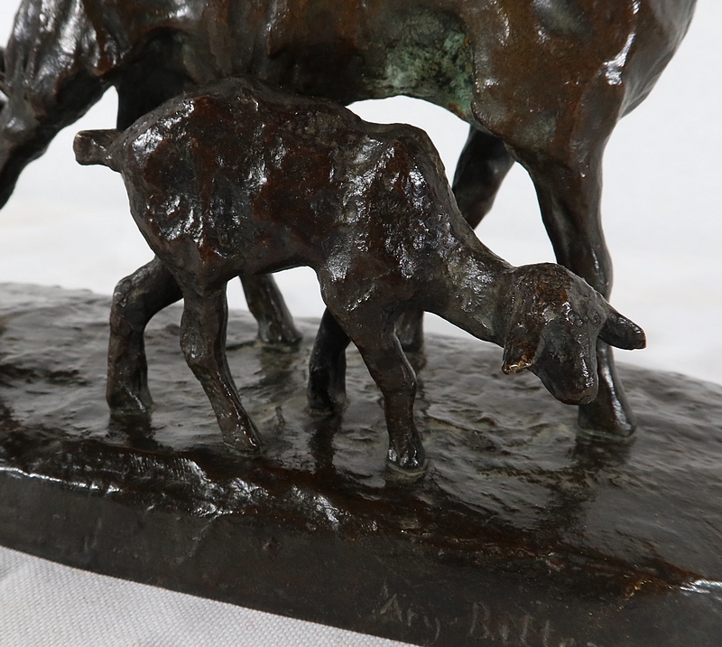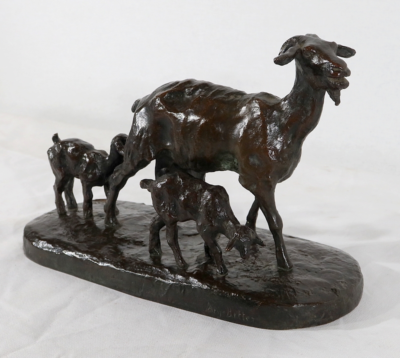 Sujet non réédité, donc rare, « Chèvre et ses chevreaux » est un bronze bucolique soulignant la passion de l’artiste pour les animaux. La chèvre marche accompagnée de ses deux petits. Ary Bitter les sculpte de manière fine et rugueuse.