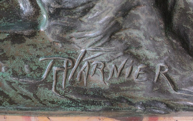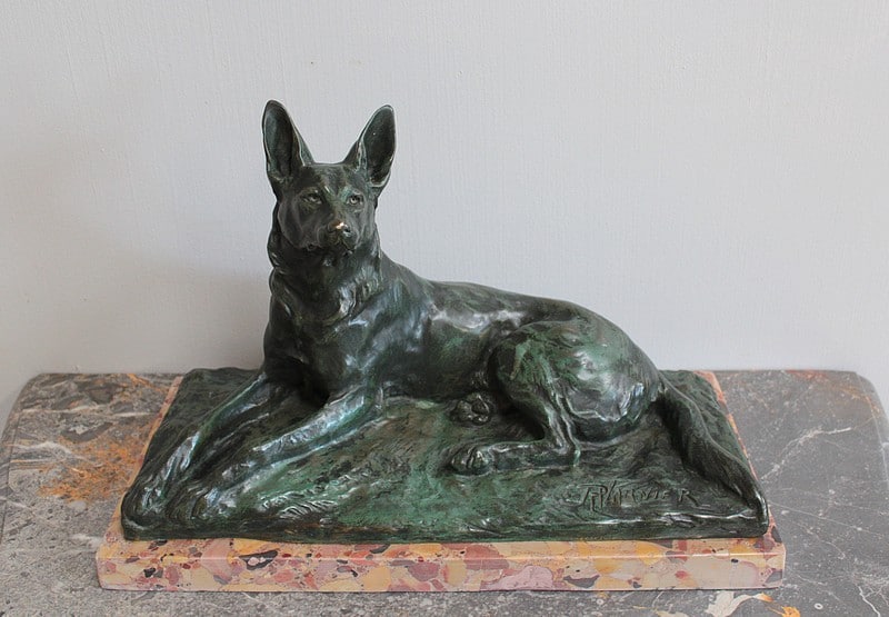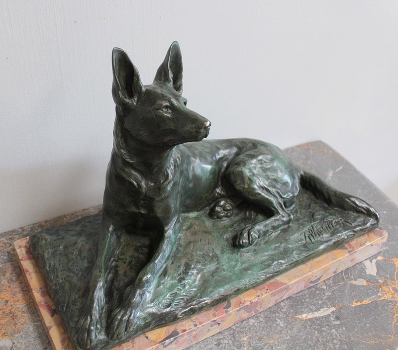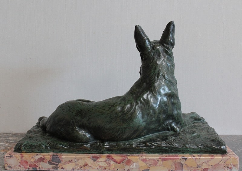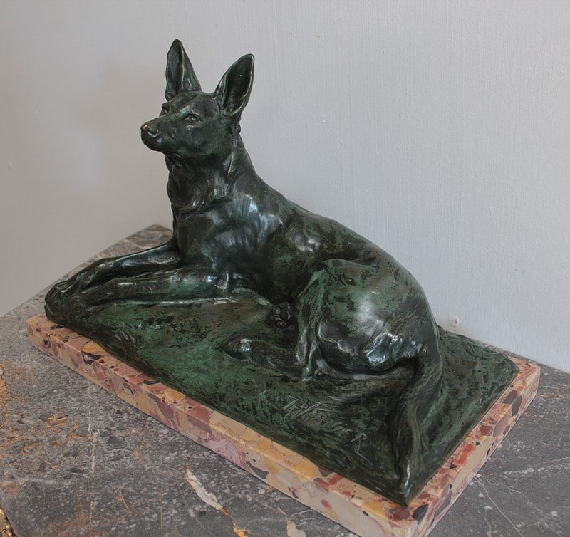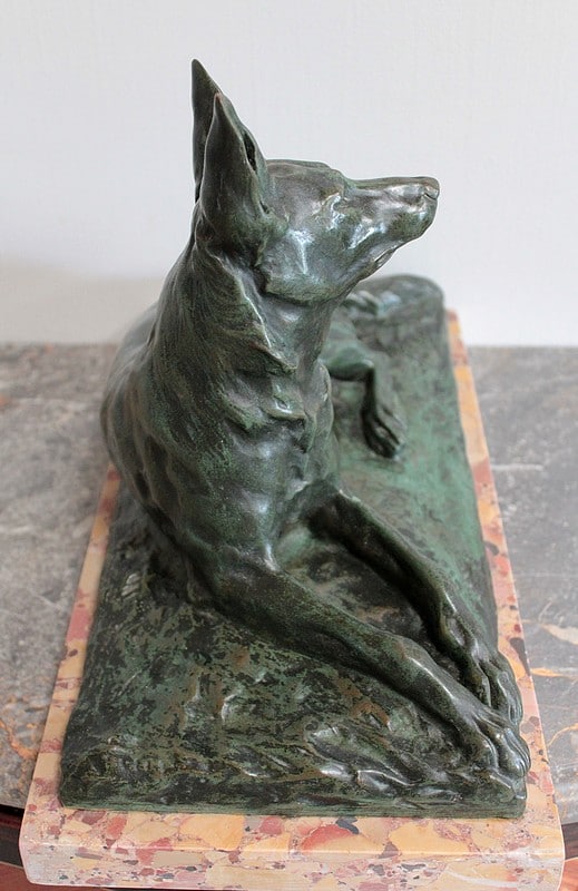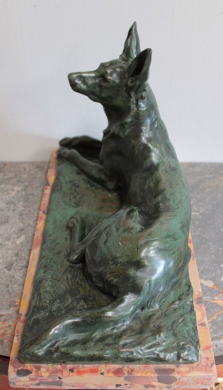 Bronze à patine verte ‘Chien couché’ sur socle de marbre brocatelle, de René André VARNIER (XIX-XX).