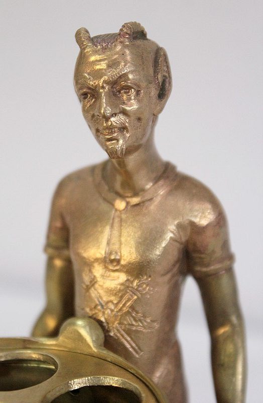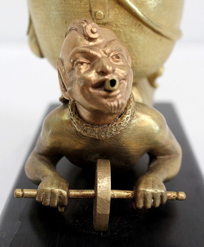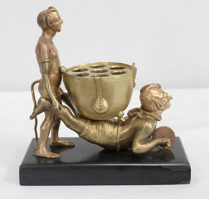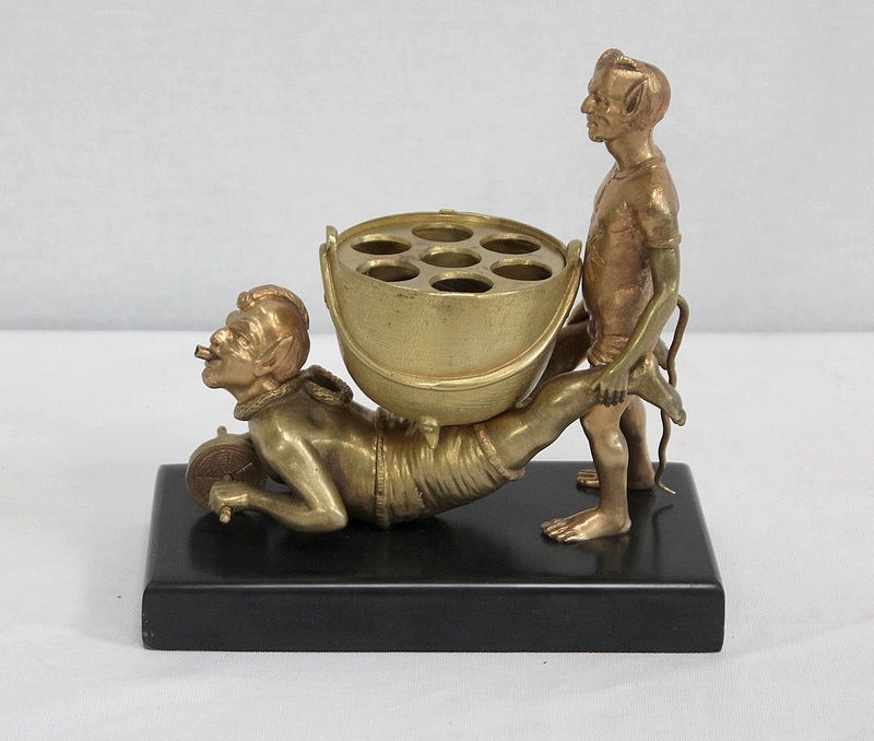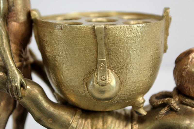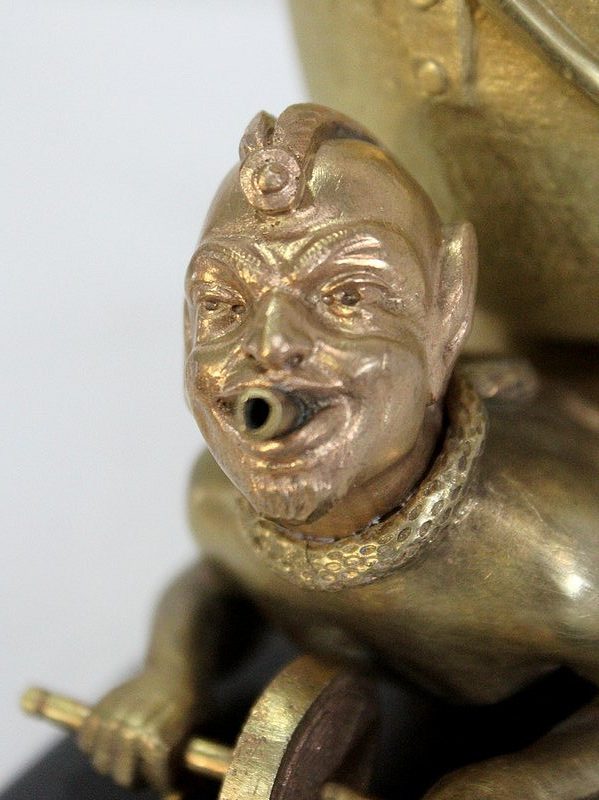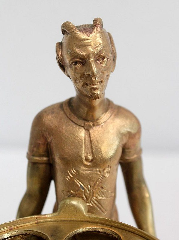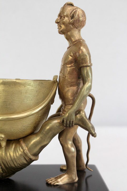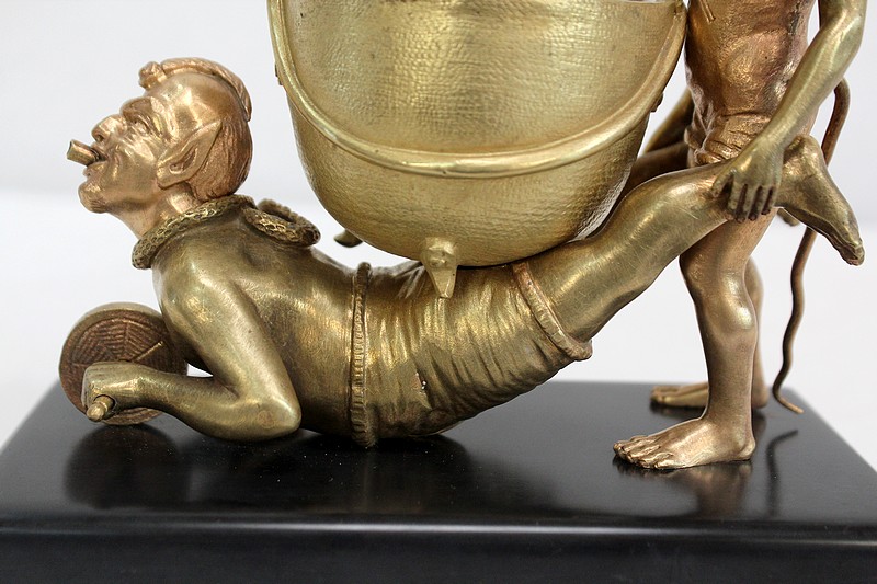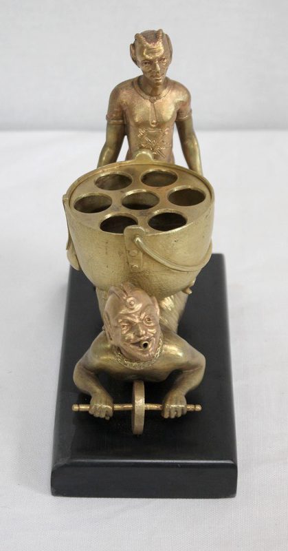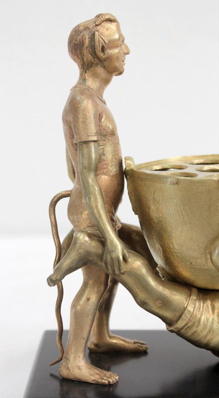 Les personnages portent les attributs physiques caractéristiques des serviteurs des Enfers : cornes, oreilles pointues, barbichette, queue. Ils sont ici représentés faisant la brouette et portant un chaudron. Celui-ci est sommé d’une plaque amovible ajourée, qui peut à souhait être retirée.