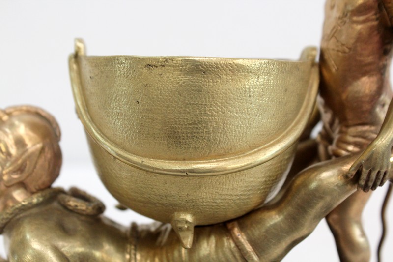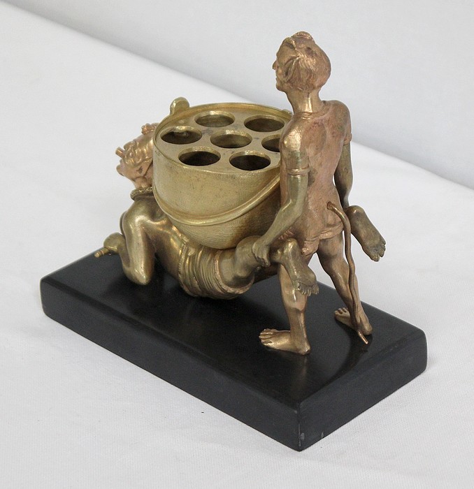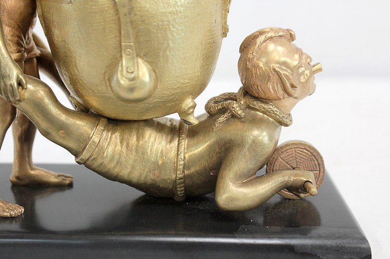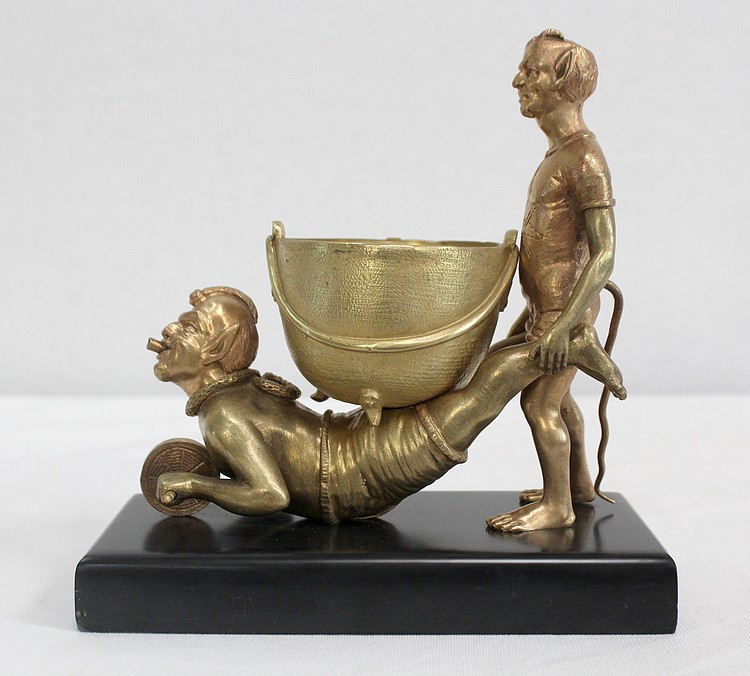 Bronze à patine dorée figurant deux diablotins, reposant sur un socle en marbre de couleur noire.