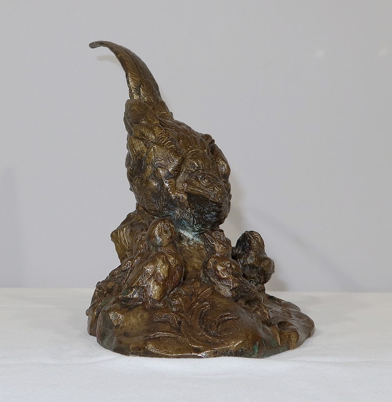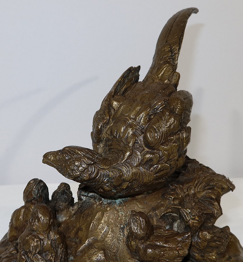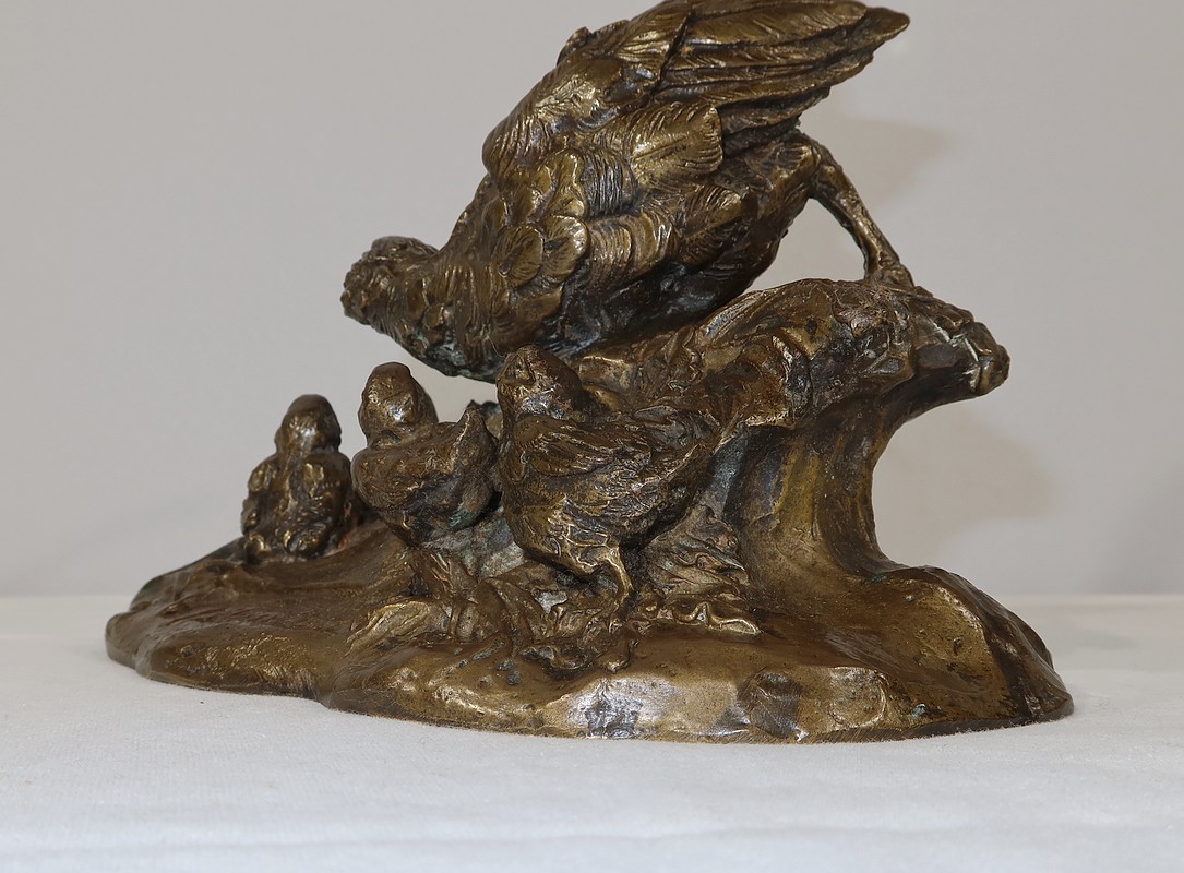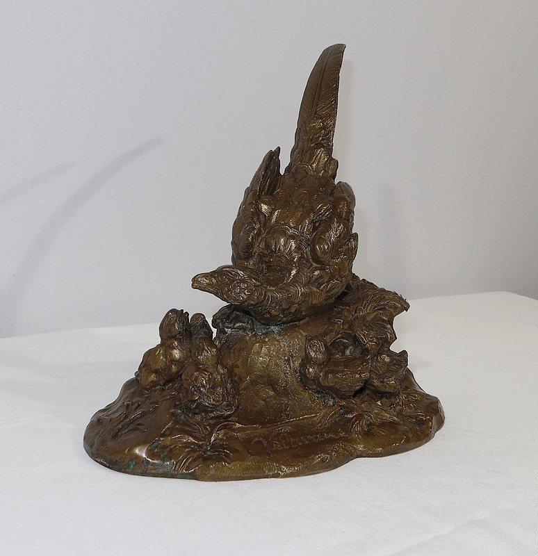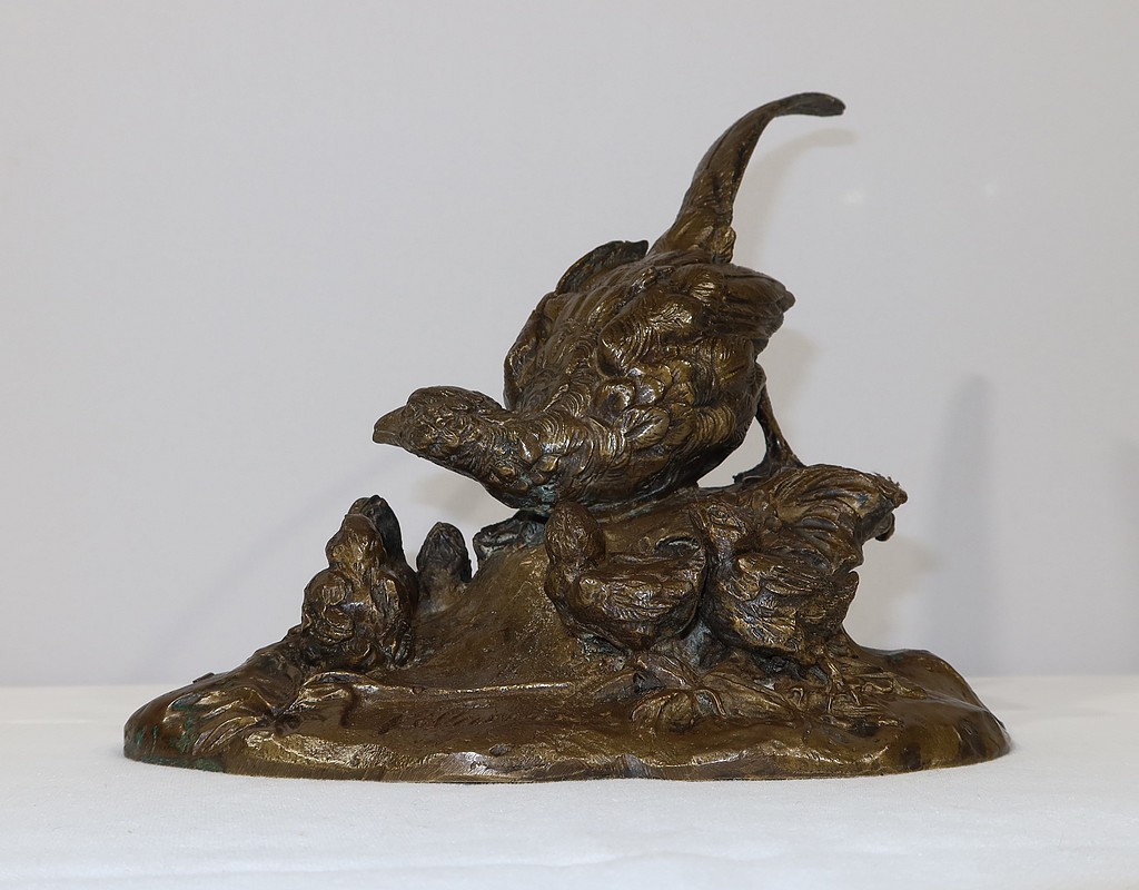Sujet en bronze à patine médaille signé sur la terrasse Vilavan, représentant une poule faisane protégeant ses cinq petits.