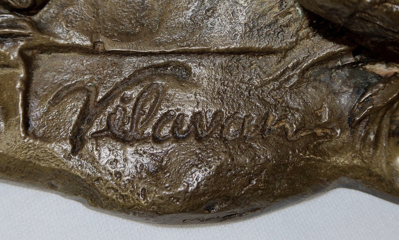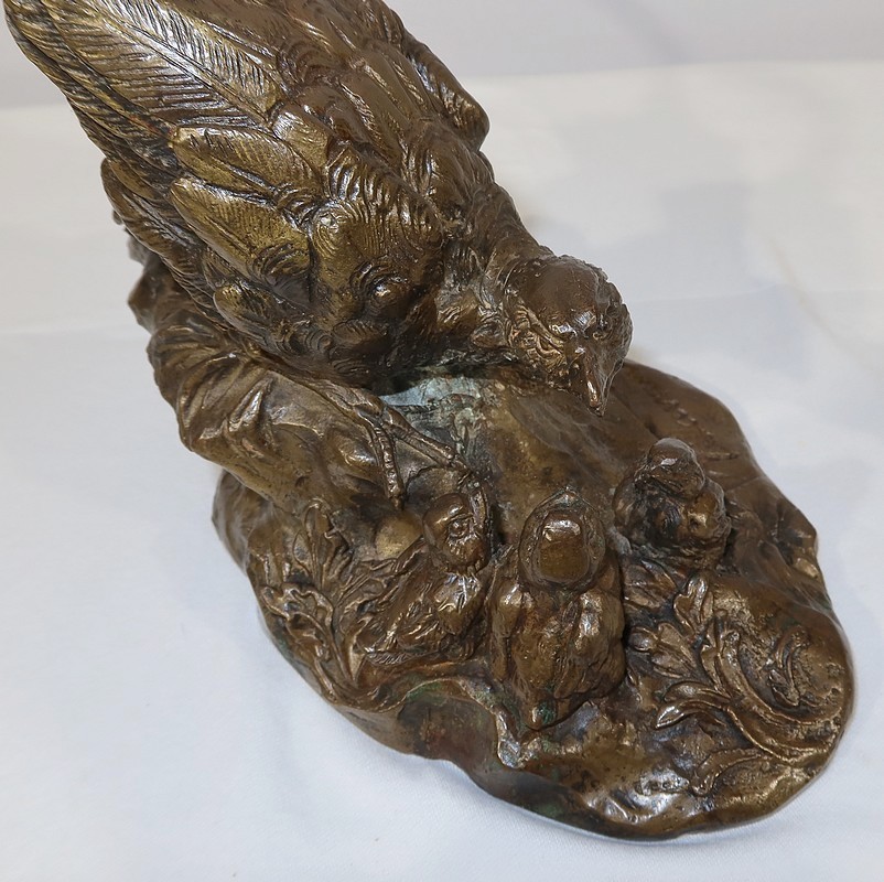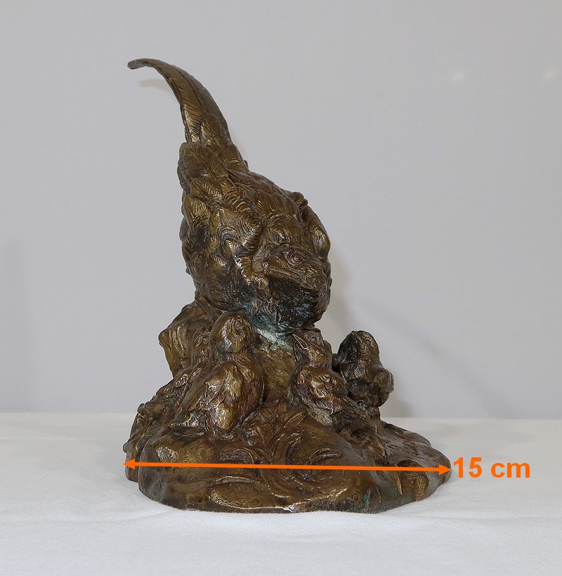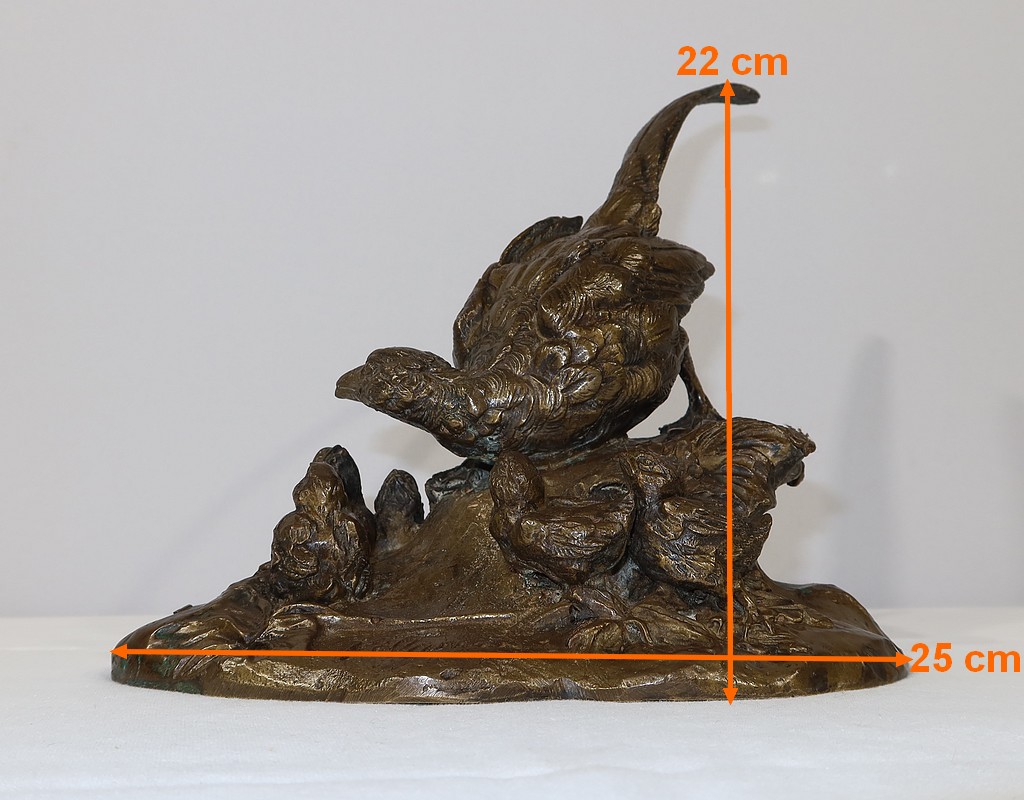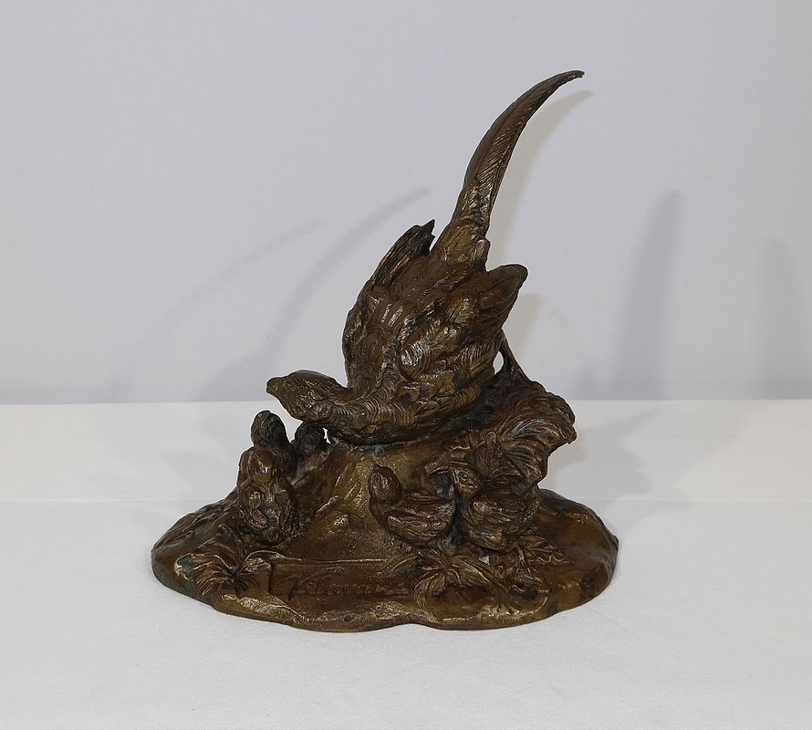 Sujet en bronze à patine médaille signé sur la terrasse Vilavan, représentant une poule faisane protégeant ses cinq petits.