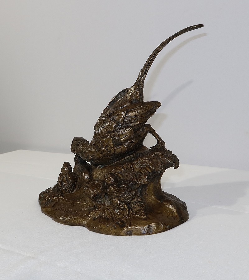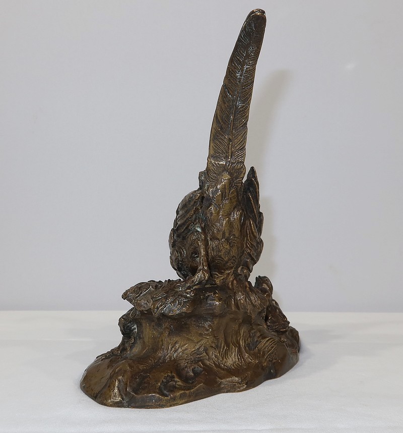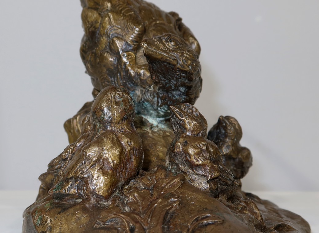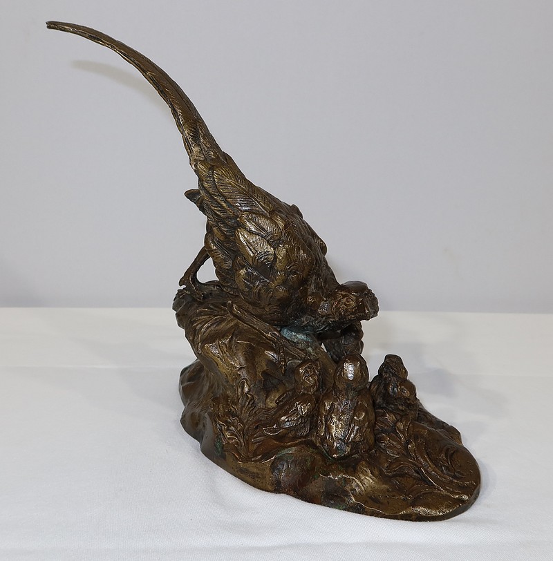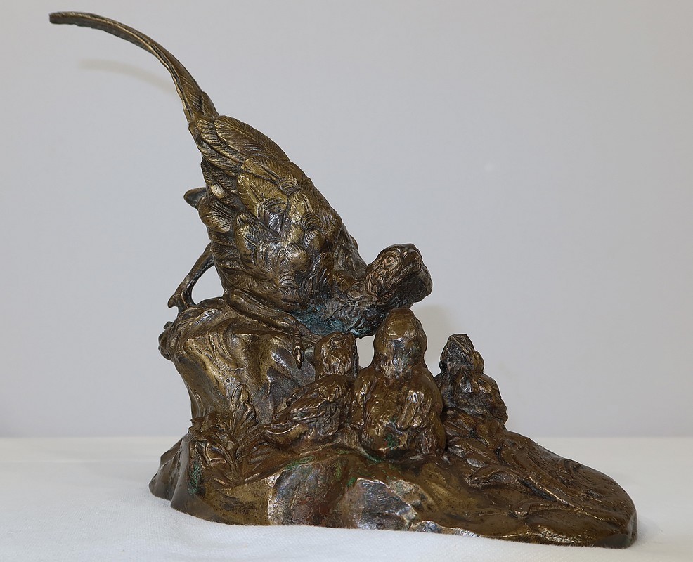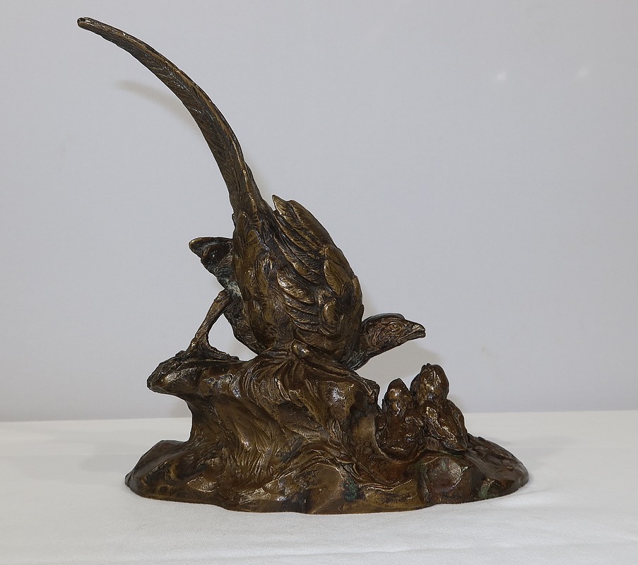 Cette sculpture animalière touchante et parfaitement exécutée, nous montre cette famille d’oiseaux dans son milieu naturel, entourée d’herbe et de feuillages. La faisane est en alerte penchée vers ses petits, la queue surélevée. Ils la regardent, attentifs.