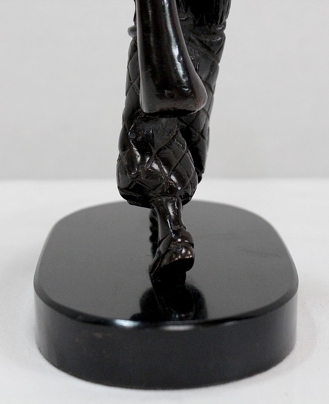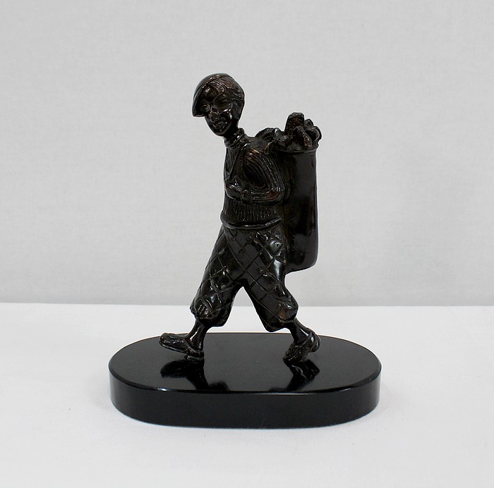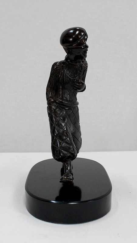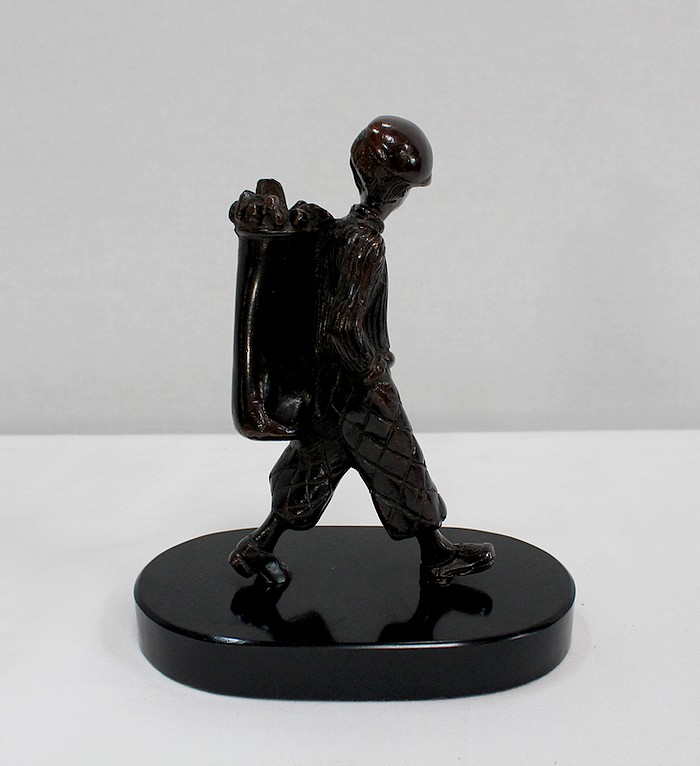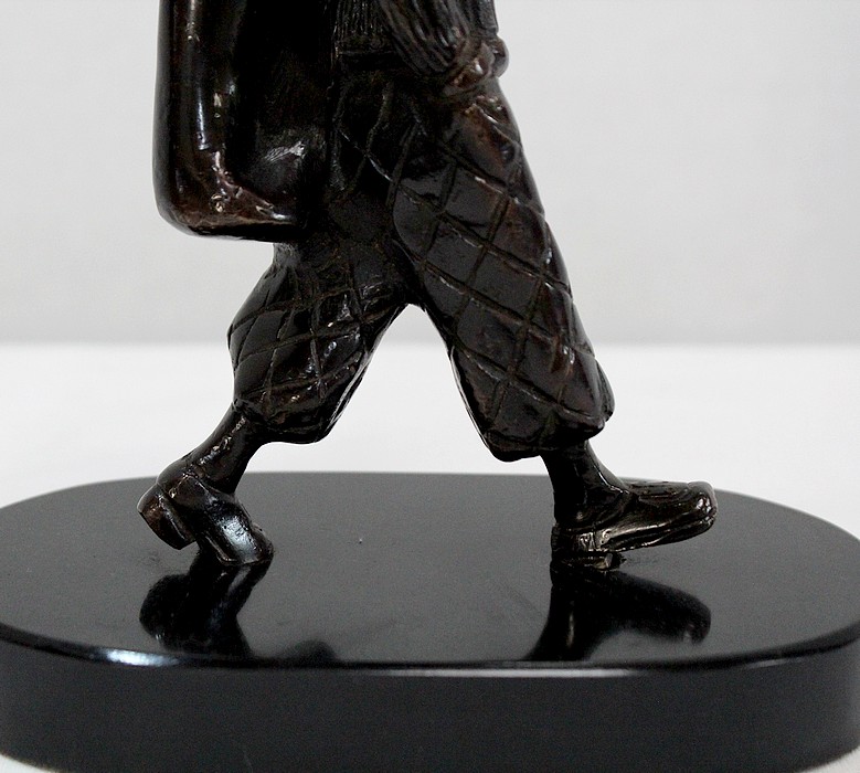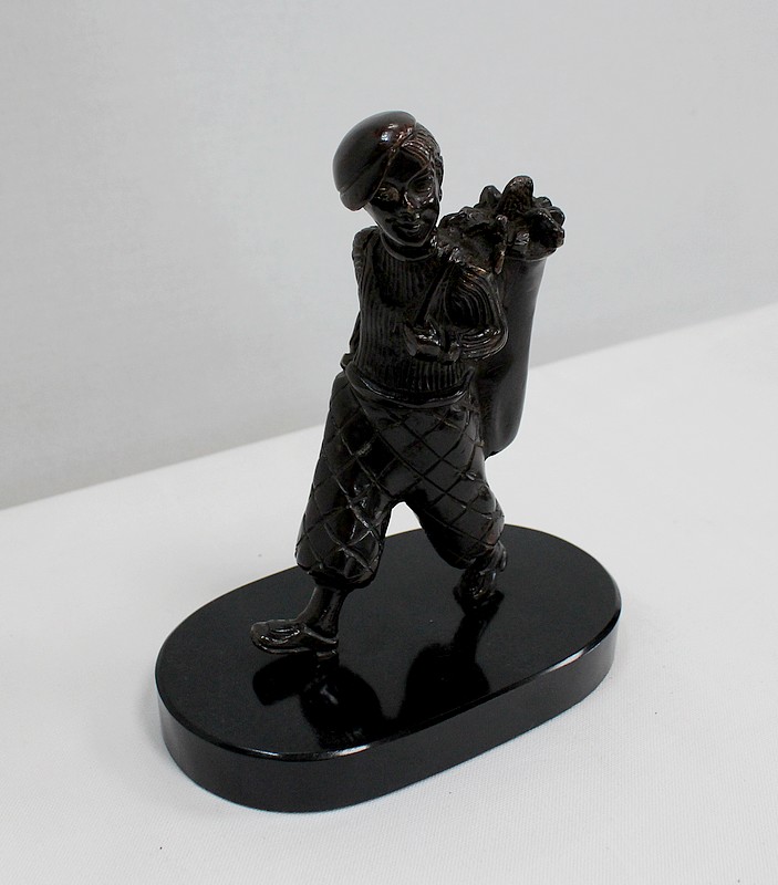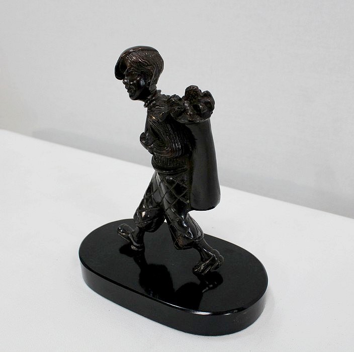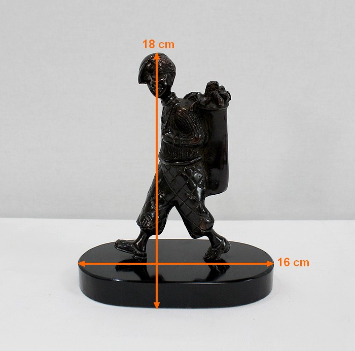 Bronze à Patine Brune sur Socle en Marbre Noir représentant un jeune Caddie portant le sac d’un Joueur de Golf.