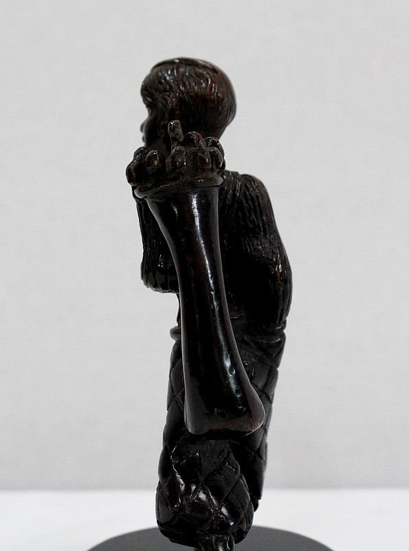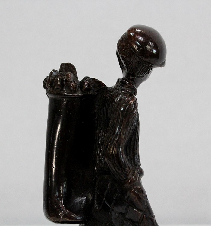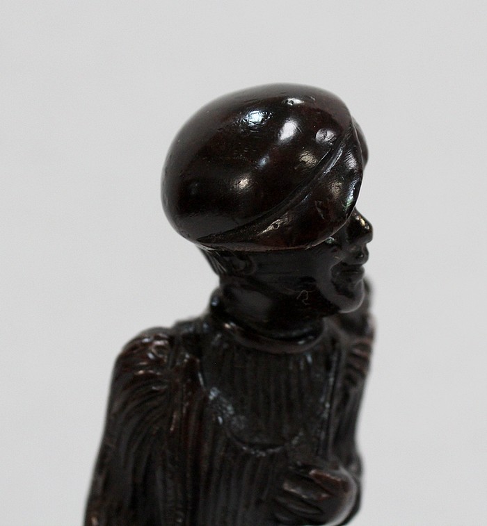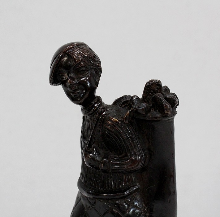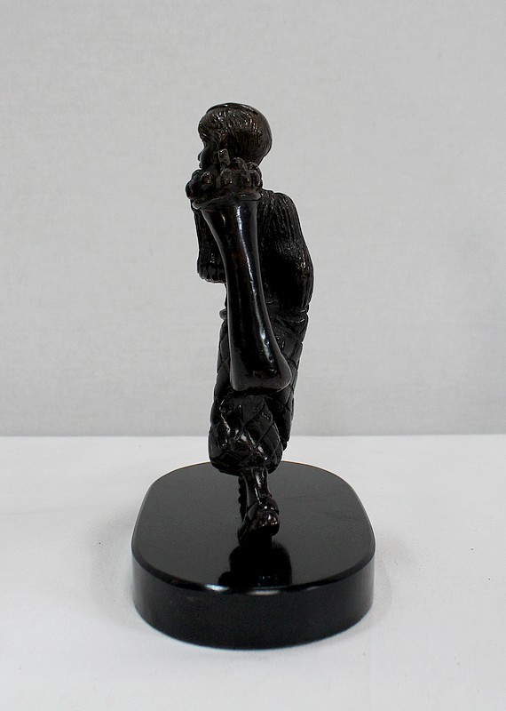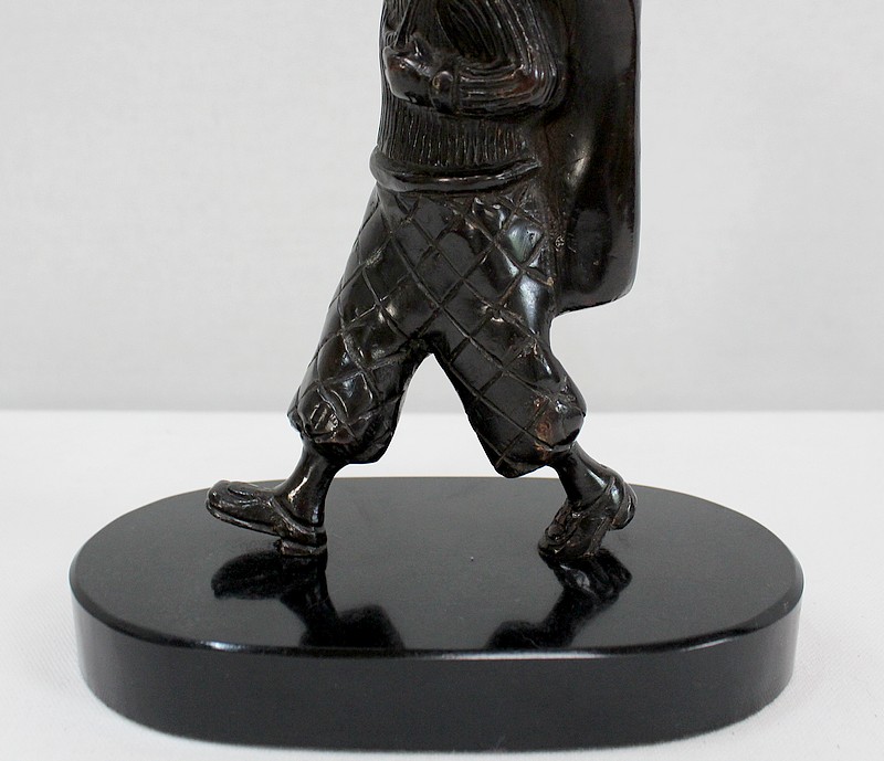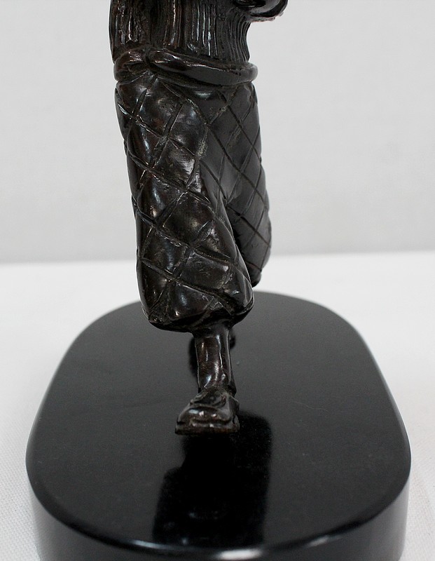 Bronze à Patine Brune sur Socle en Marbre Noir représentant un jeune Caddie portant le sac d’un Joueur de Golf.