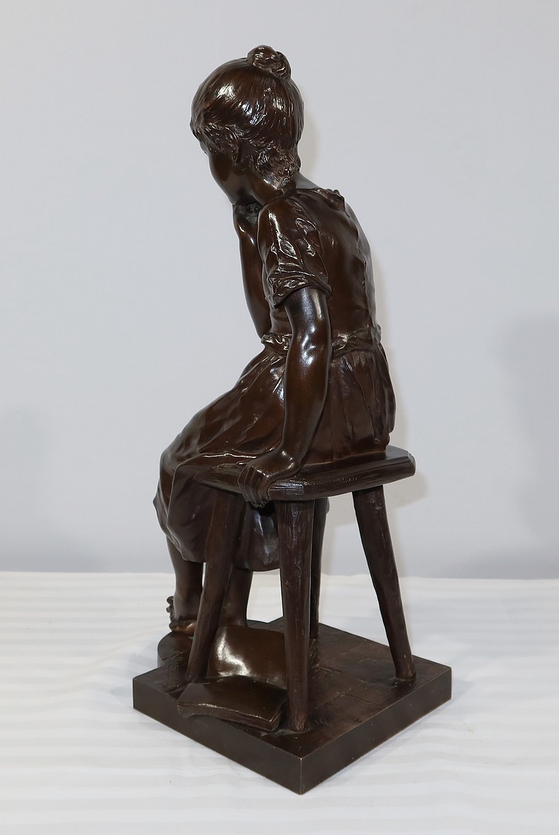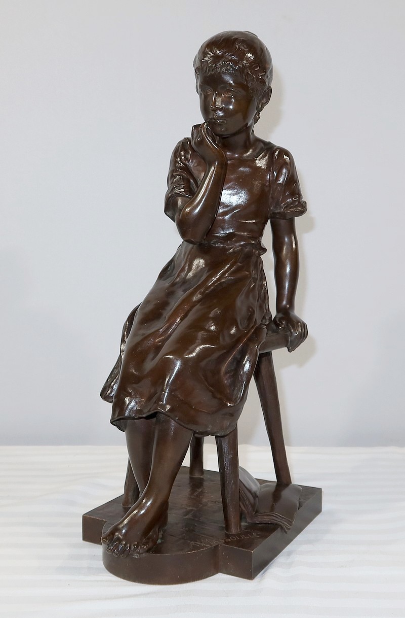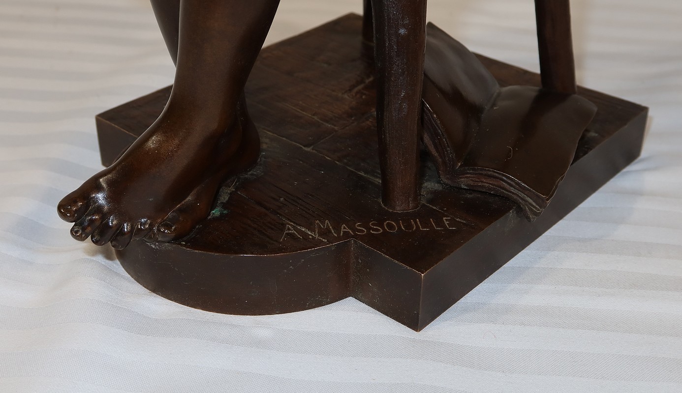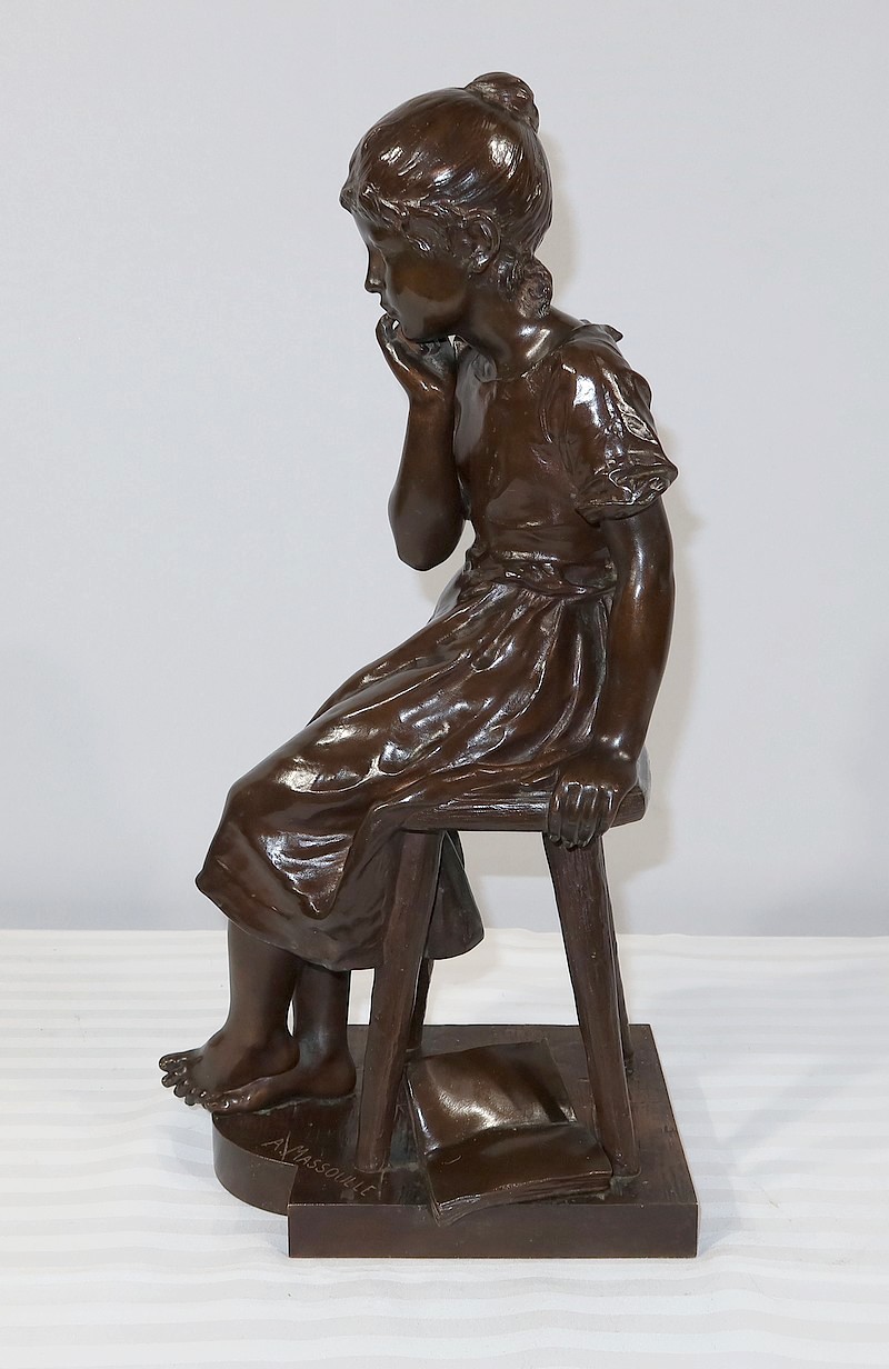 André Massoulle est un sculpteur français reconnu de la deuxième partie du XIXe siècle. Il choisit ici de représenter une jeune fille assise sur un tabouret. Vêtue d’une robe printanière et pieds nus, la jeune fille timide semble s’interroger, portant sa main droite près de sa bouche. Ses cheveux souples sont retenus grâce à un chignon simple, dégageant son visage enfantin. Sa main gauche est posée sur le tabouret. Elle semble avoir fait tomber le livre se situant à ses pieds.