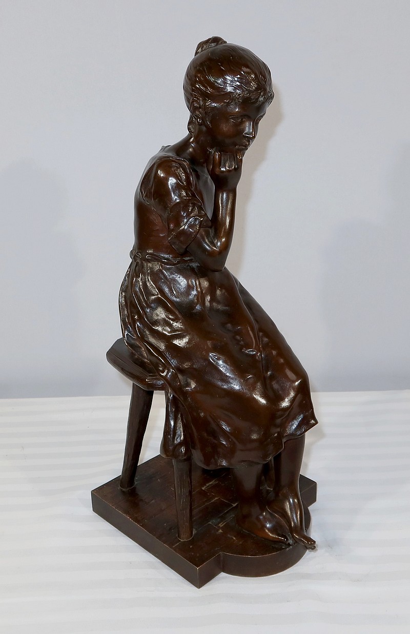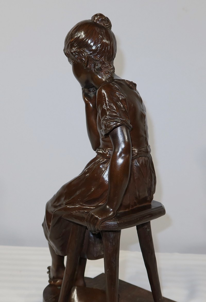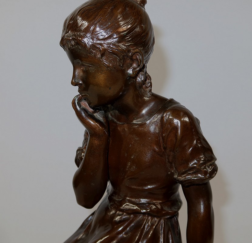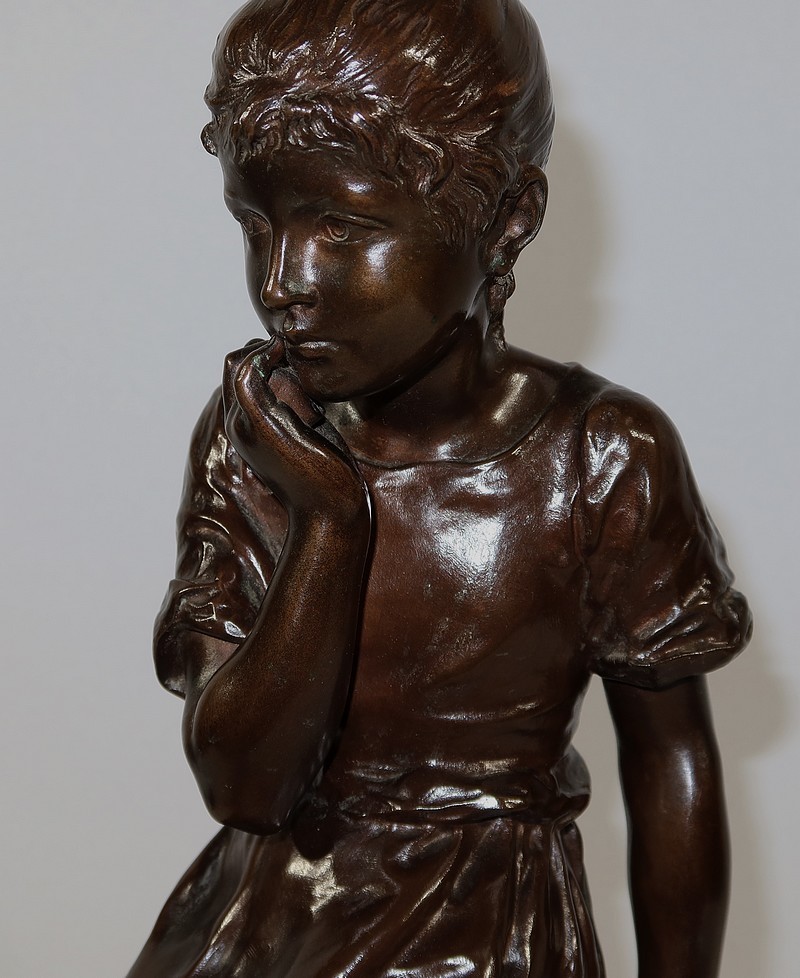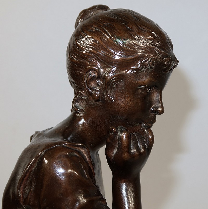 André Massoulle est un sculpteur français reconnu de la deuxième partie du XIXe siècle. Il choisit ici de représenter une jeune fille assise sur un tabouret. Vêtue d’une robe printanière et pieds nus, la jeune fille timide semble s’interroger, portant sa main droite près de sa bouche. Ses cheveux souples sont retenus grâce à un chignon simple, dégageant son visage enfantin. Sa main gauche est posée sur le tabouret. Elle semble avoir fait tomber le livre se situant à ses pieds.