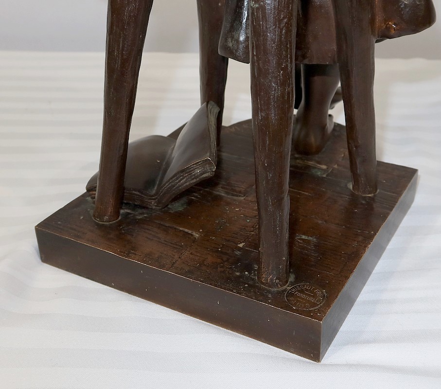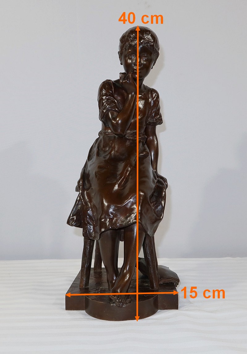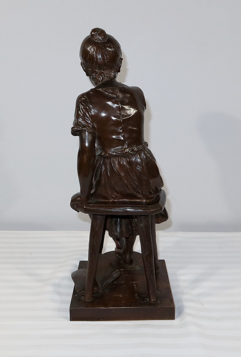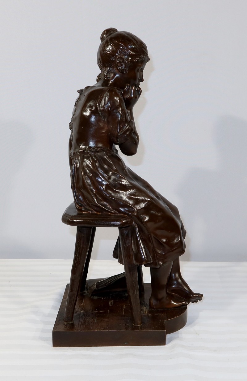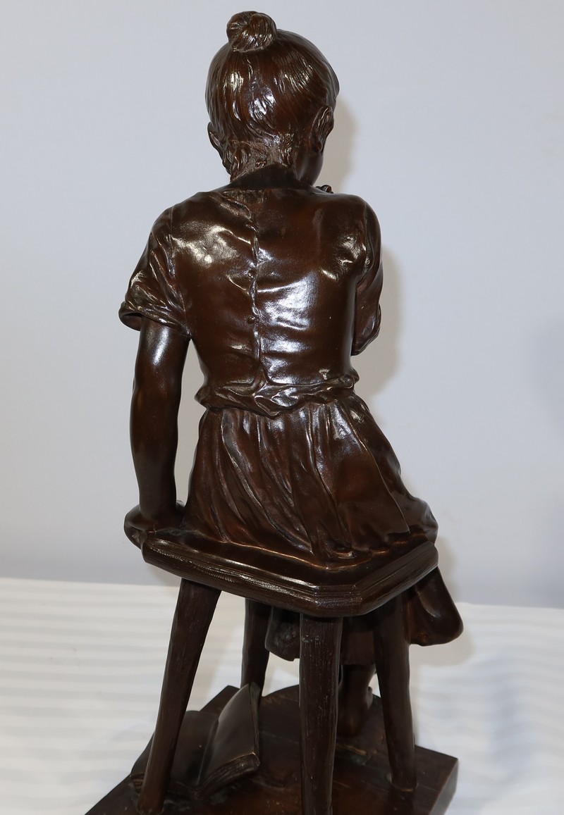 André Massoulle est un sculpteur français reconnu de la deuxième partie du XIXe siècle. Il choisit ici de représenter une jeune fille assise sur un tabouret. Vêtue d’une robe printanière et pieds nus, la jeune fille timide semble s’interroger, portant sa main droite près de sa bouche. Ses cheveux souples sont retenus grâce à un chignon simple, dégageant son visage enfantin. Sa main gauche est posée sur le tabouret. Elle semble avoir fait tomber le livre se situant à ses pieds.