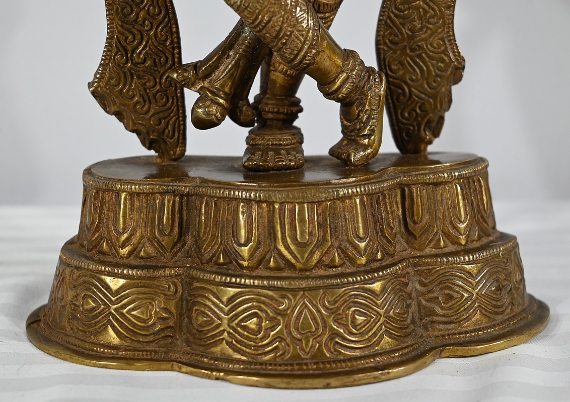 Krishna est représenté debout sur son autel, les jambes croisées, jouant de sa flute à tête d’éléphant. Ce sujet, intégralement ciselé de motifs indiens, repose sur une base mouvementée également ouvragée.