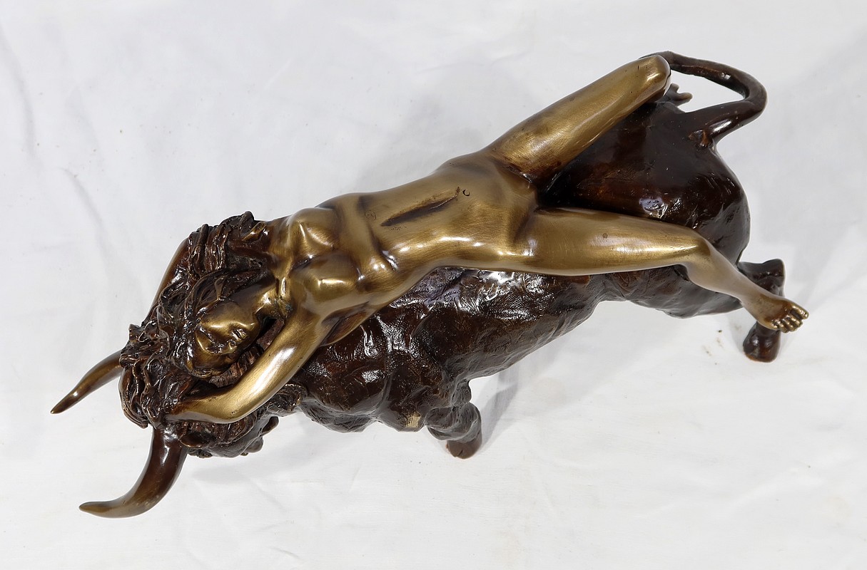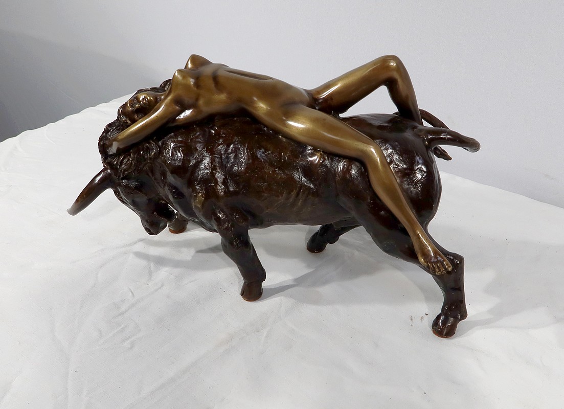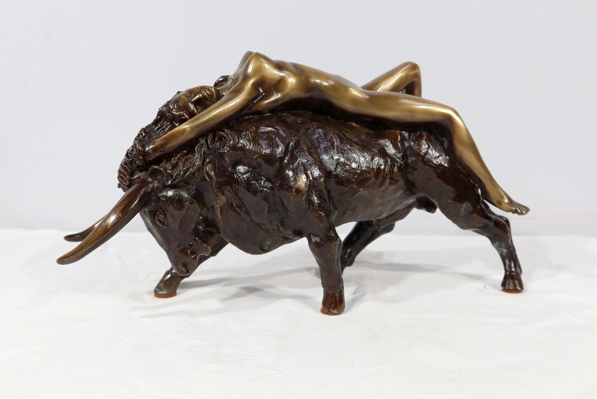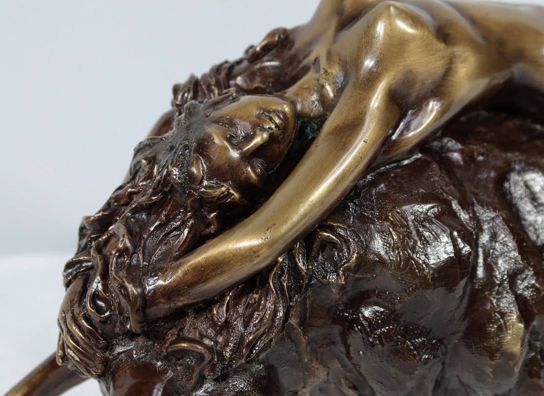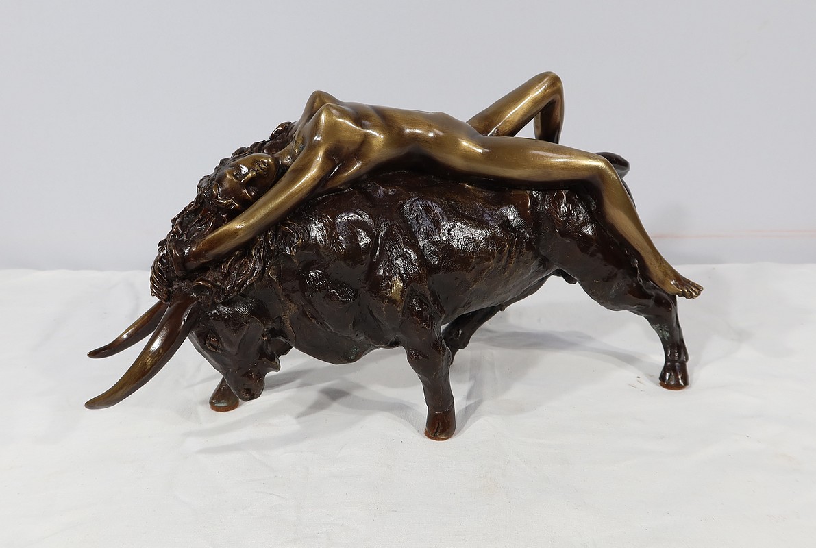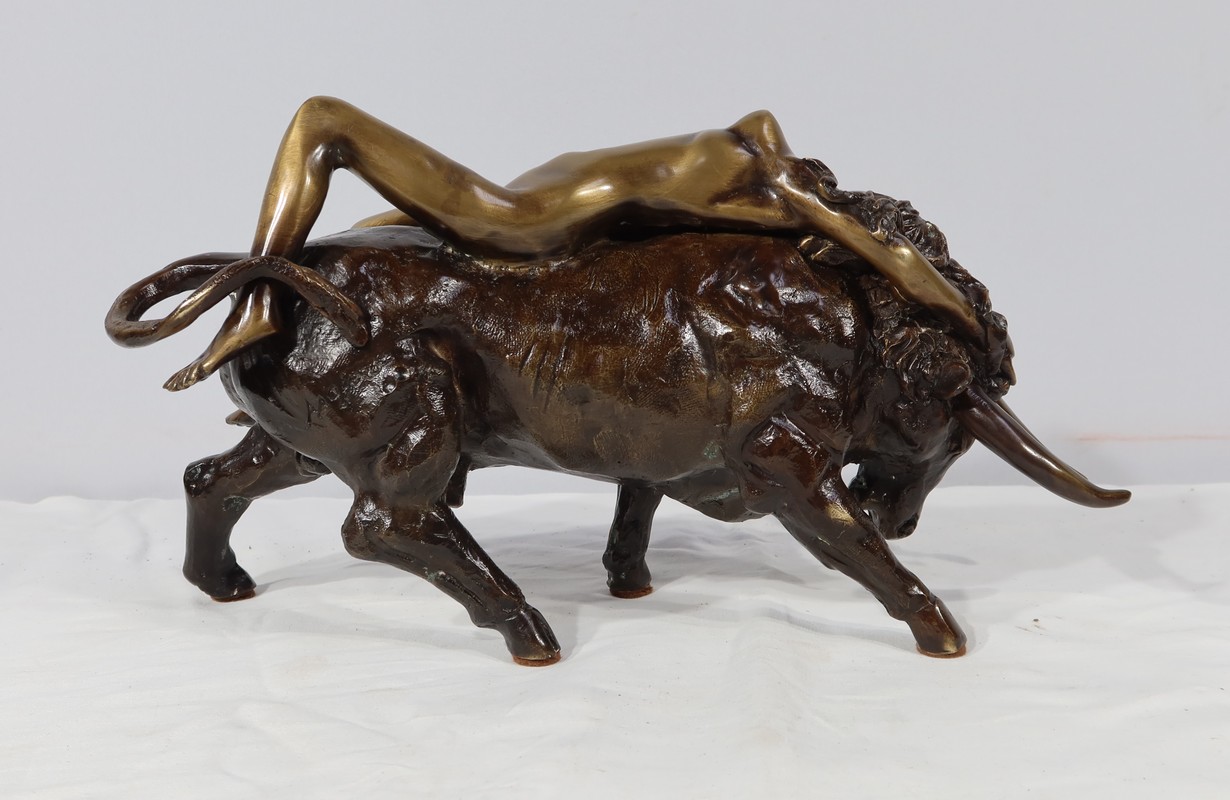 Ayant une forte symbolique, le Taureau, la tête basse reflète ici toute sa force et sa vitalité. Europe, lascive et souriante, est étendue attendant la transformation de son amant.