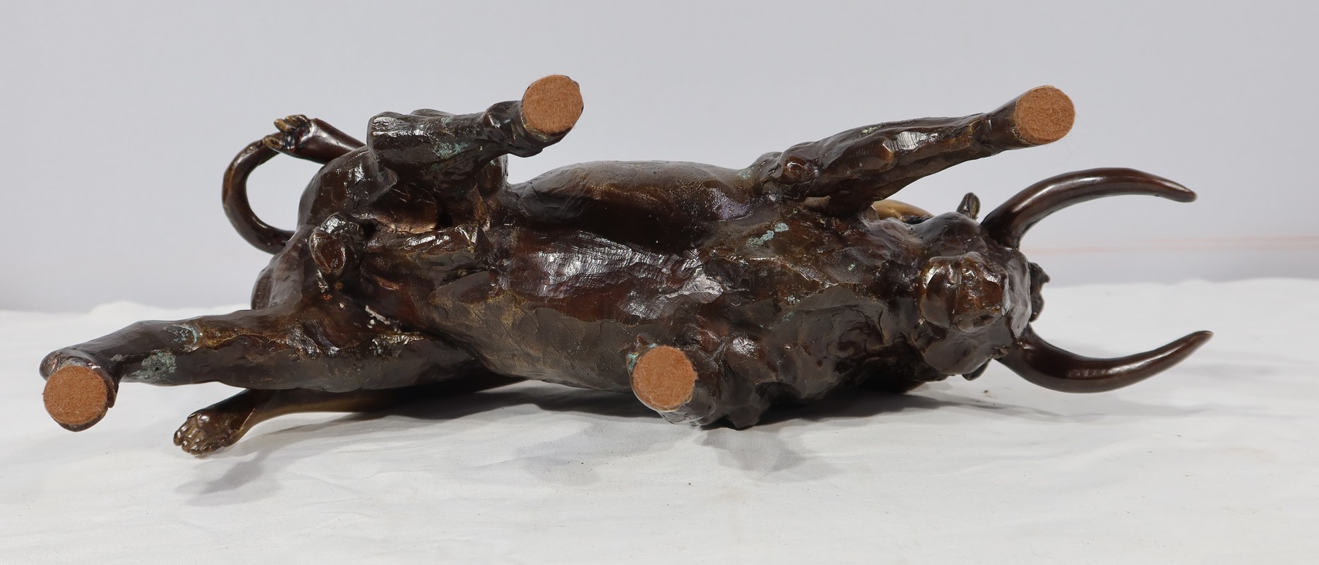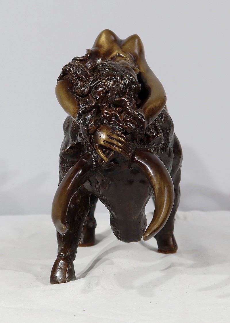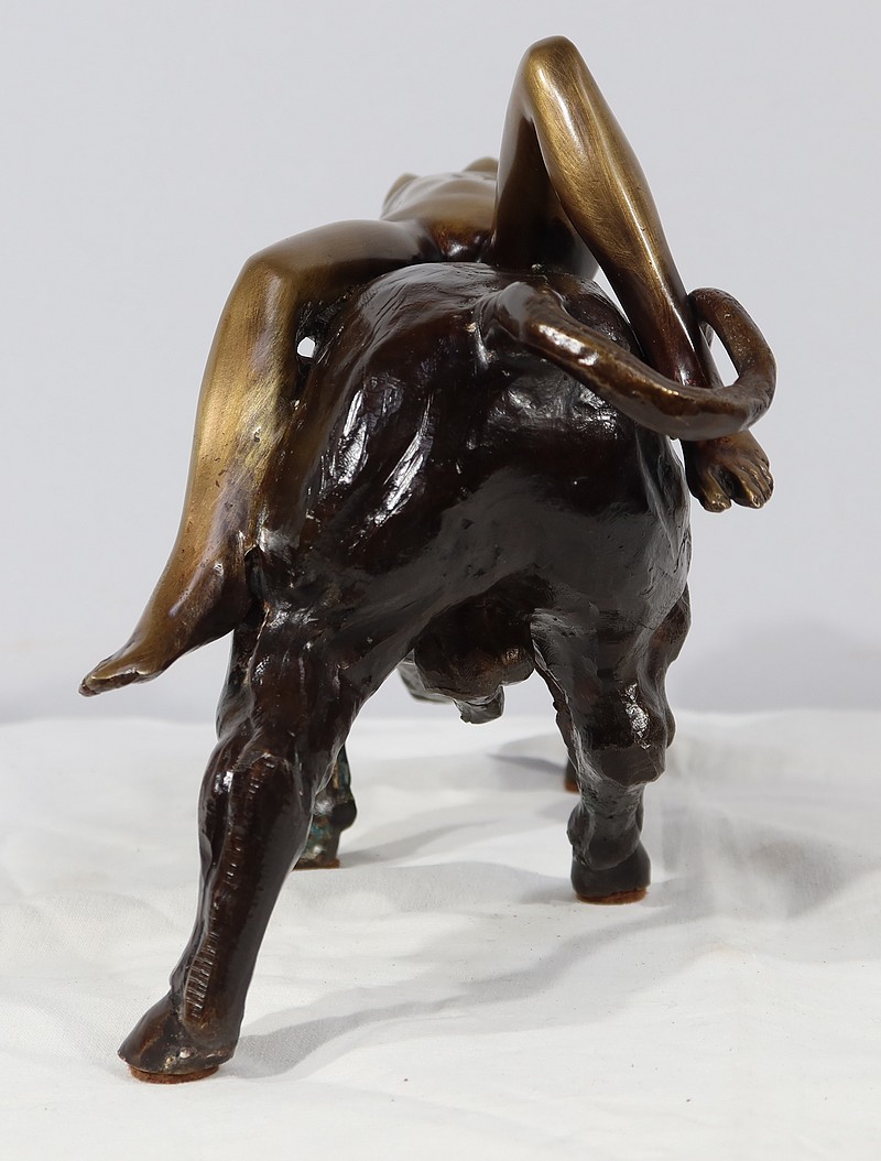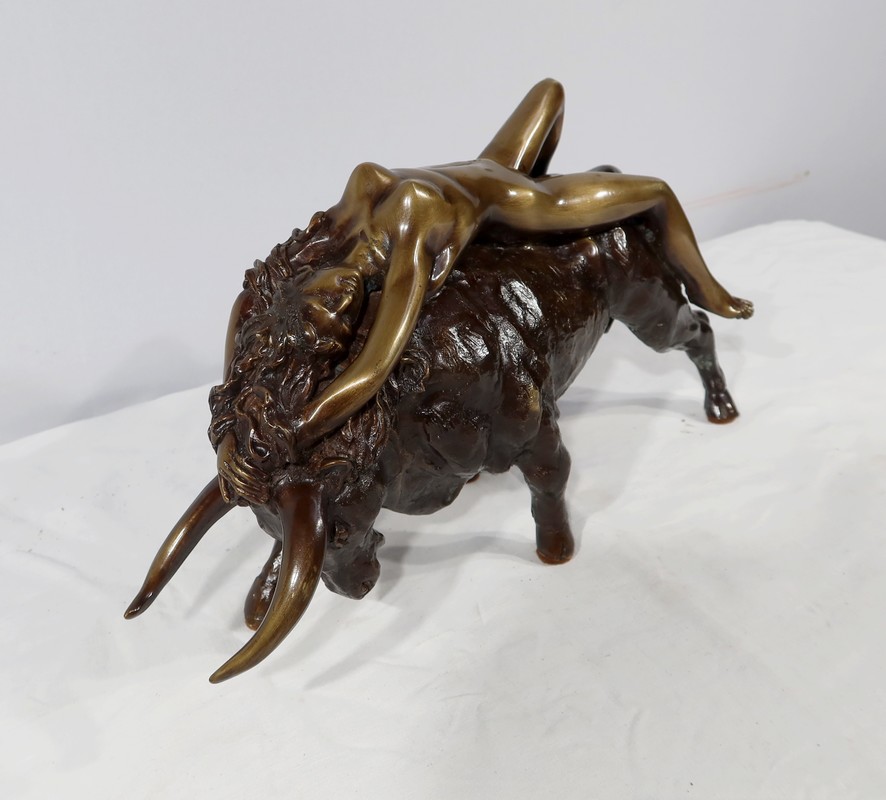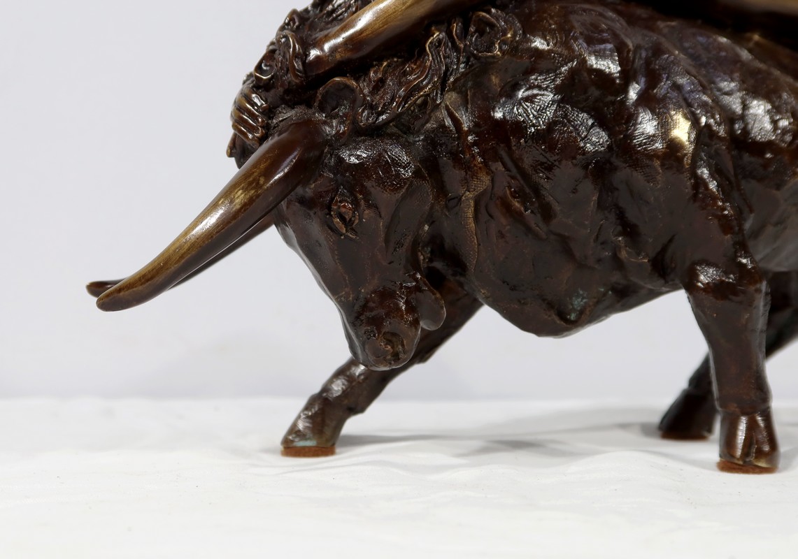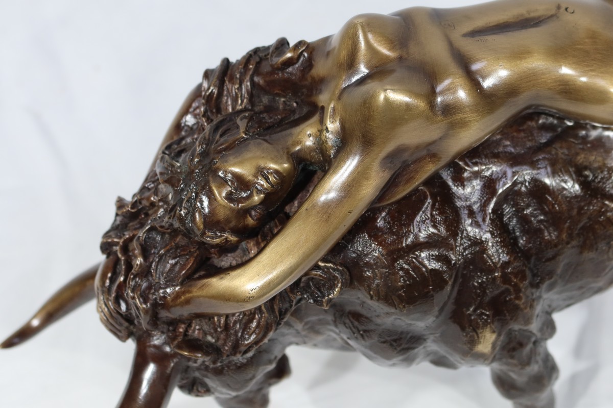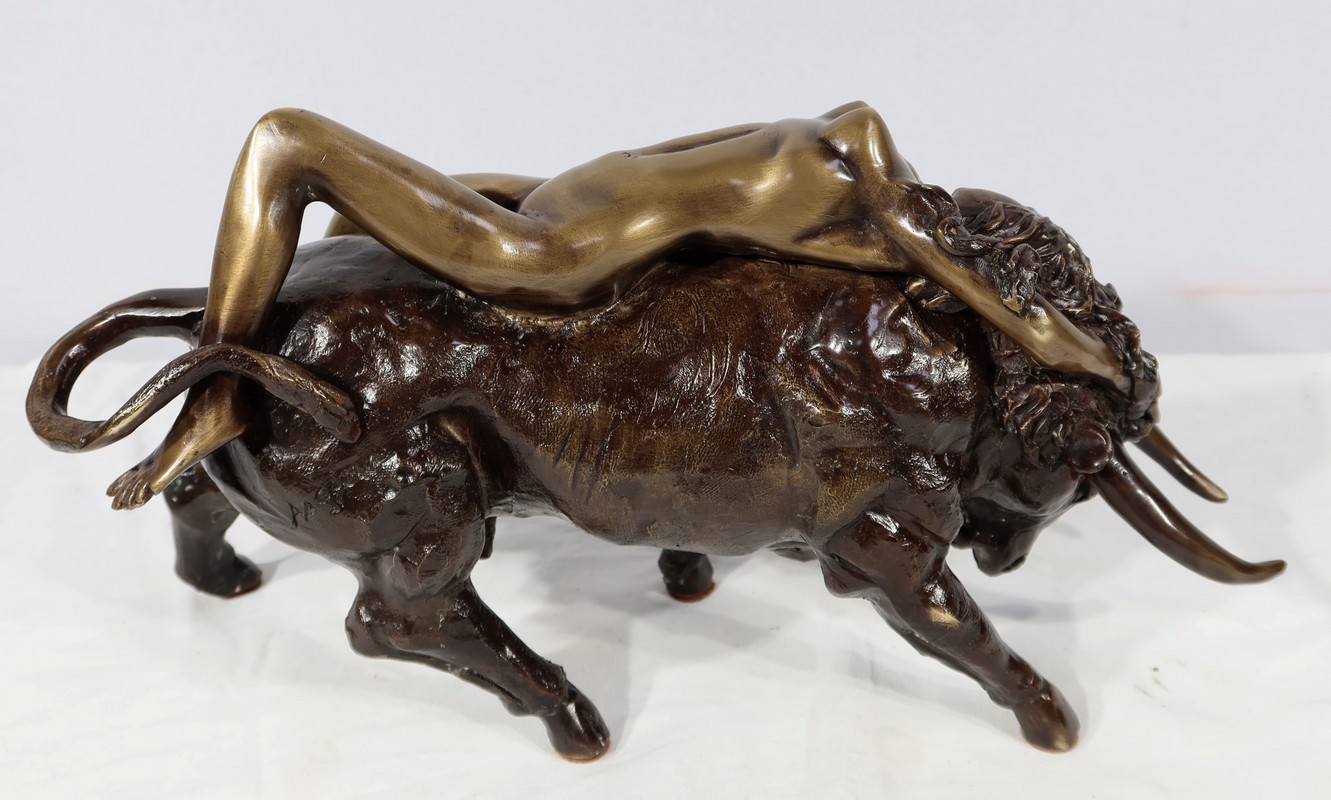 Ayant une forte symbolique, le Taureau, la tête basse reflète ici toute sa force et sa vitalité. Europe, lascive et souriante, est étendue attendant la transformation de son amant.