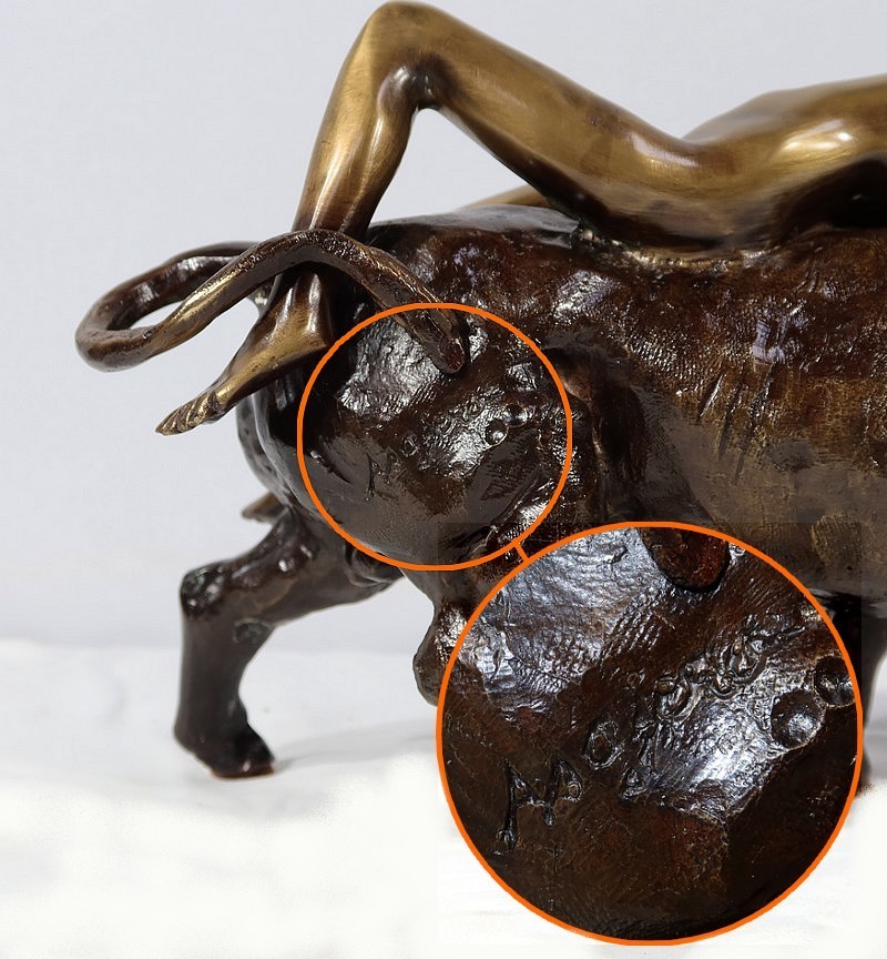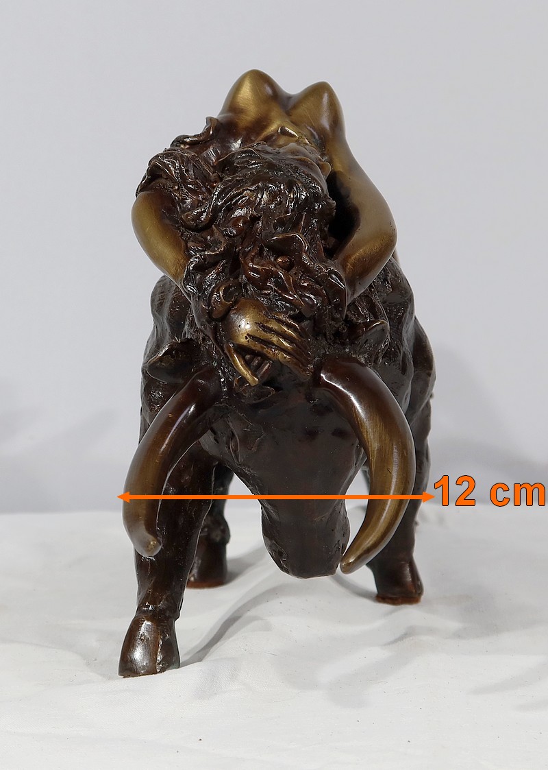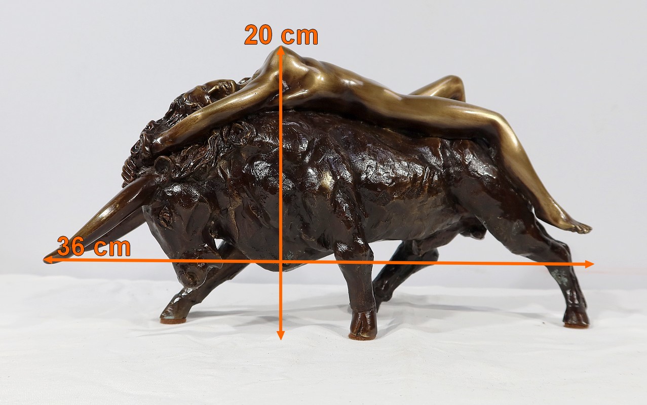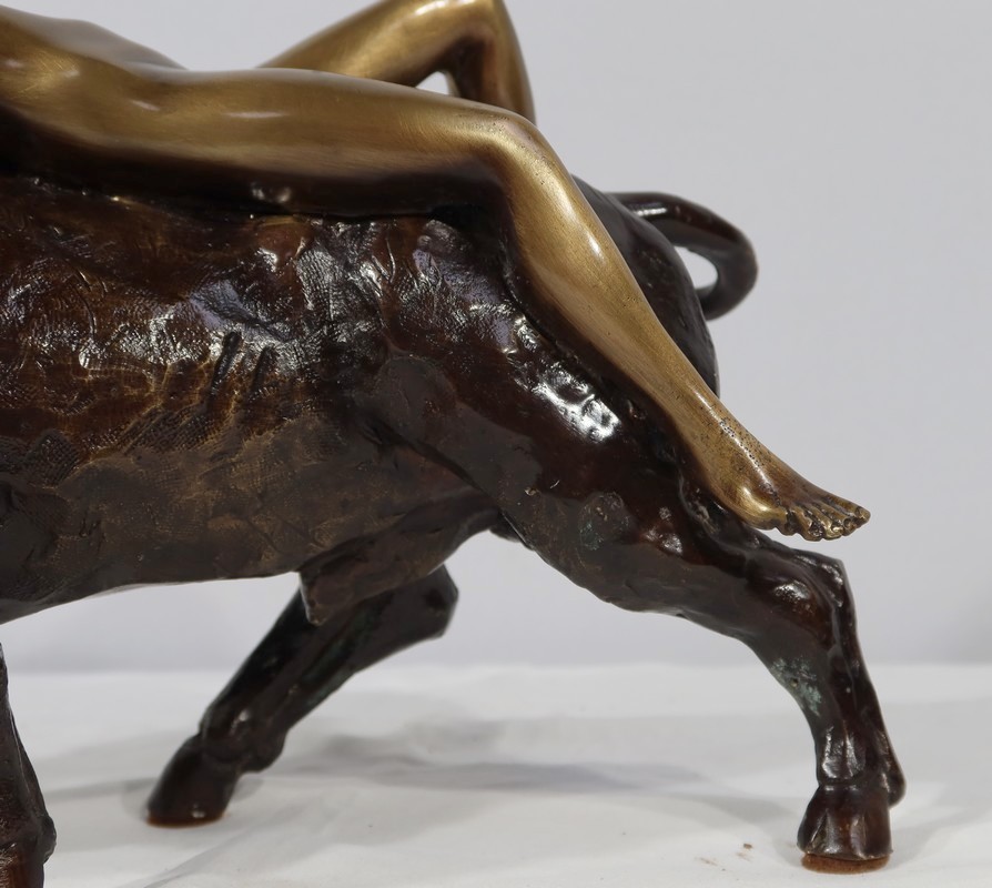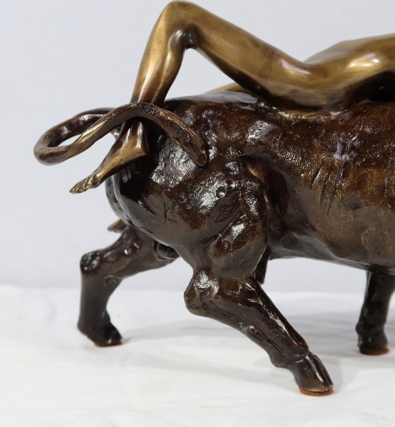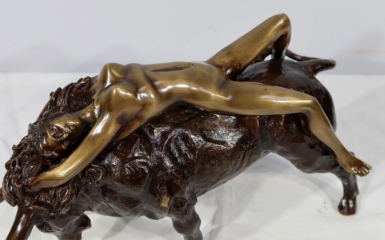 Épreuve en bronze à patine brune et patine médaille signé Majera. Cette œuvre puissante issue de la mythologie grecque, figure la déesse Europe nue, allongée sur un Taureau. Fille du roi de Tyr, Europe est enlevée par Zeus métamorphosé en Taureau afin de ne pas être reconnu.