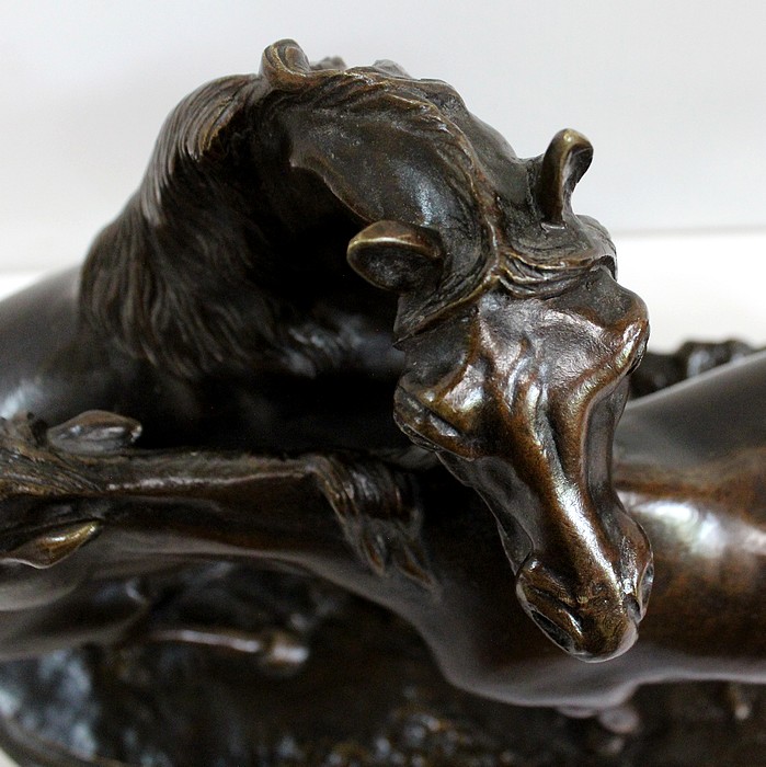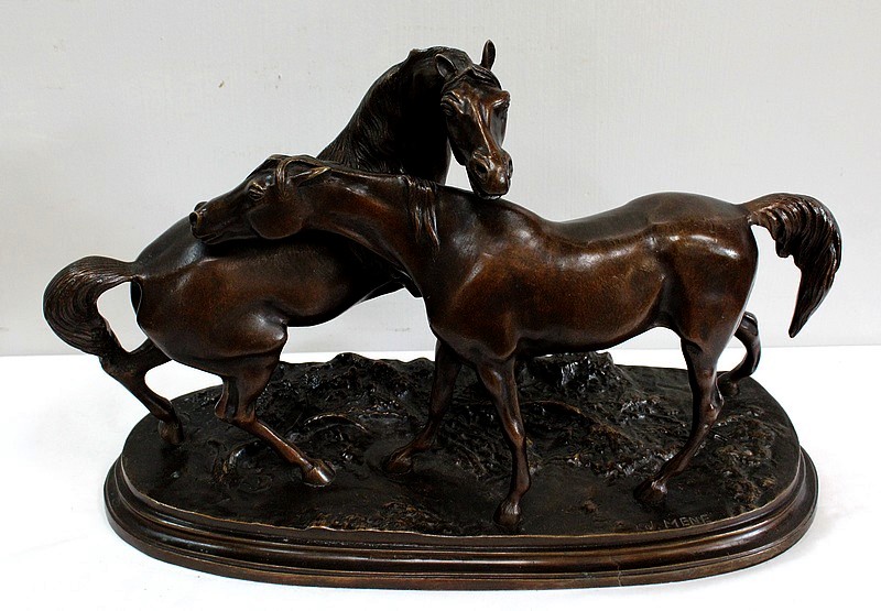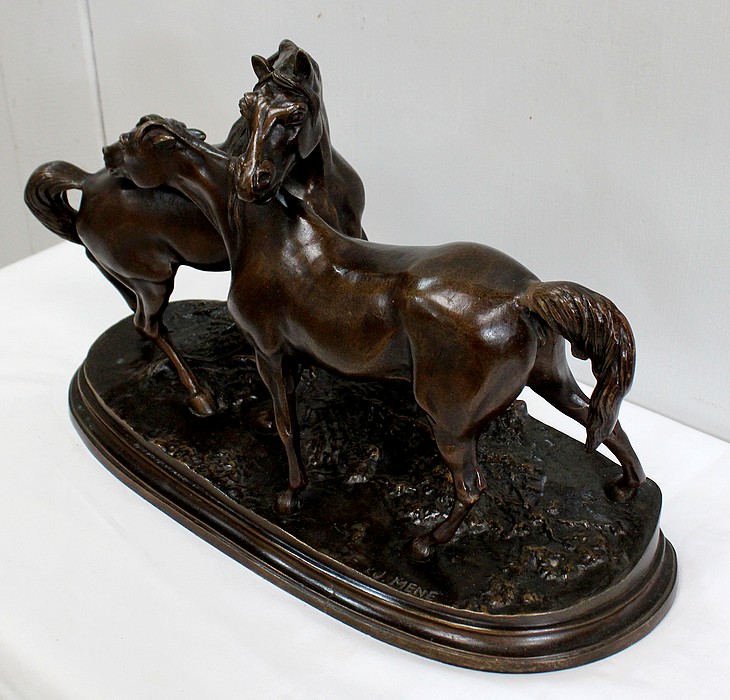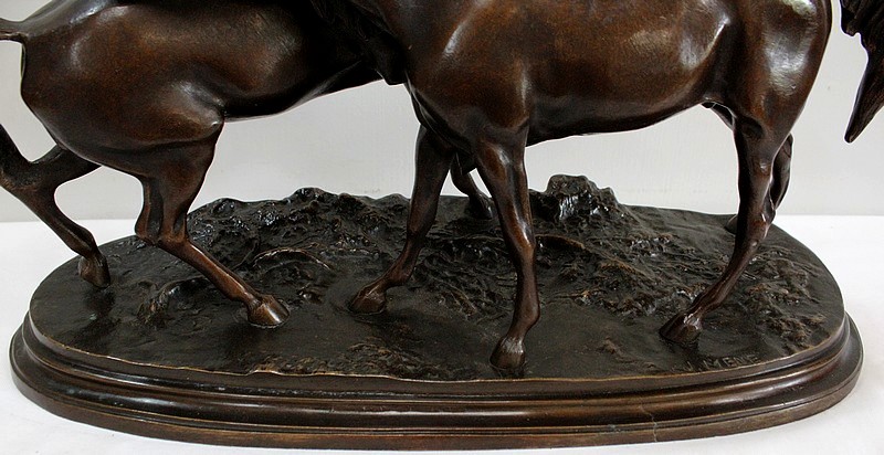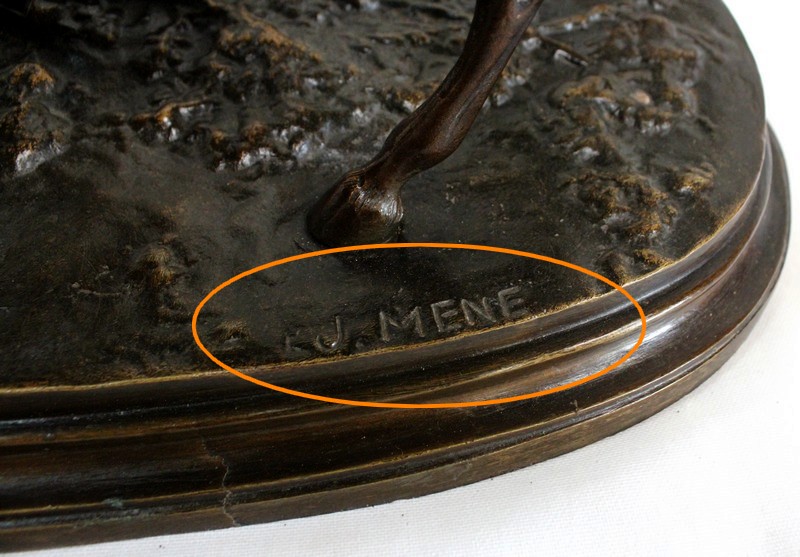 L’Ensemble repose sur une terrasse où nous retrouvons la Signature « J. MENE », Artiste considéré comme un des principaux représentants de la Sculpture Animalière au XIXe siècle.