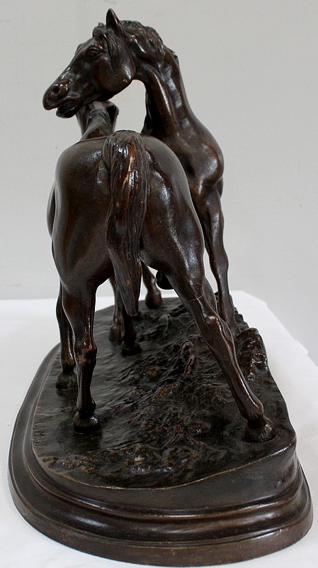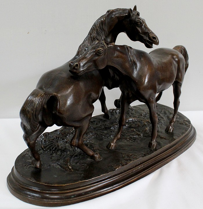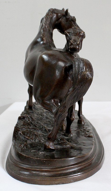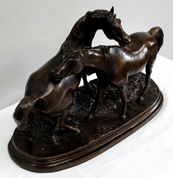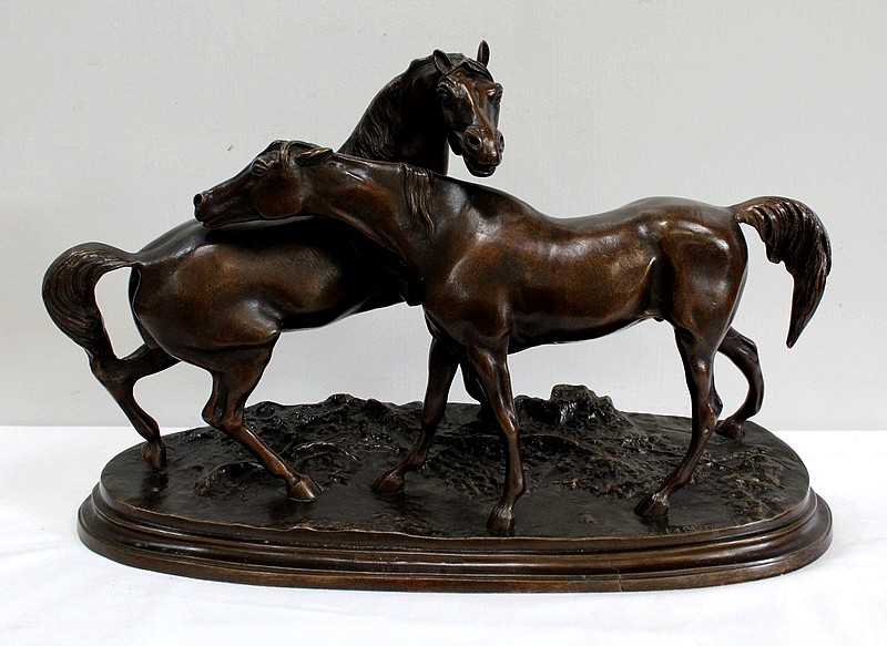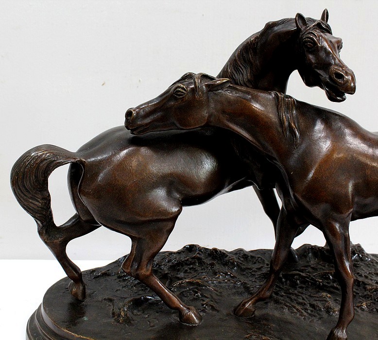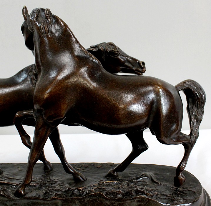 Présentée au Salon de 1852, la cire originale de ce Modèle portait le titre « Tachiani et Nedjebé, chevaux arabes ». L’Artiste représente la parade amoureuse de deux chevaux venus d’Algérie, l’étalon Tachiani et de la jument Nedjébé.