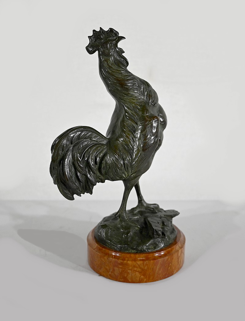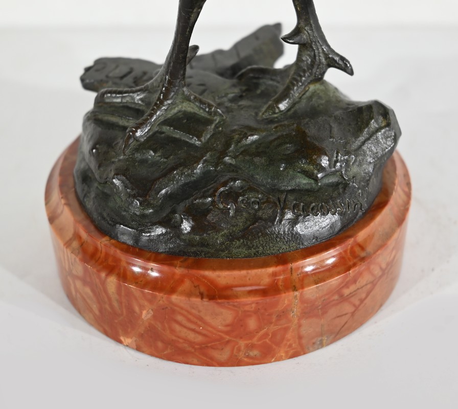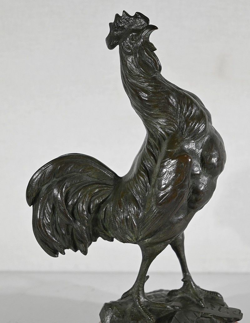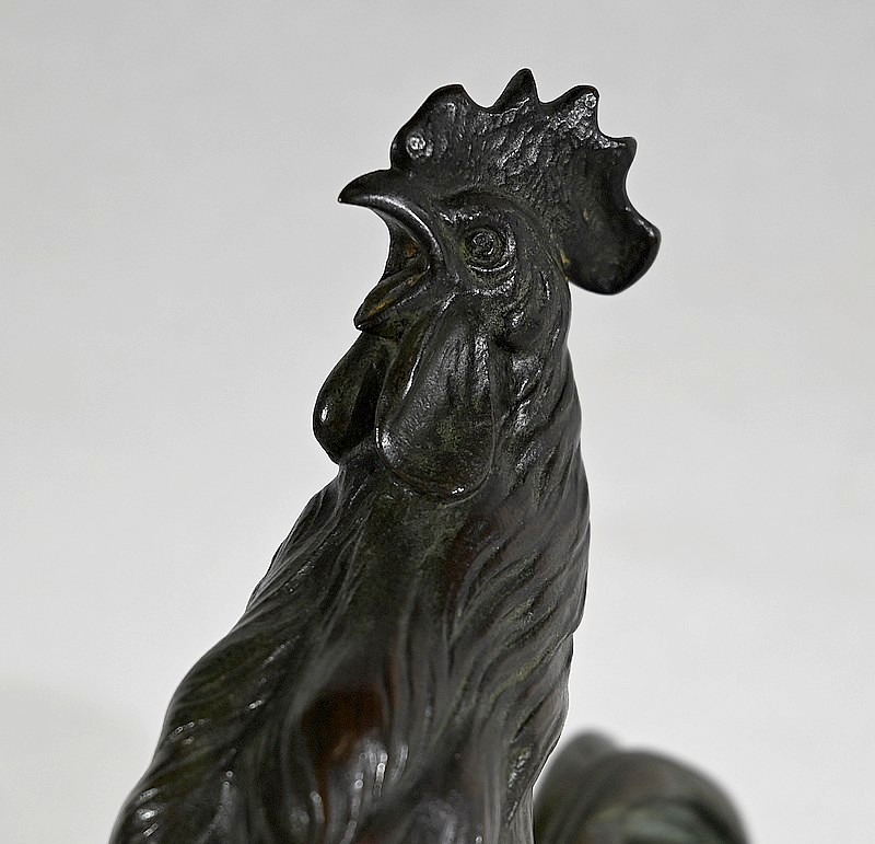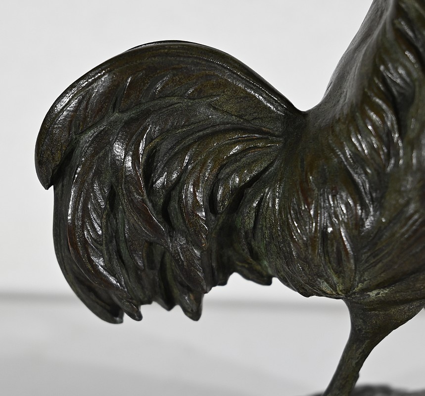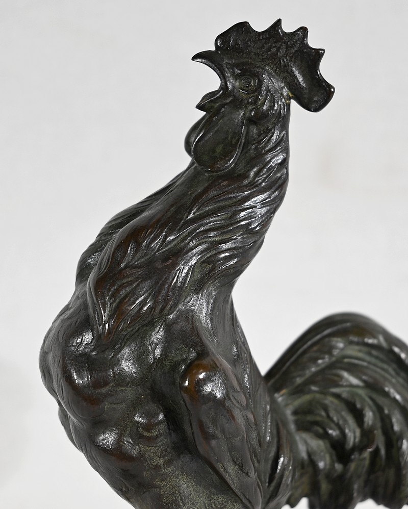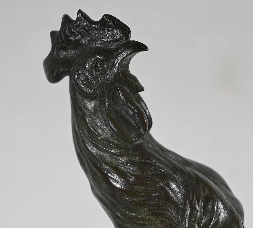Sculpture en Bronze à patine verte représentant un coq chantant, signé Géo Vacossin et portant le cachet « Fumière et Cie Suce. Thiebaut Paris ».